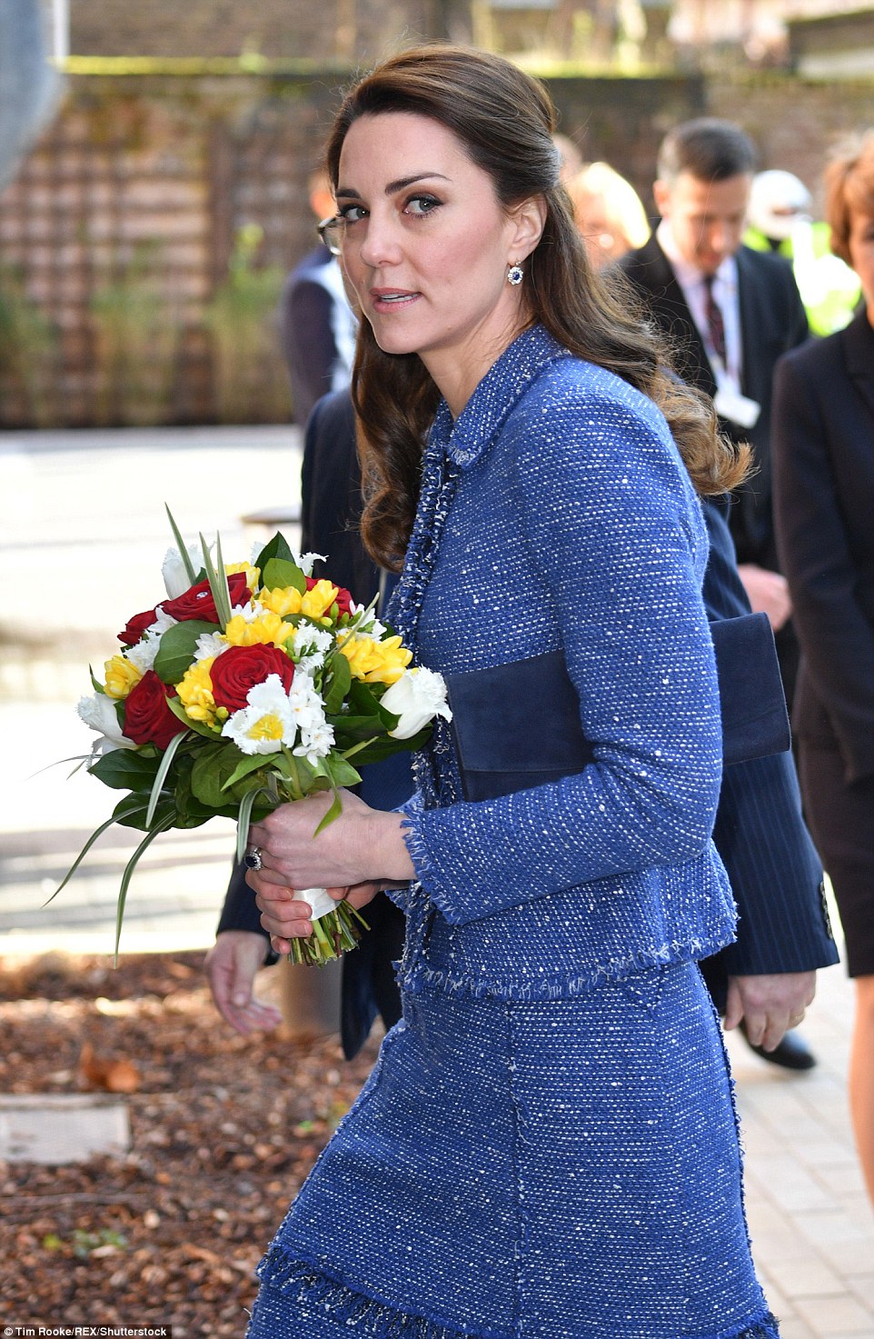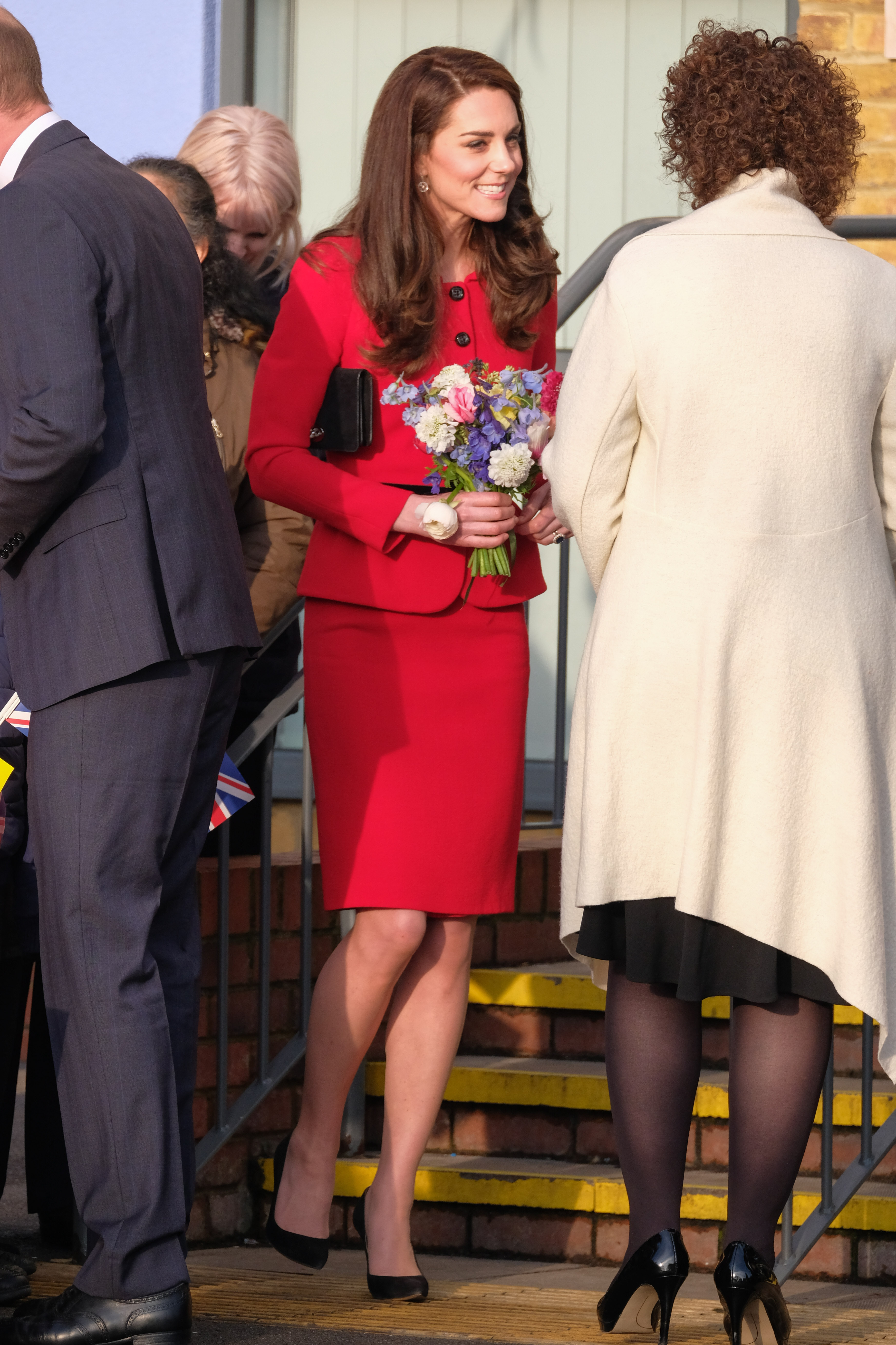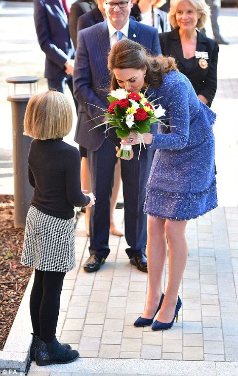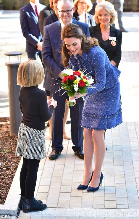 The 35-year-old Duchess of Cambridge was greeted with a bouquet of flowers as she arrived at MIST, the child and adolescent mental health project part of Action for Children in Pontypool, United Kingdom.