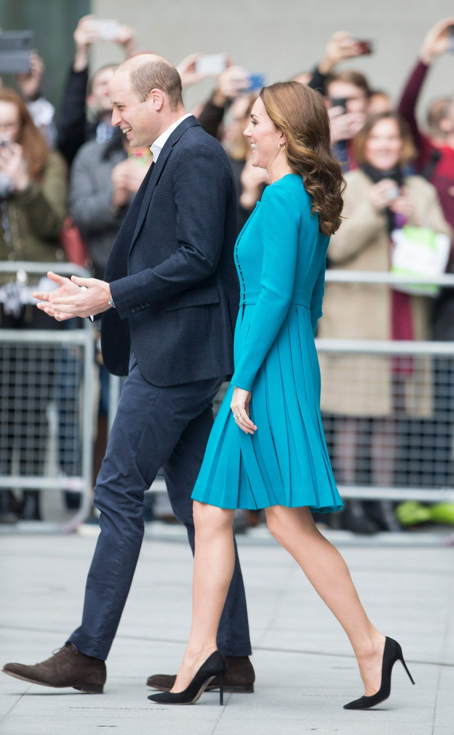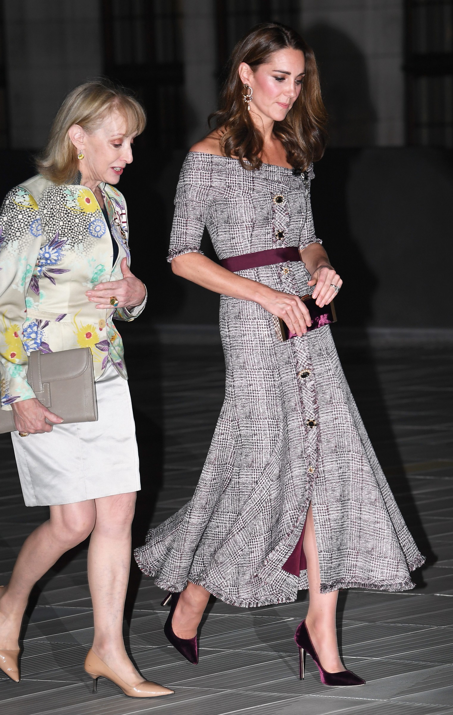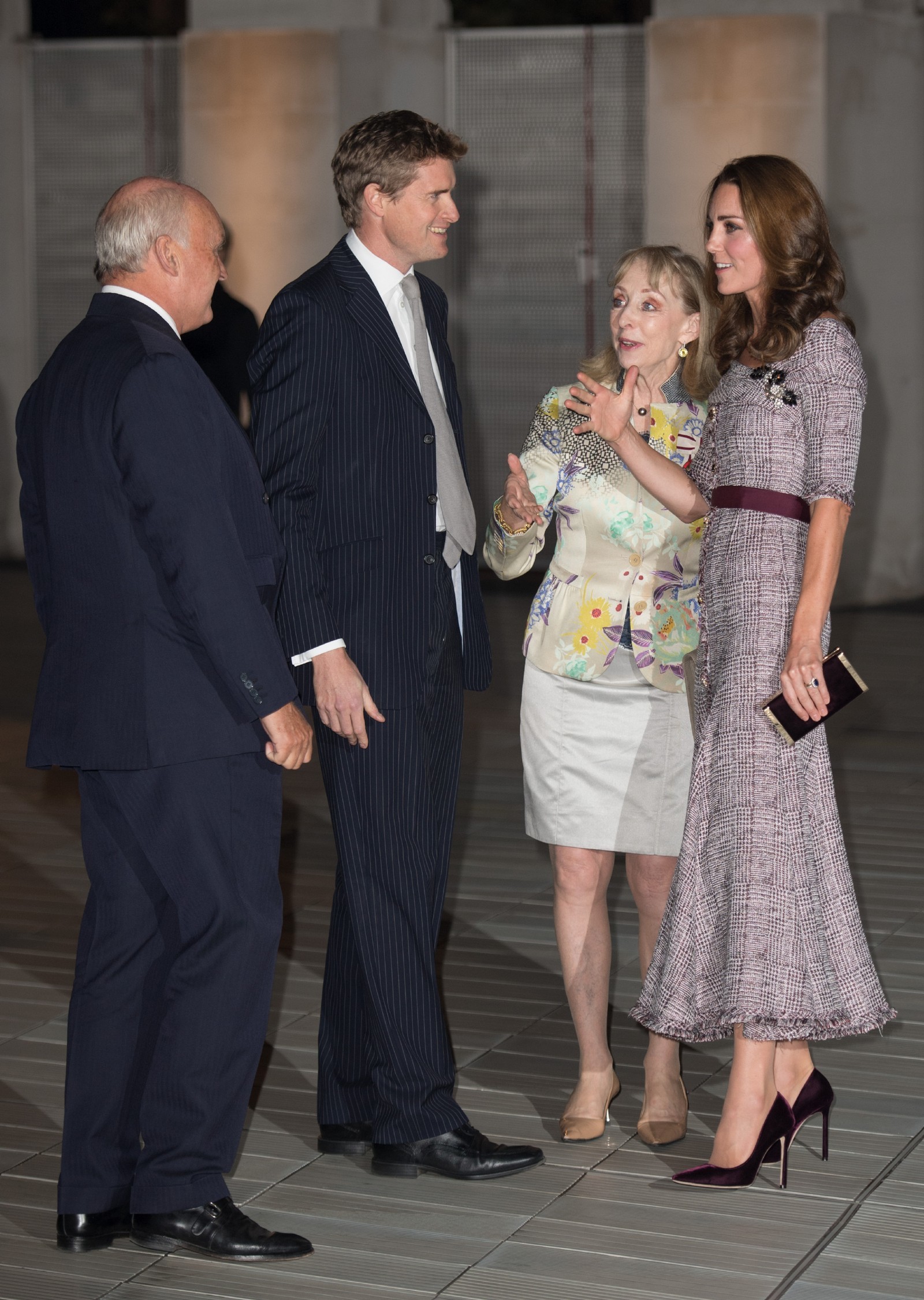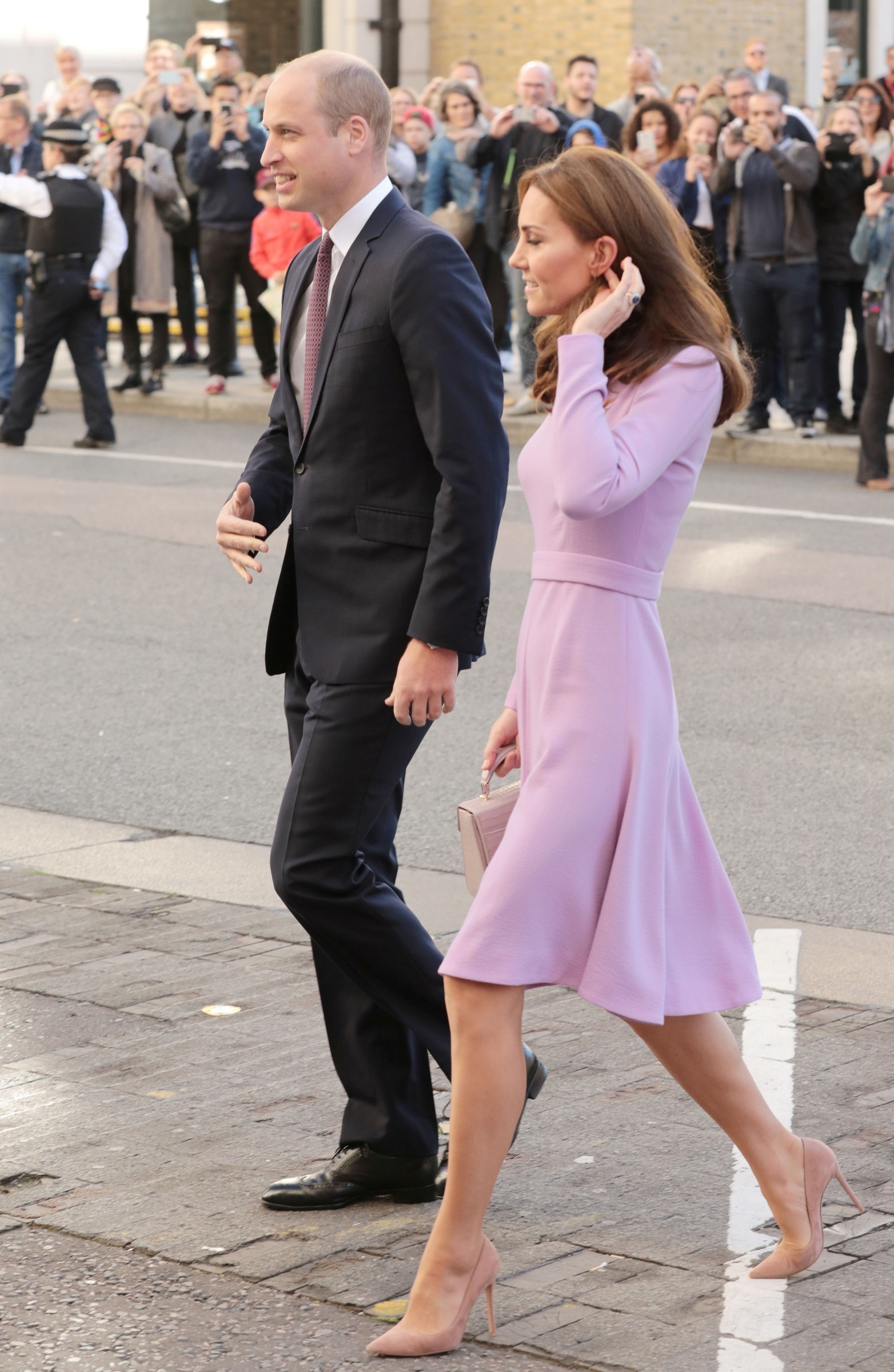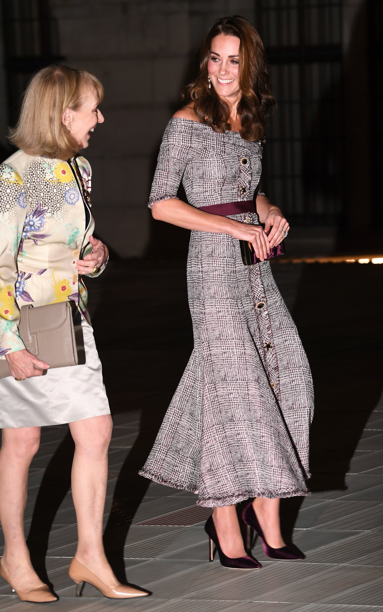 the Duchess is wearing a Jenny Packham dress, Gianvito Rossi pumps, and a Mulberry clutch.