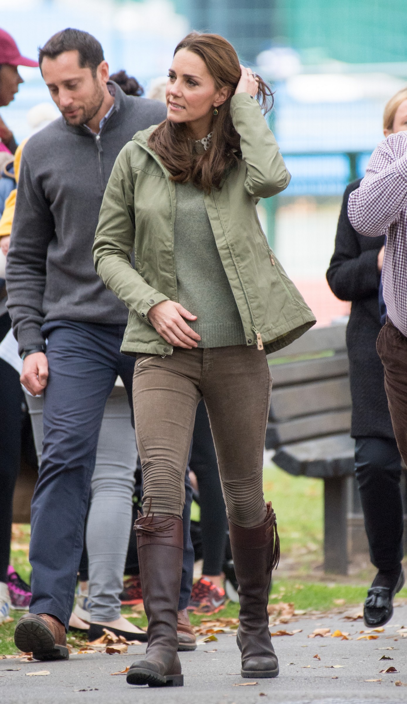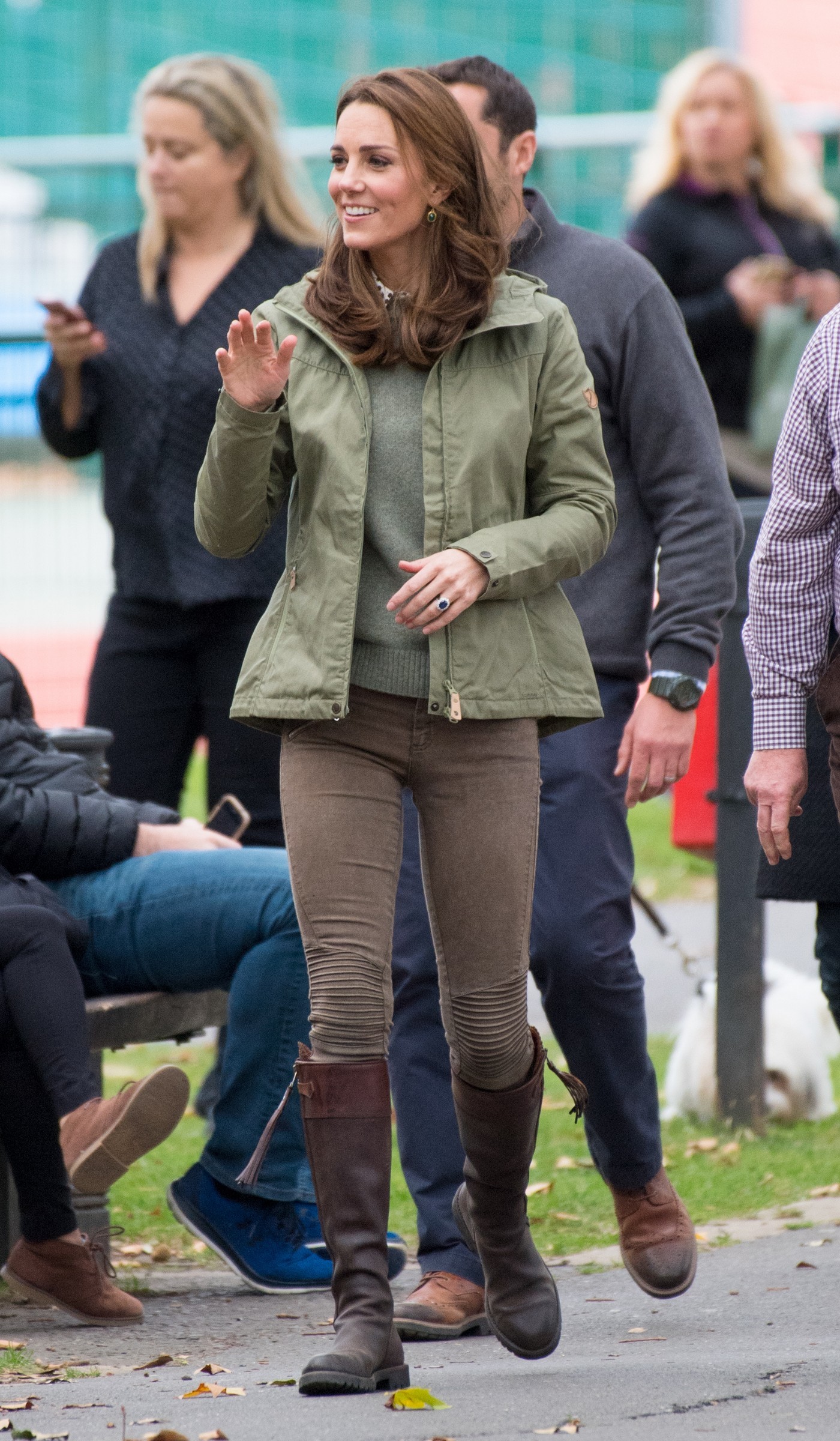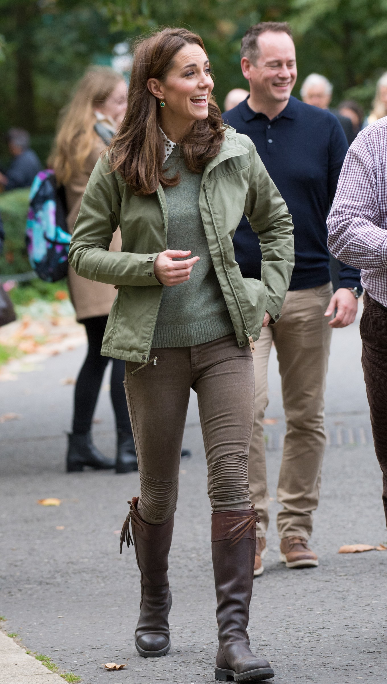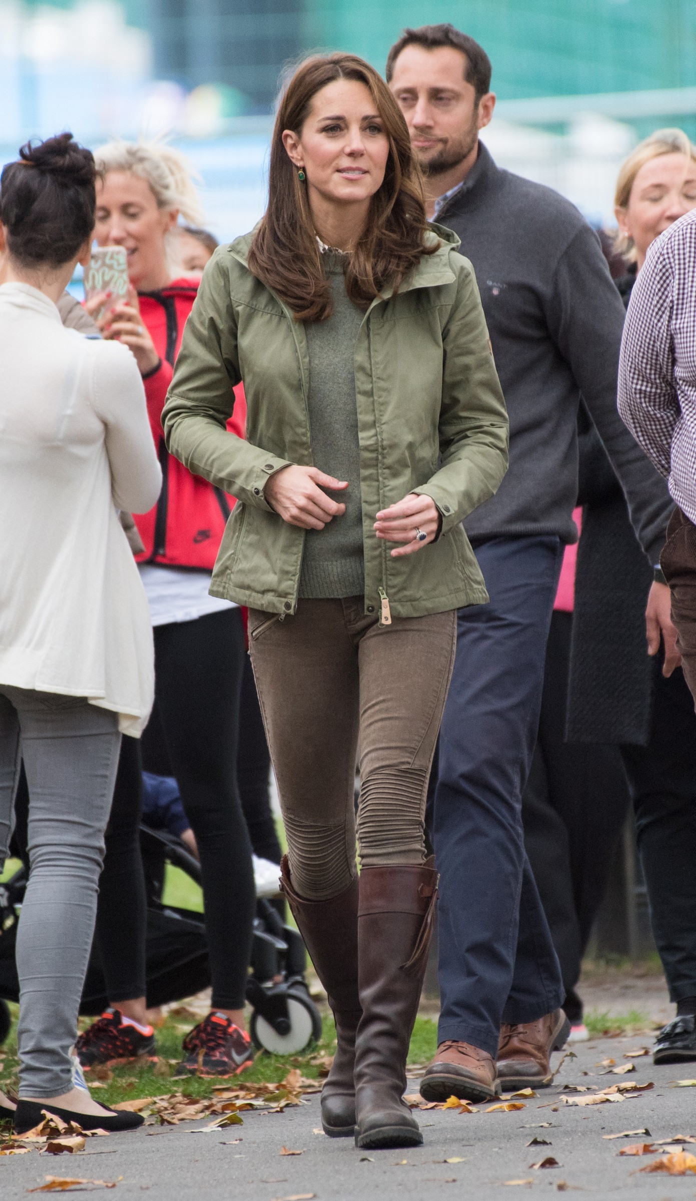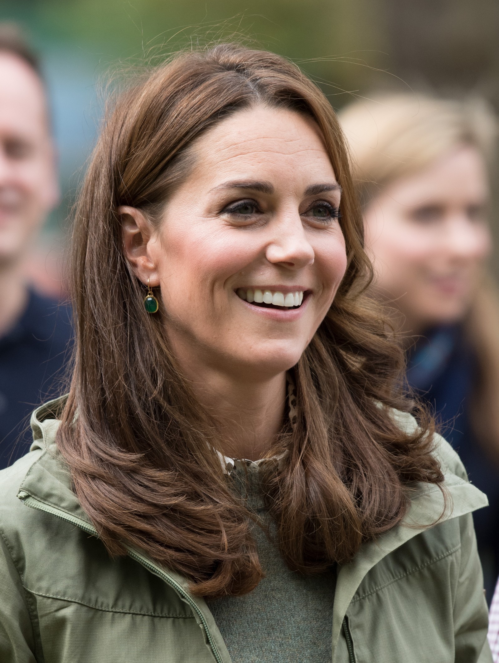 the Duchess is wearing a Jenny Packham dress, Gianvito Rossi pumps, and a Mulberry clutch.