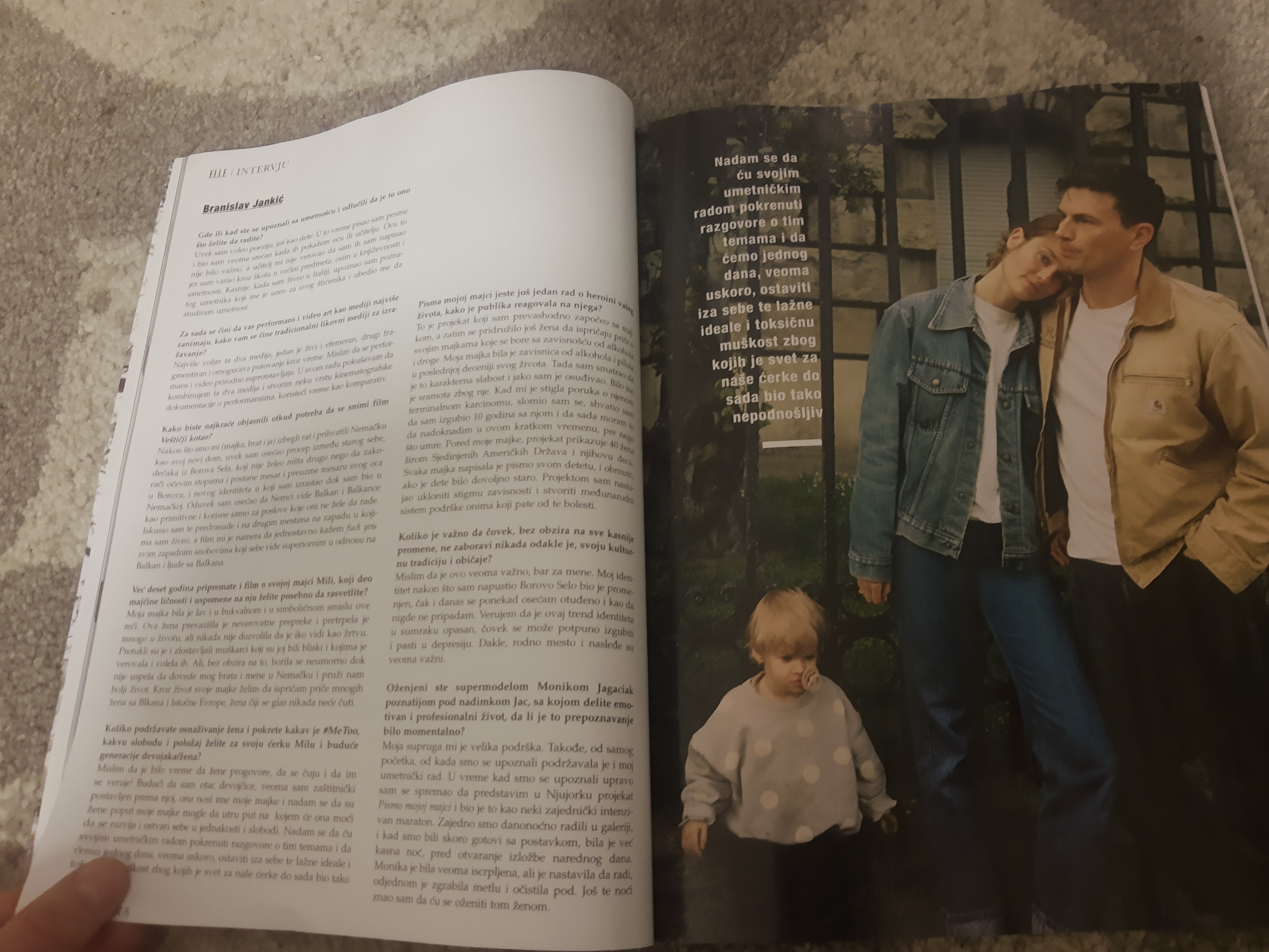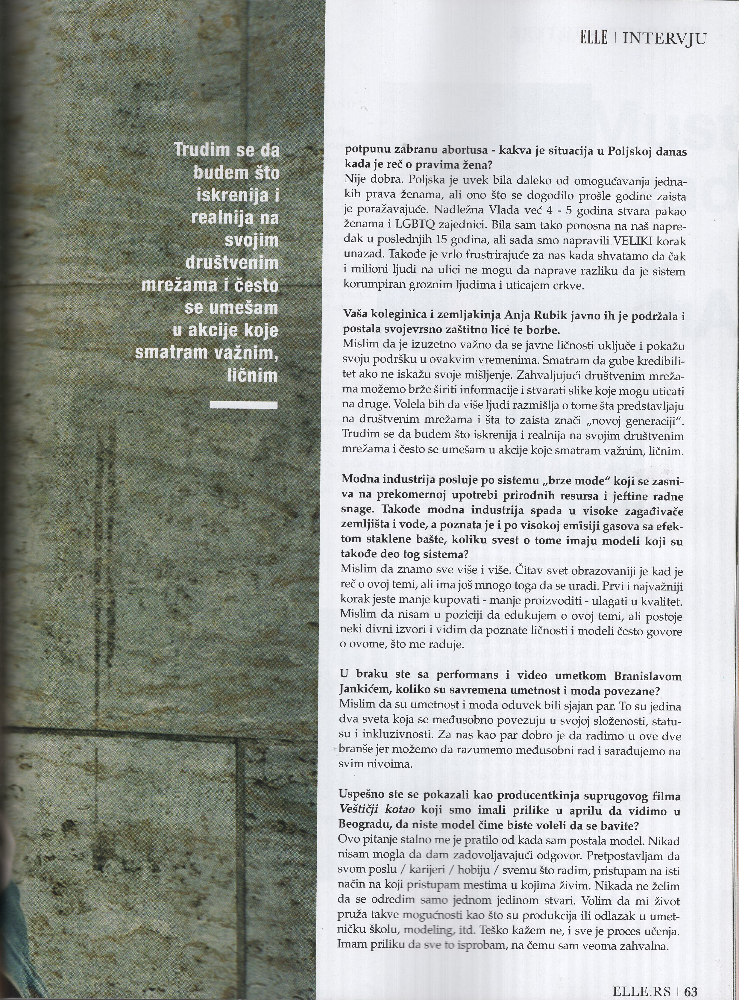 "Branislav Jankic records fi1-move, makes sculptures and re-performances that explore the accuracy of redemption. The Belgrade Pusika had the opportunity to meet this blue boy from Borovo Se1 only last April during the screening of his experimental documentary Vesticji kotao. For his artistic work, he draws inspiration from his personal history, from all the conflicts and traumas he survived as a displaced person from the former Yugoslavia. MonikaJaga-ciakJankic is a supermodel from the cities of Poznan and Poland, known to the world fashion industry by the nickname Jas, and even more famous by the fact that already as a fifteen-year-old she had a trin-six cover of the world's most important fashion magazines. E11eje got an exclusive opportunity to meet these two young inspirational people and talk to them about art, fashion, women's rights, roots, family and belonging.