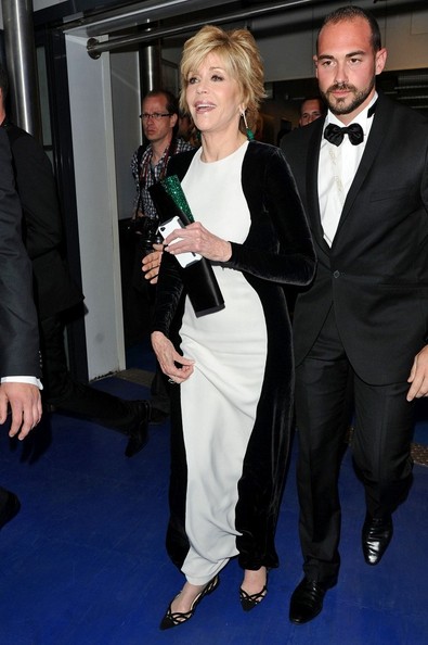 Jane Fonda also attended the Rust and Bone premiere, arriving in the evening equivalent of the Stella McCartney dress that won Kate Winslet new fashion fans some months ago. The actress complemented her very streamlined gown with green accents: Chopard emerald drop earrings and a Roger Vivier clutch.