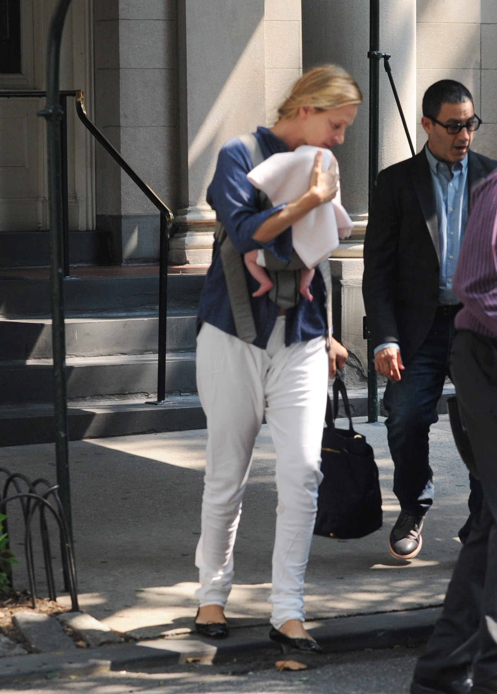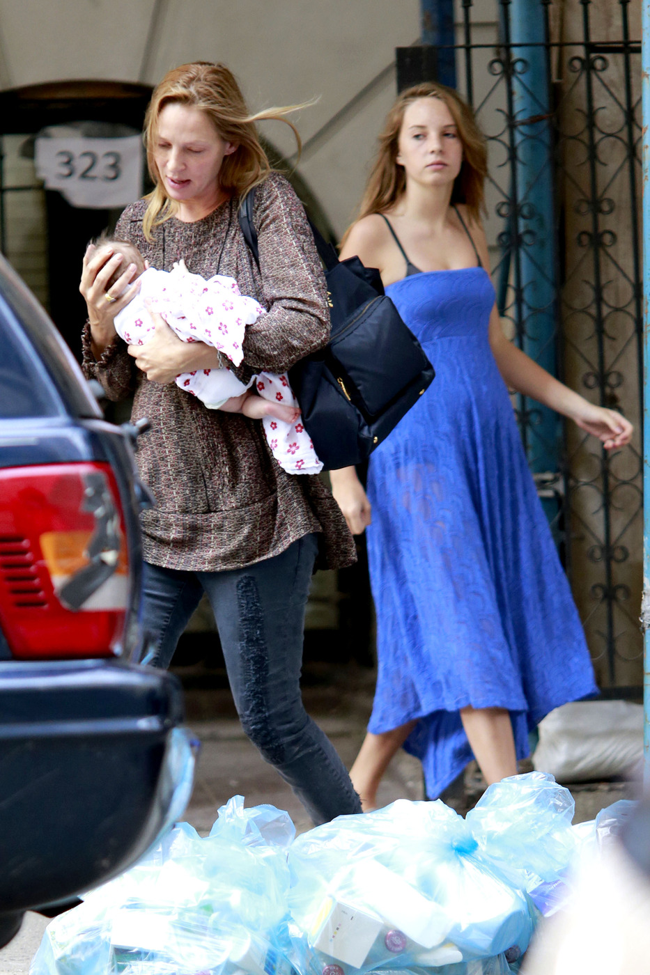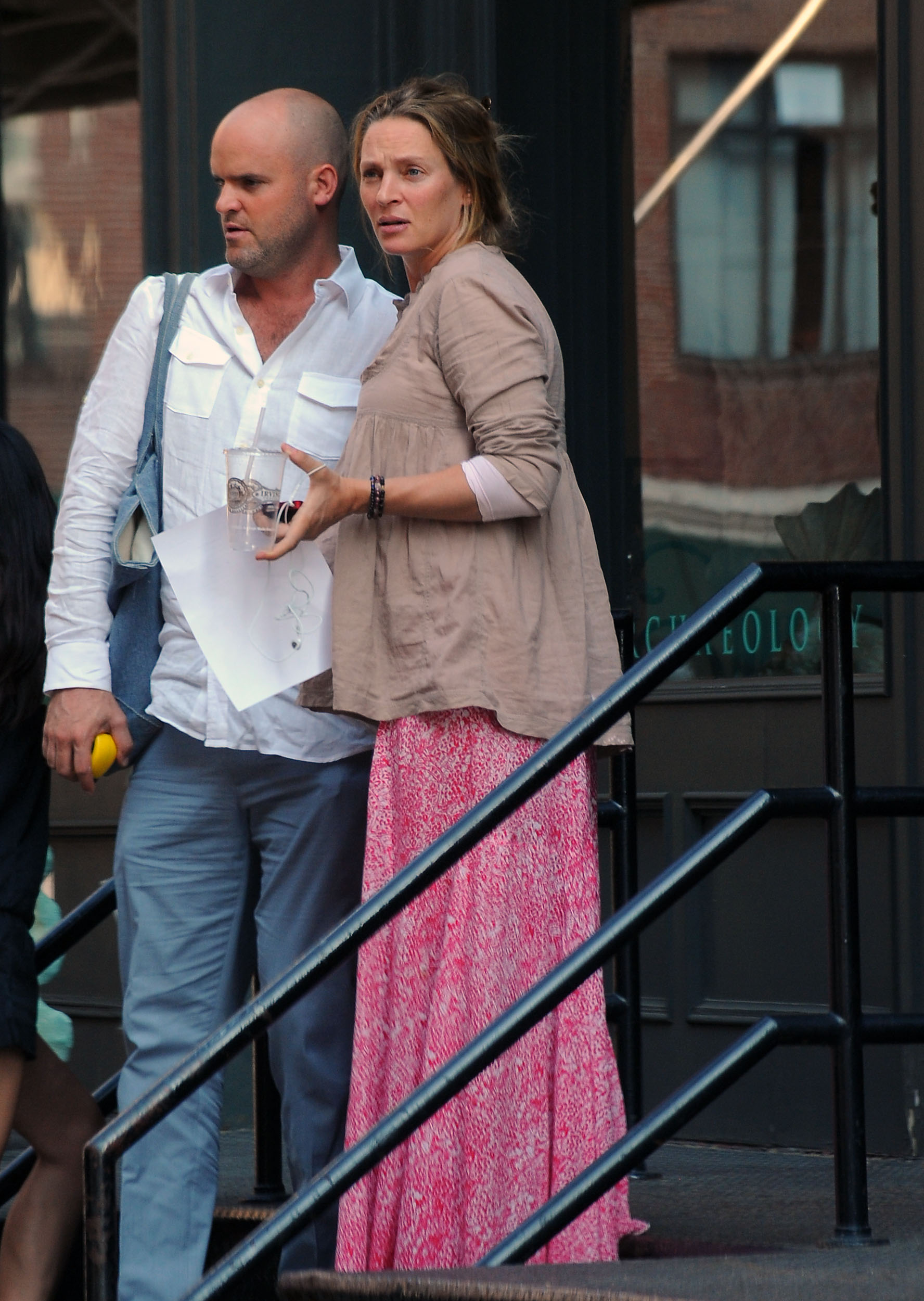 While she was attempting to avoid chaos, the hired help almost caused Uma Thurman to trip during her first pubic outing with her newborn daughter in New York City.