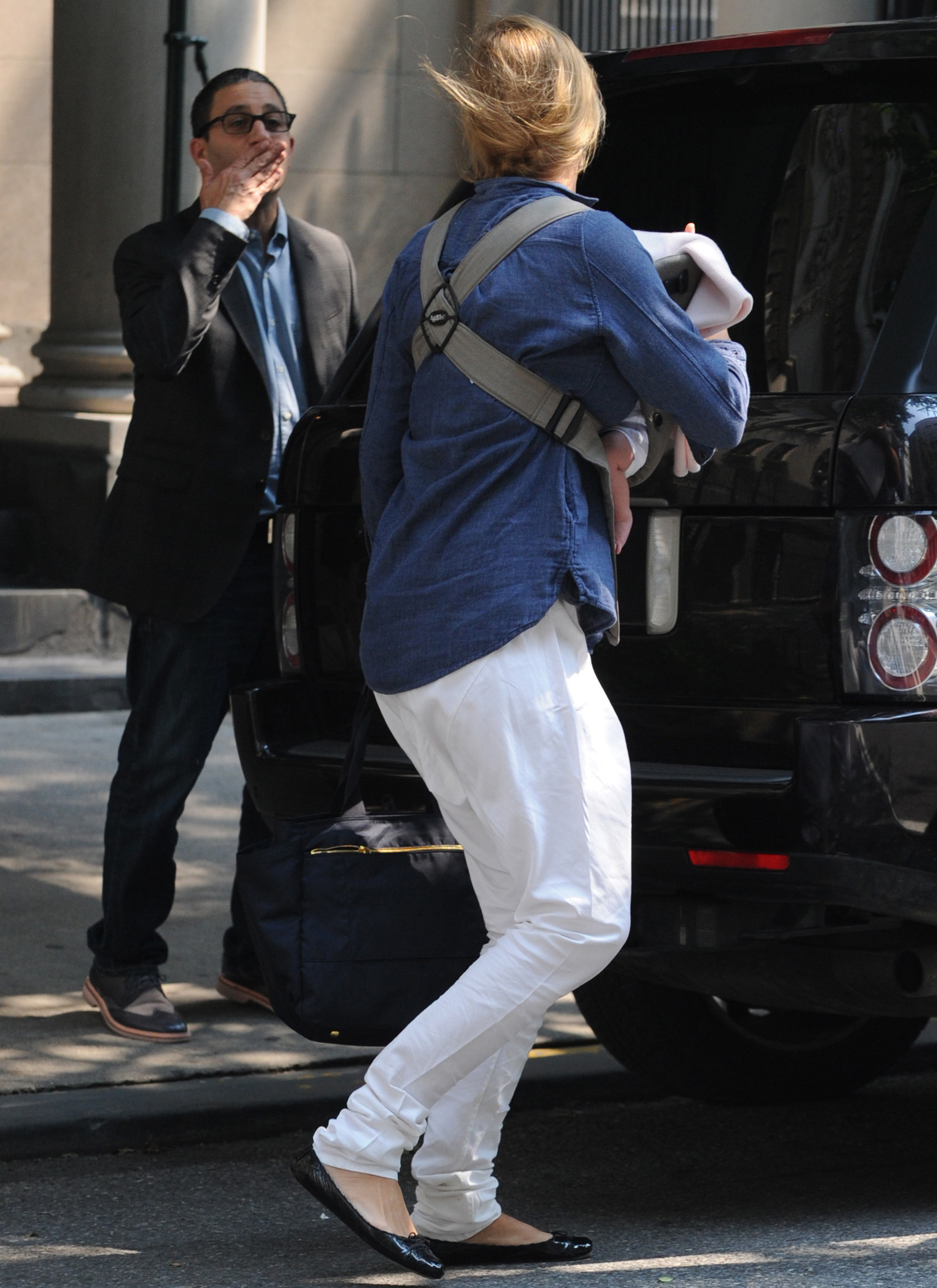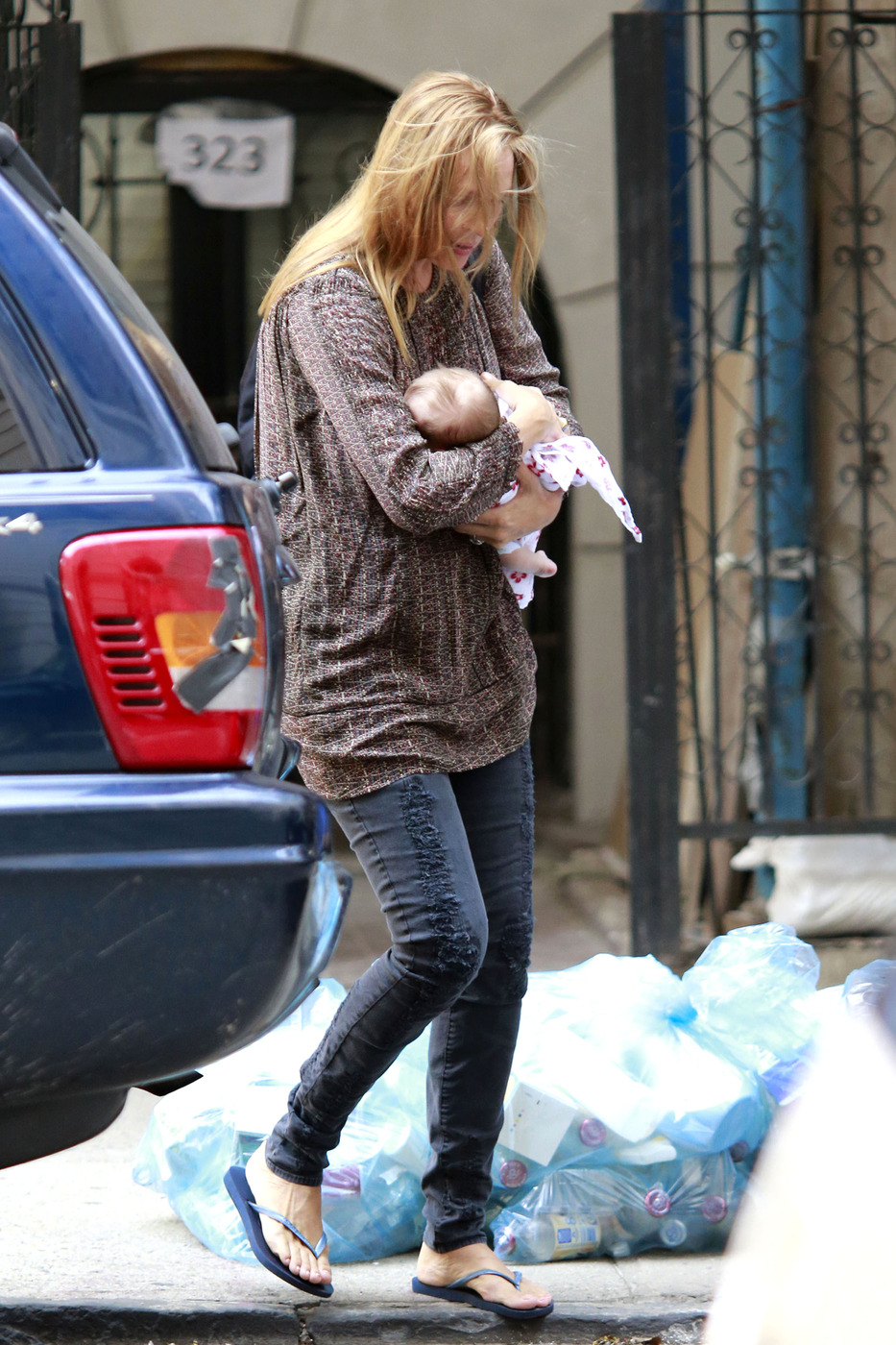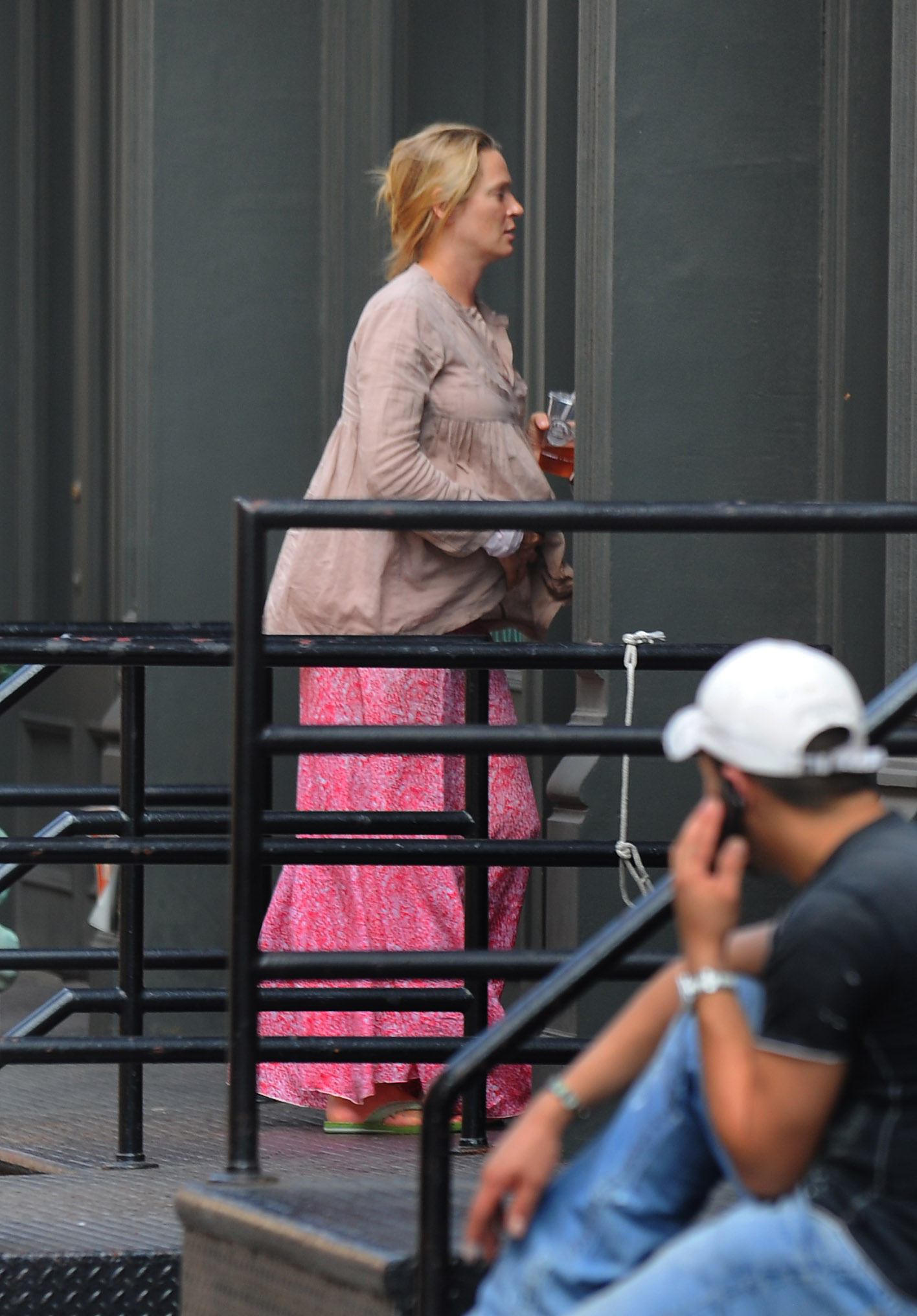 While she was attempting to avoid chaos, the hired help almost caused Uma Thurman to trip during her first pubic outing with her newborn daughter in New York City.