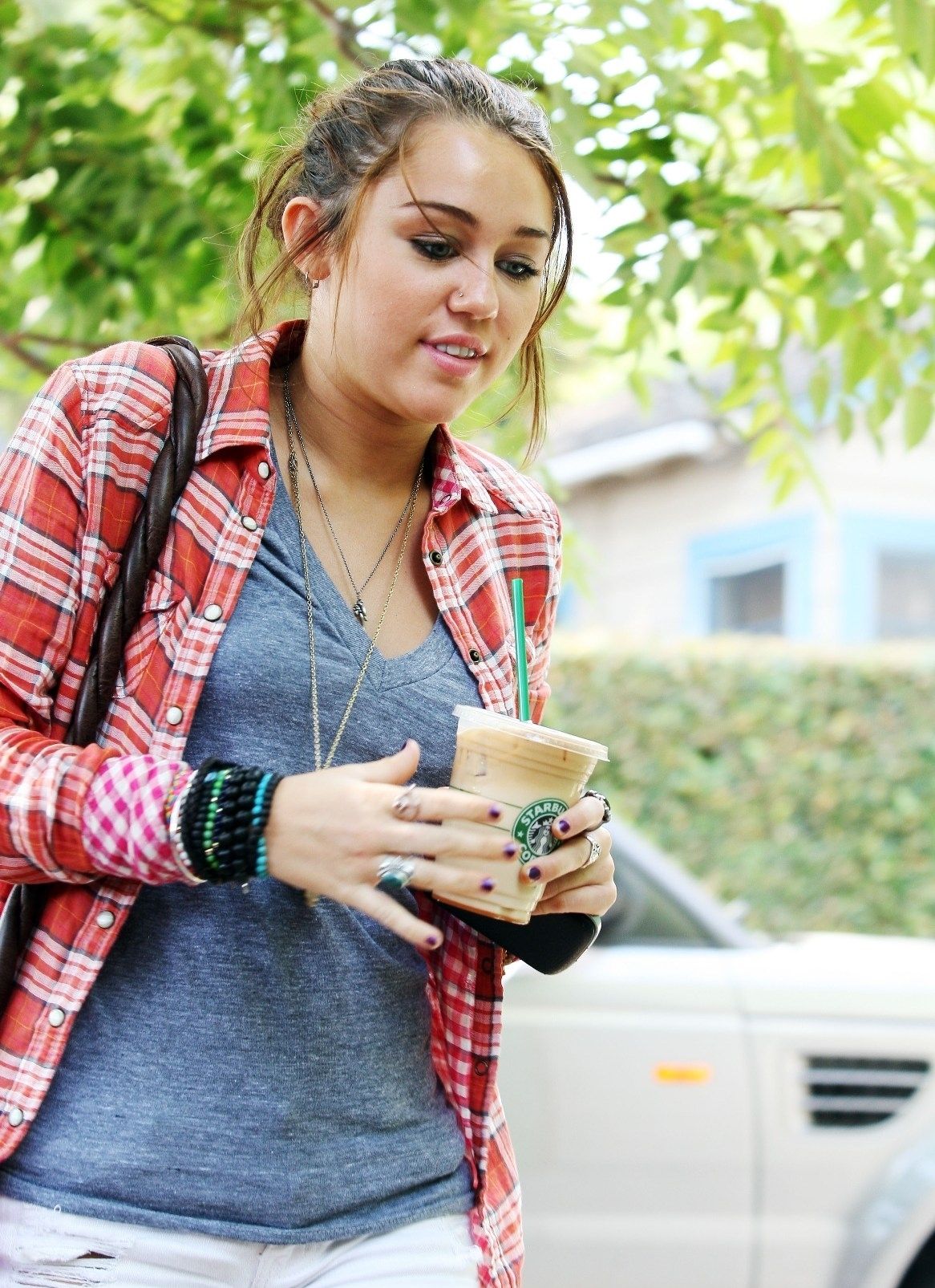 Miley Cyrus wraps herself up in Obesity and Speed’s thrashed top as she arranges her drink at Coffee Bean back in January.
