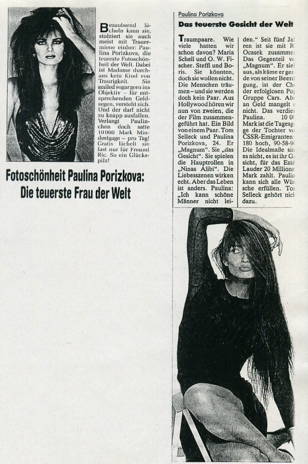 The black-white copy of this is only left: "Das teuerste Gesicht der Welt" - german BUNTE 15. June 1989 #25 - The other article "Fotoschönheit Paulina Porizkova: Die teuerste Frau der Welt" is from german NEUE REVUE if I´m not wrong.