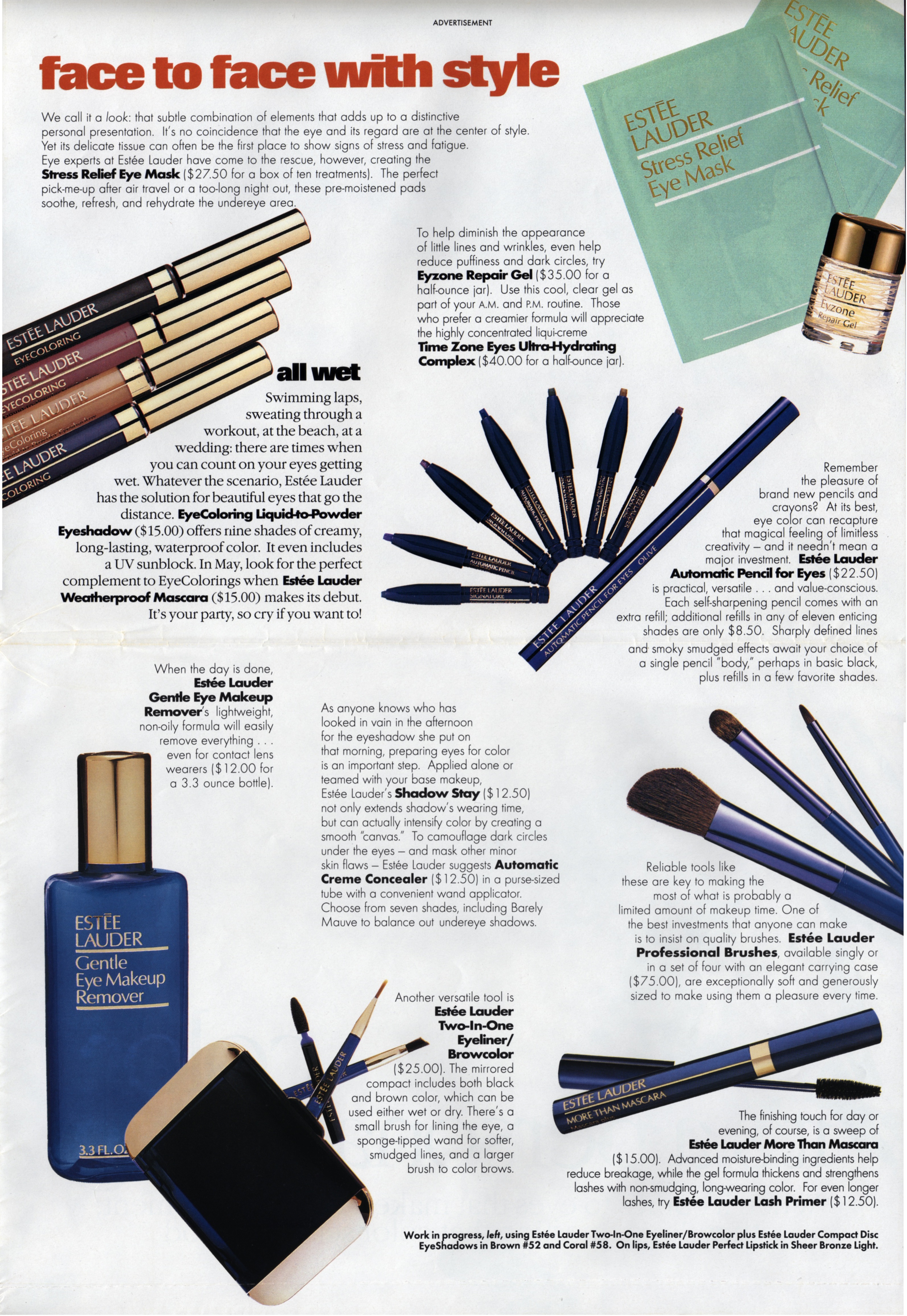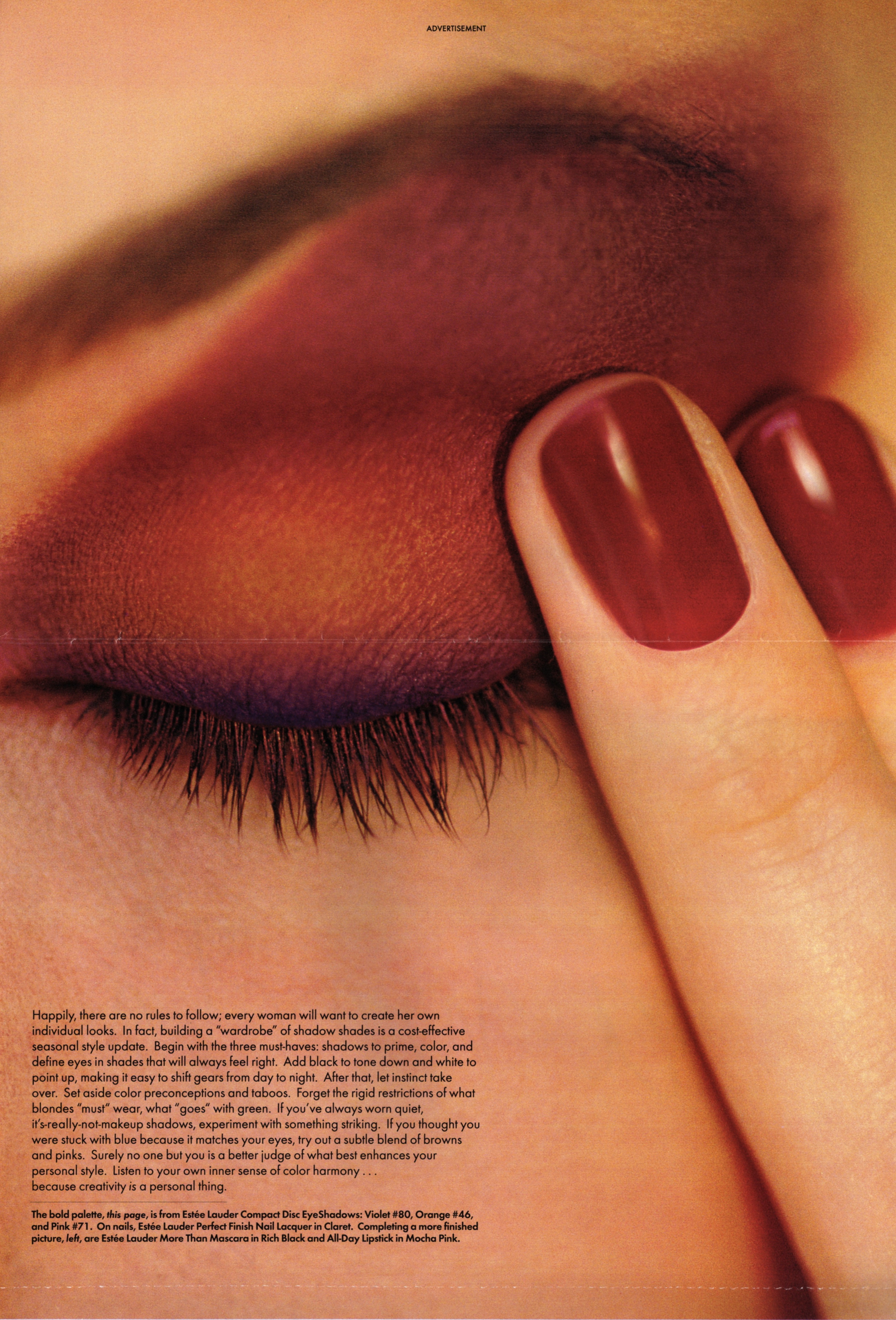 This is a very large format multi-page fold-out Estee Lauder ad that was in a Vogue in the early 90's. I have had the ad for a couple of years but did not note for myself where I'd gotten it from (something I've gotten better at as time has progressed). Anyway - with my new-found Photoshop skill, I have scanned and photo-merged the pages. This is fun!