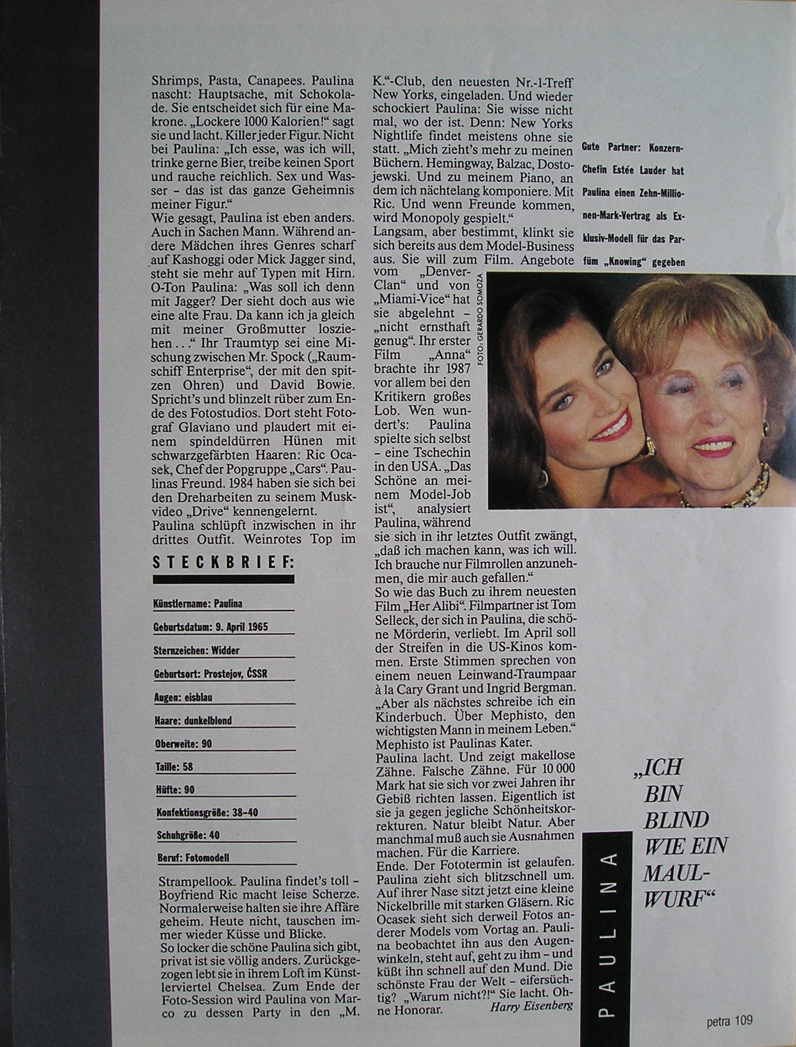 german petra May 1989 - for a lack of time the photos are only taken with my digital camera - I did a search for "petra", but could´t find it in this topic, so SORRY if re-post. The pics of the editorial are all from Glaviano. I don´t have longer the cover-look, so no idea who shoot the cover. And this pic with her husband and Miss Lauder is for sure also not of Glaviano.