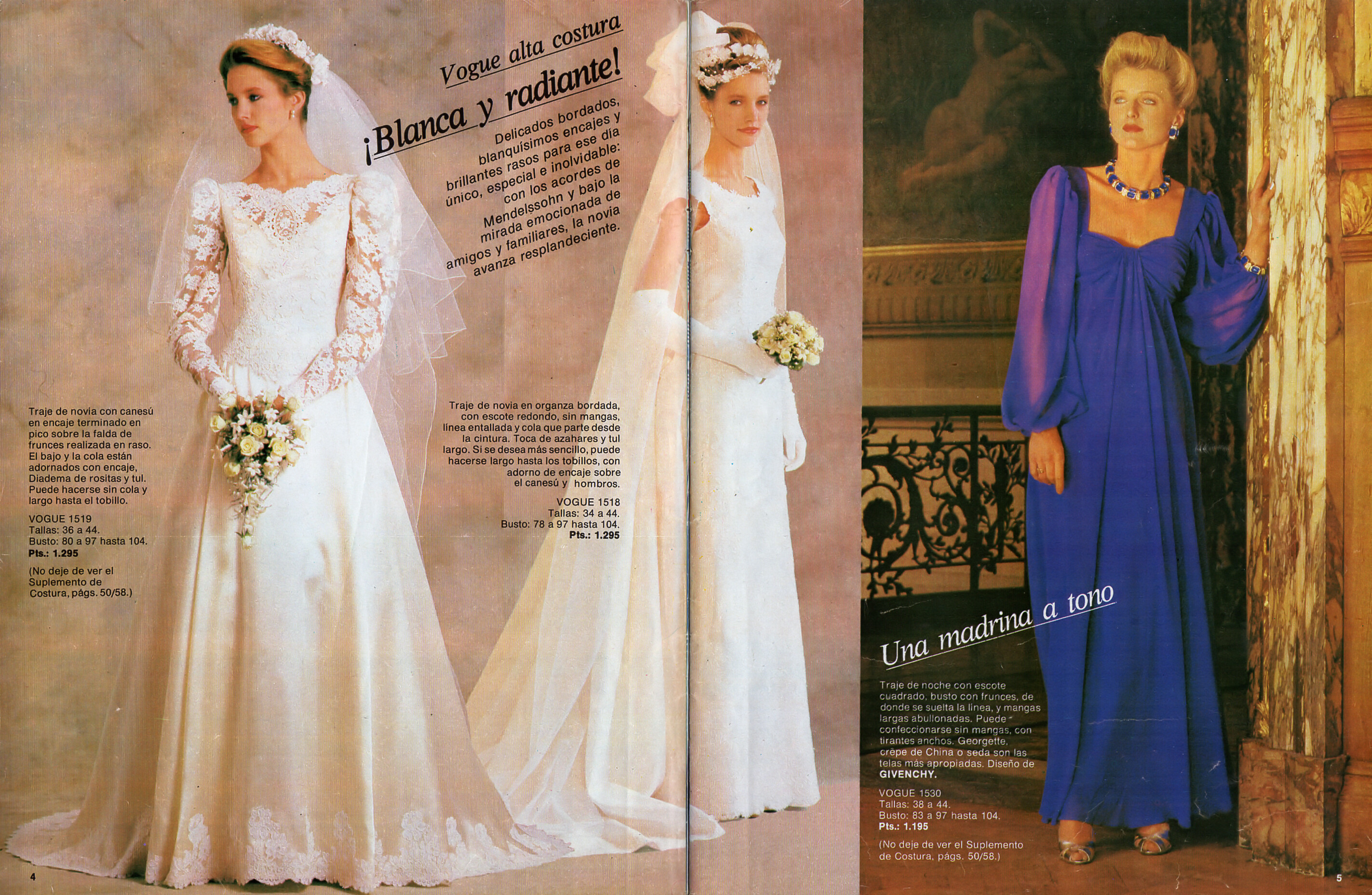 "Blanca y radiante" + "Una madrina a tono" - Vestidal Spain Spring 1985 #34 - also showing Jane Gill