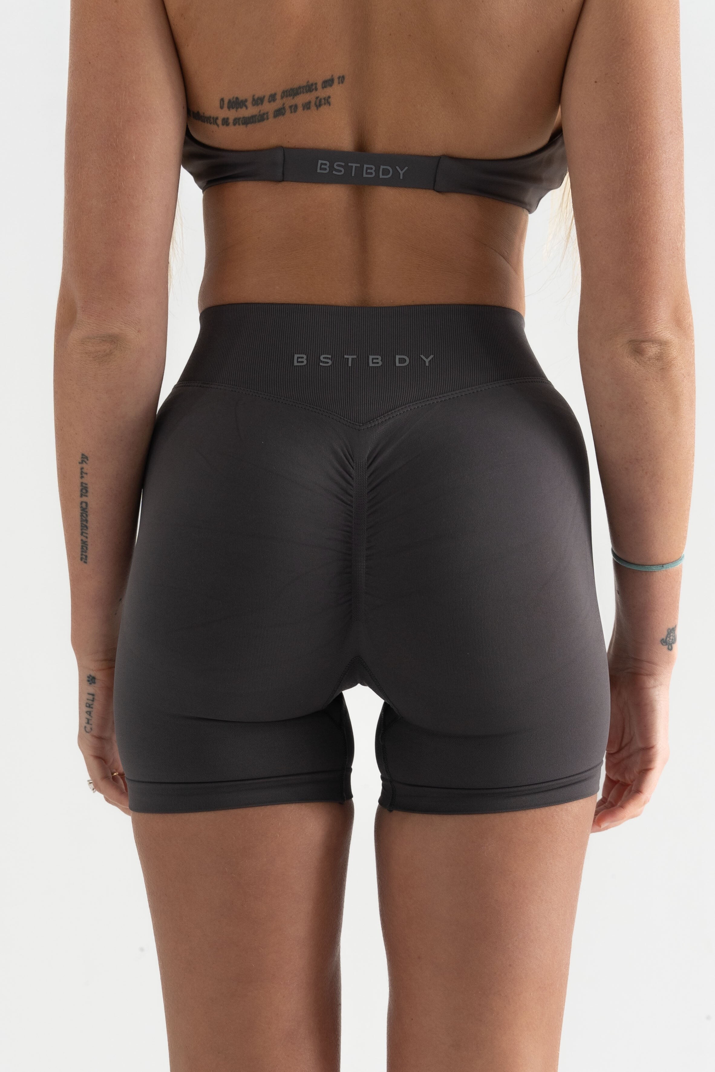 I've started to decipher her tattoos, which she has mostly had before her stint with Boutine LA. There's Greek on her back, Arabic just under her left collar bone, Hebrew on the outer side of her left forearm, Charli (the dog in the photo above) on the ulnar 'knife edge' of her left hand, a constellation that I think is Canis Major on her left wrist, and coordinates on her inner upper left arm which match the Richards Bay area of South Africa, where I assume she was born. In her Best Body images below, I also noticed a turtle near the pisiform bone of her right wrist, and some more Hebrew on the medial side of her right index finger.