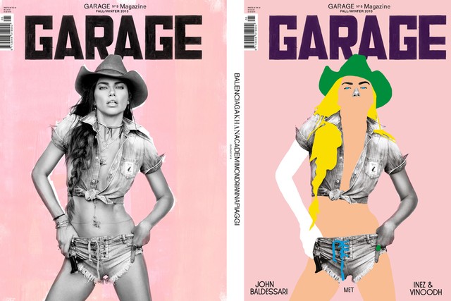 source: wwdTWO-ART GARAGE: Garage magazine readers will be seeing double when Issue No. 5 drops on Sept. 5, thanks to a collaboration between Dutch photographers Inez van Lamsweerde and Vinoodh Matadin and American conceptual artist John Baldessari. The husband-and-wife team shot Adriana Lima in a painterly pink field for one cover. The image is drawn from the 19-page “Once Upon a Time in the East” spread within that casts the Brazilian model as an urban cowgirl sporting Inez + Vinoodh’s jewelry and very little denim and leather.Baldessari reimagined the other cover of Lima, by adding colorful pops and disguising her chiseled face. In an exercise in cross-branding, editor in chief Dasha Zhukova interviewed Baldessari, who has a solo exhibition bowing Sept. 21 at the Garage Center for Contemporary Culture in Moscow.Perhaps as a nod to the power of art, or a case for irony, Issue No. 5 has no words printed on either cover beyond the magazine’s title even though it is the Words issue.
