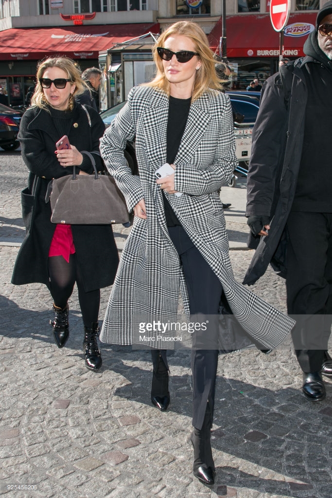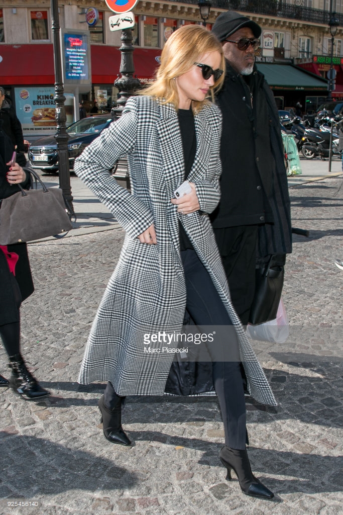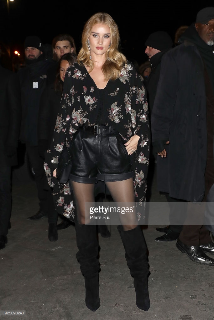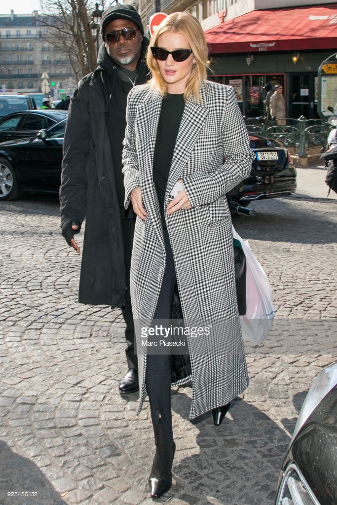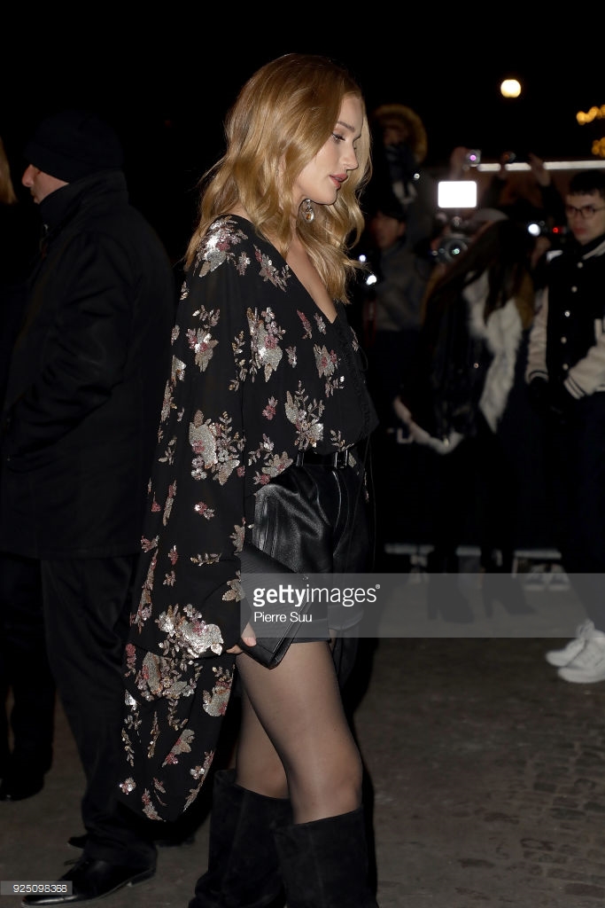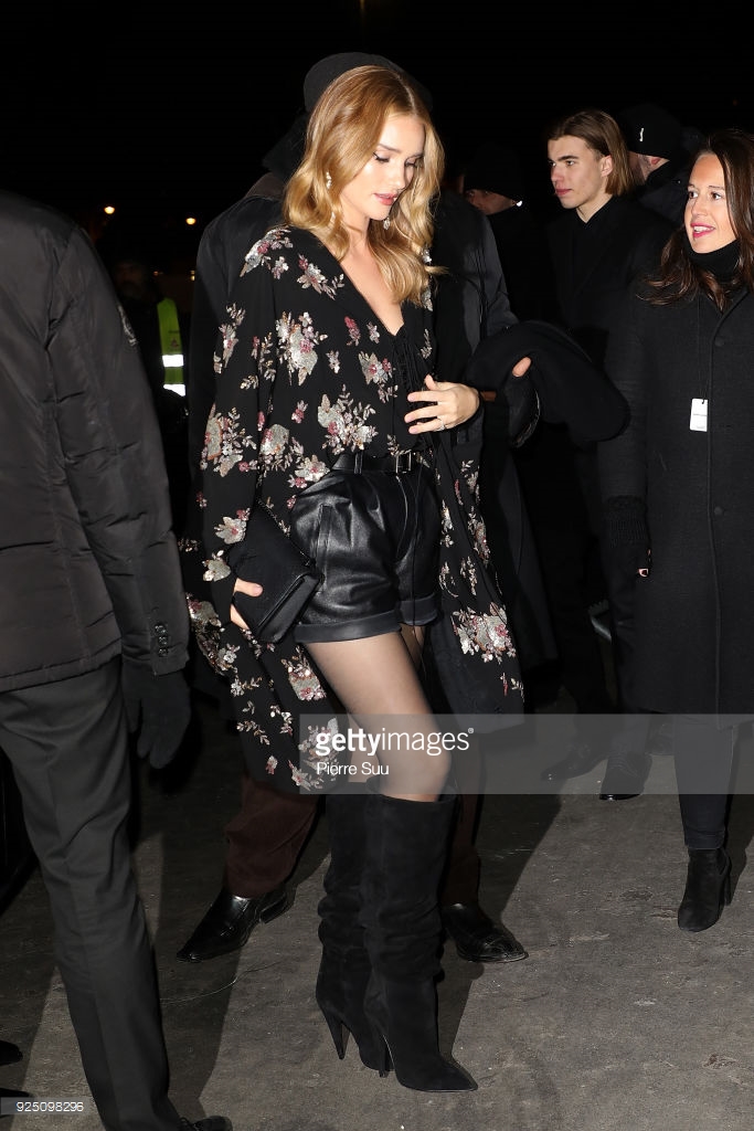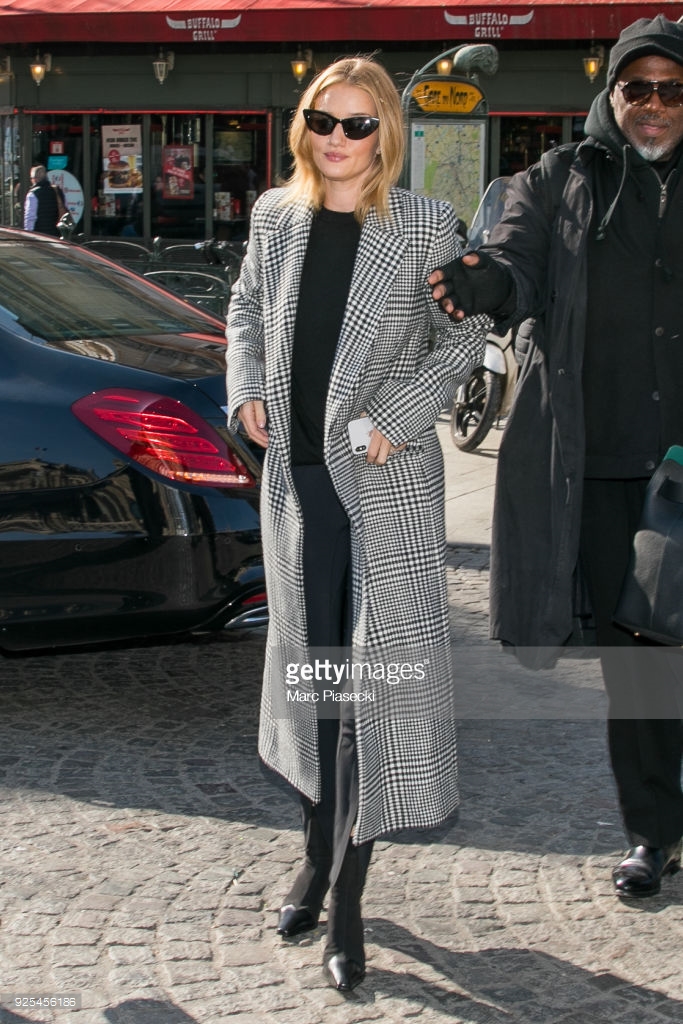 Model and actress Rosie Huntington Whiteley is seen at Gare du Nord station on February 28, 2018 in Paris, France.