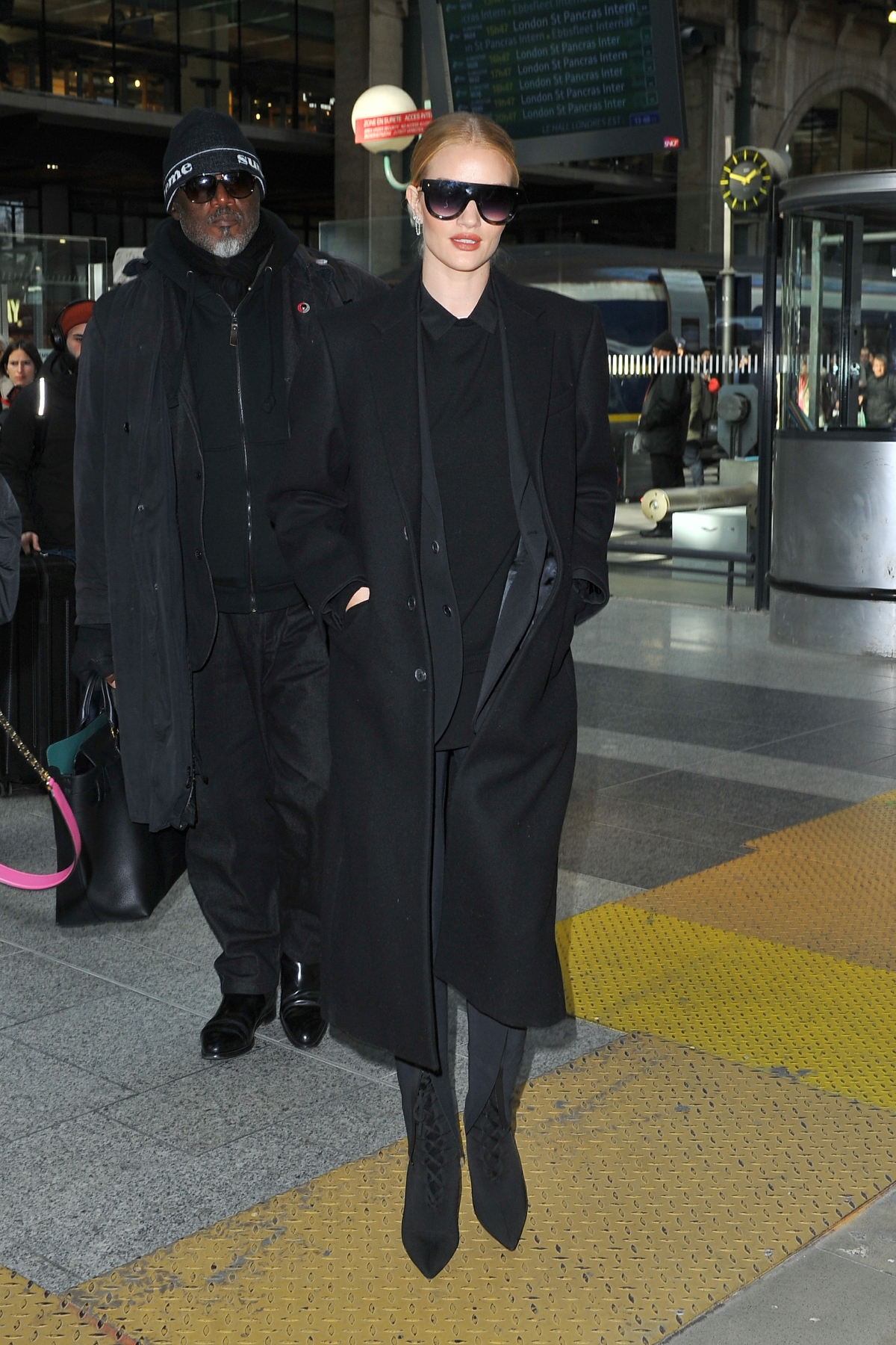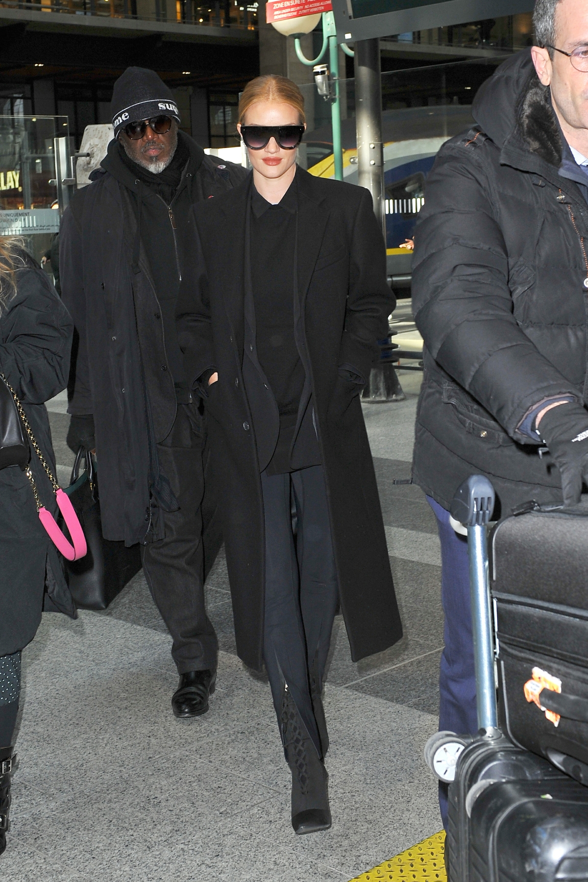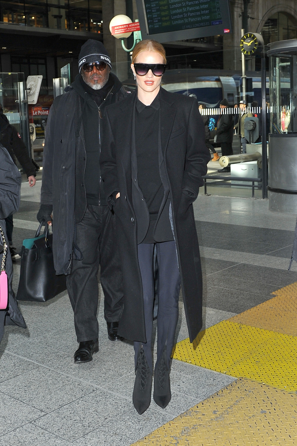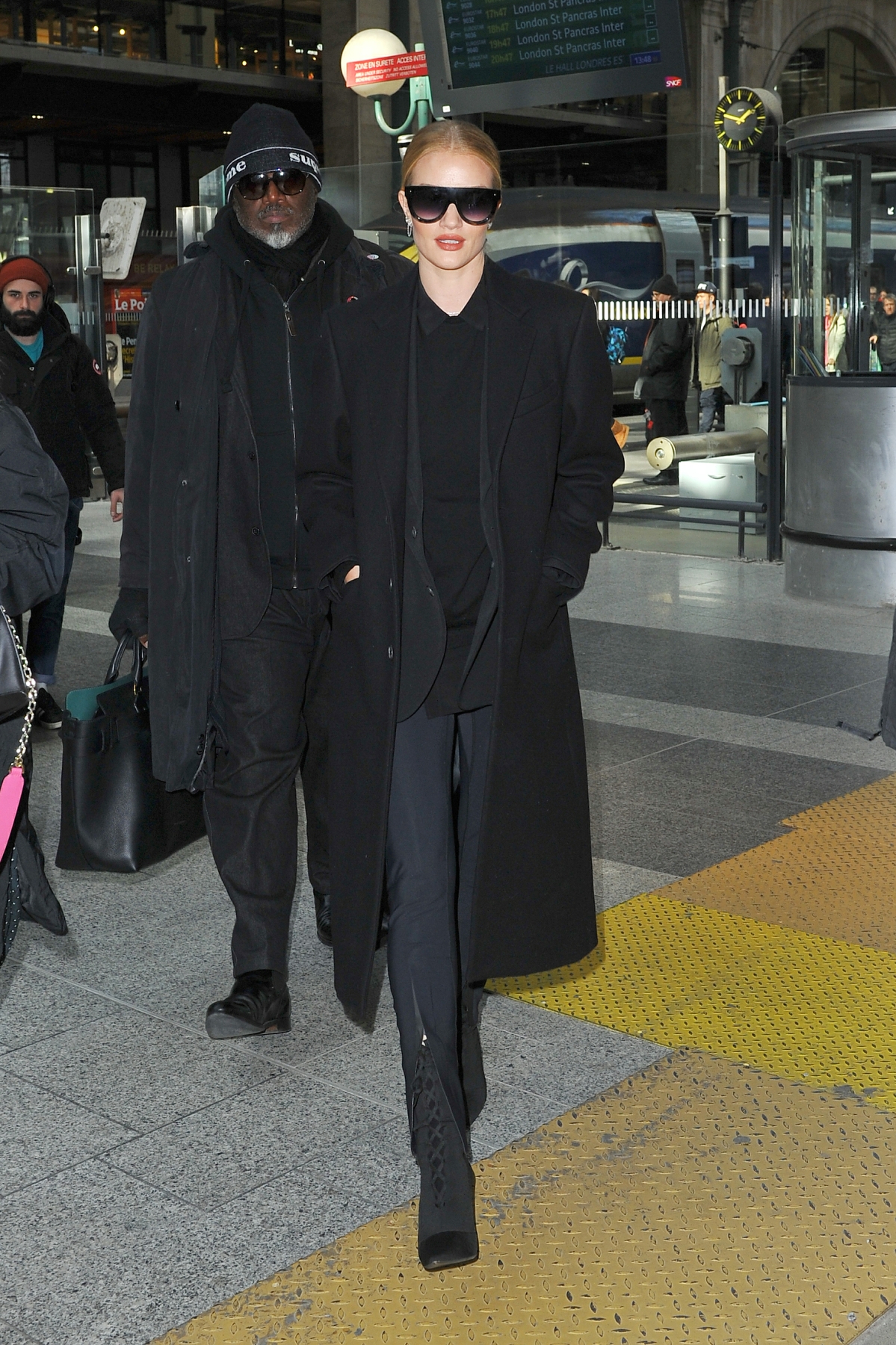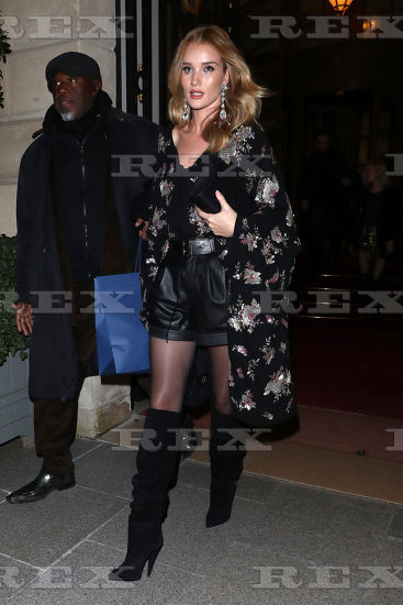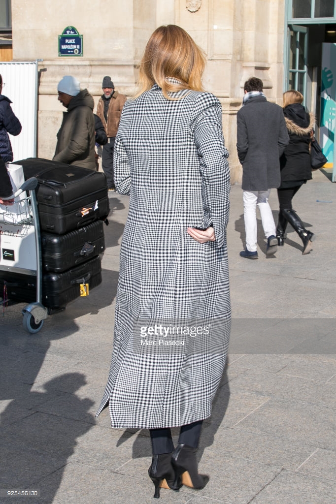 Model and actress Rosie Huntington Whiteley is seen at Gare du Nord station on February 28, 2018 in Paris, France.