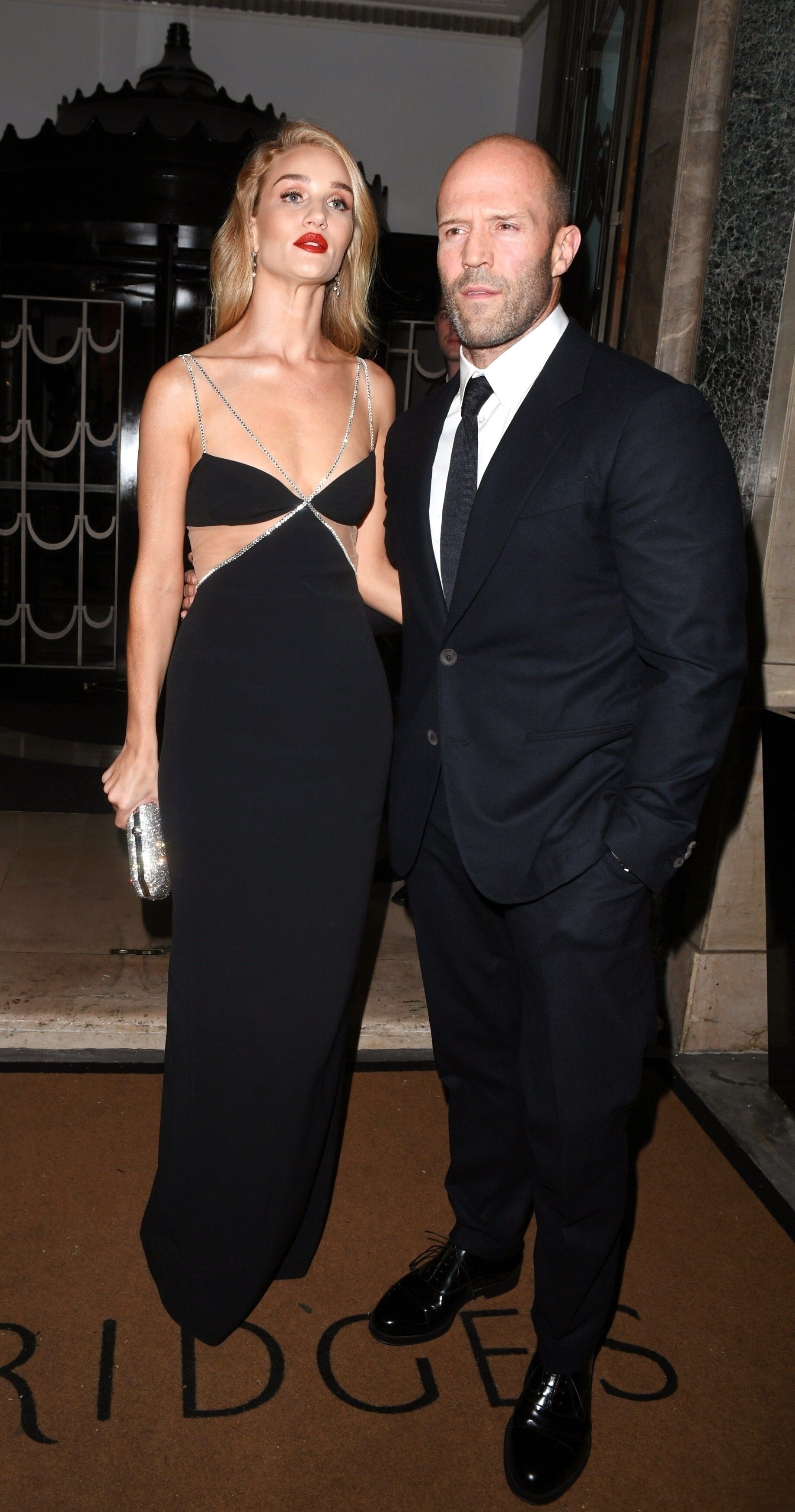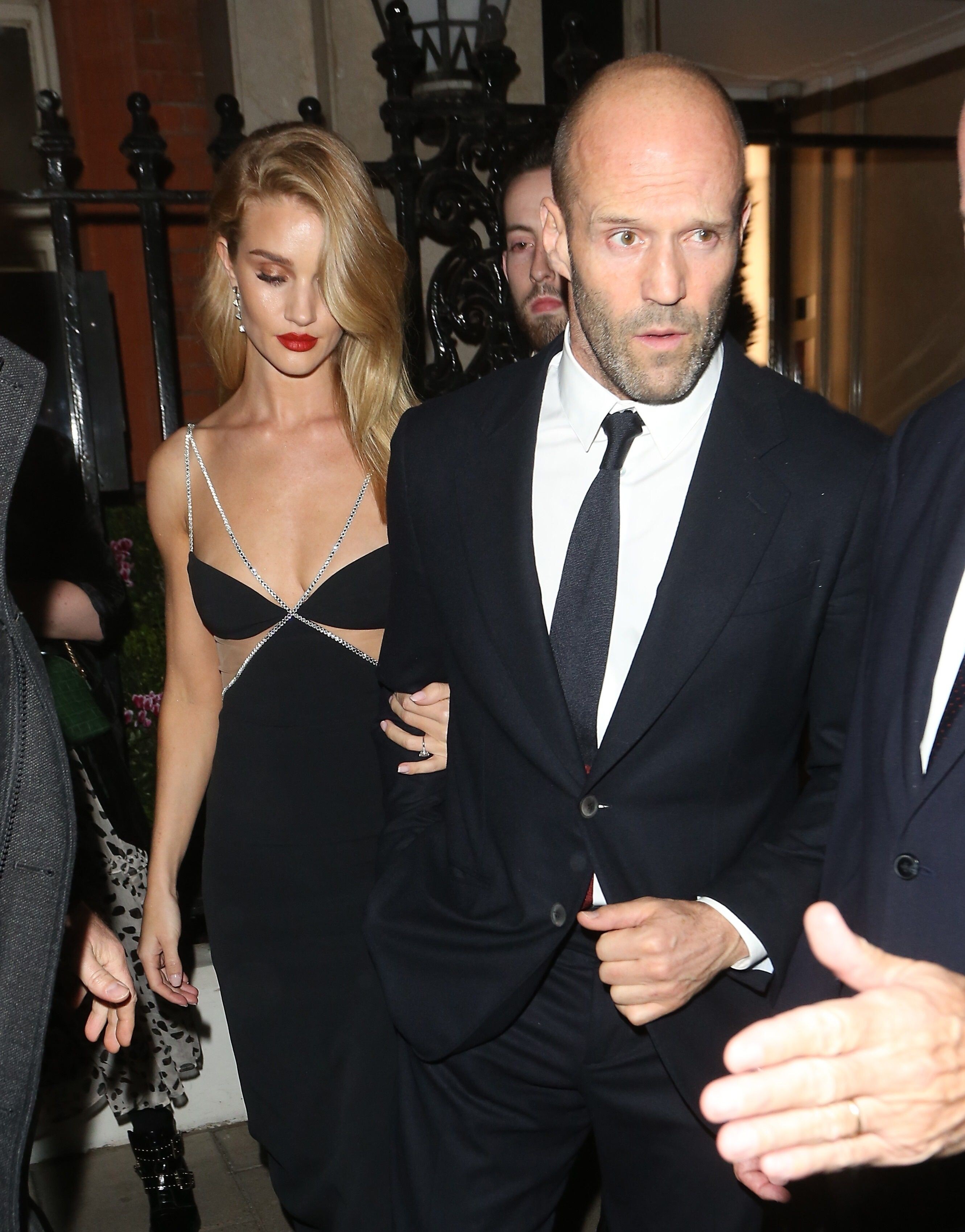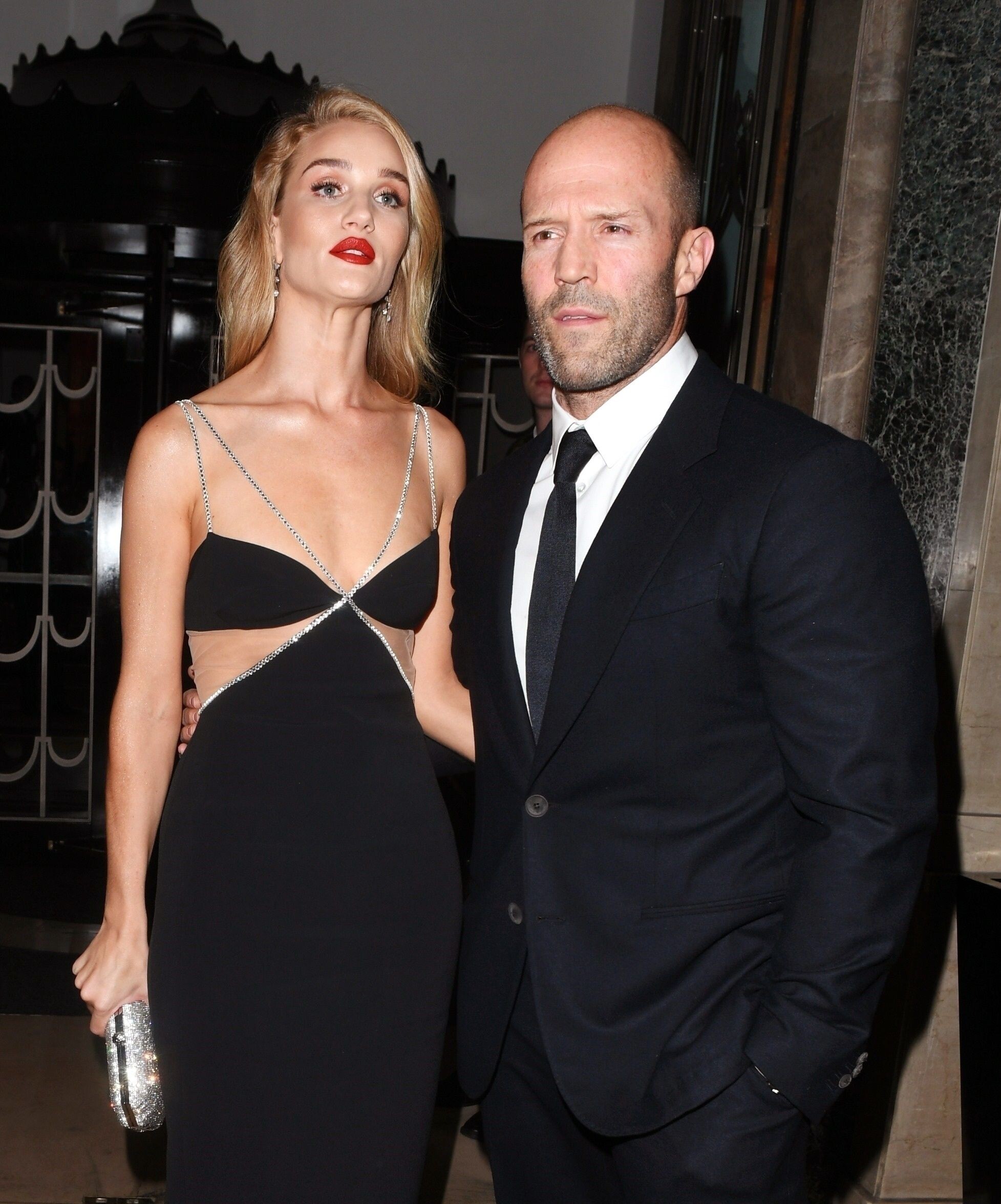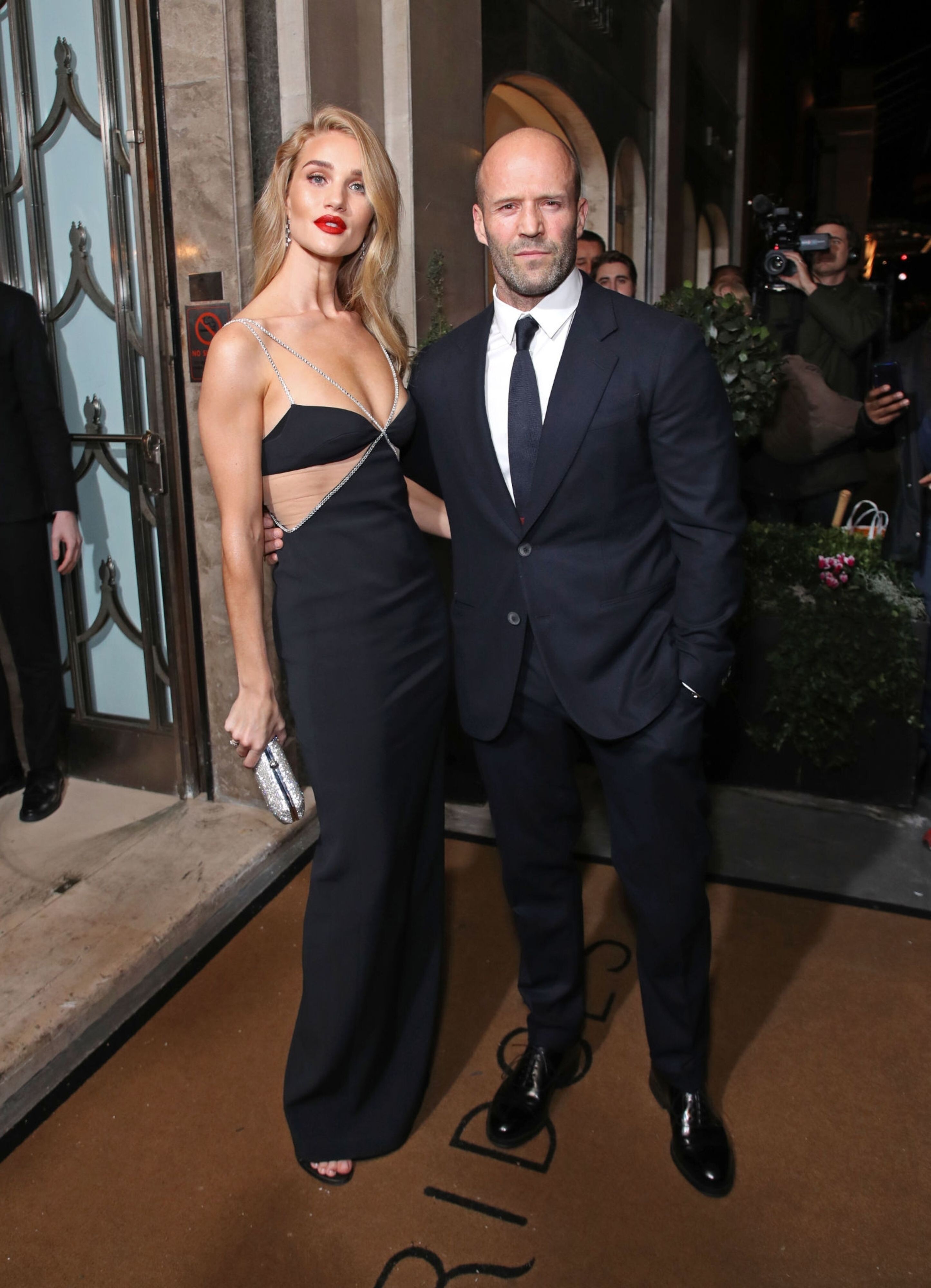 Rosie Huntington-Whiteley put on a racy display in a stunning black and silver gown as she joined fiancé Jason Statham for the Harper's Bazaar Women Of The Year Awards