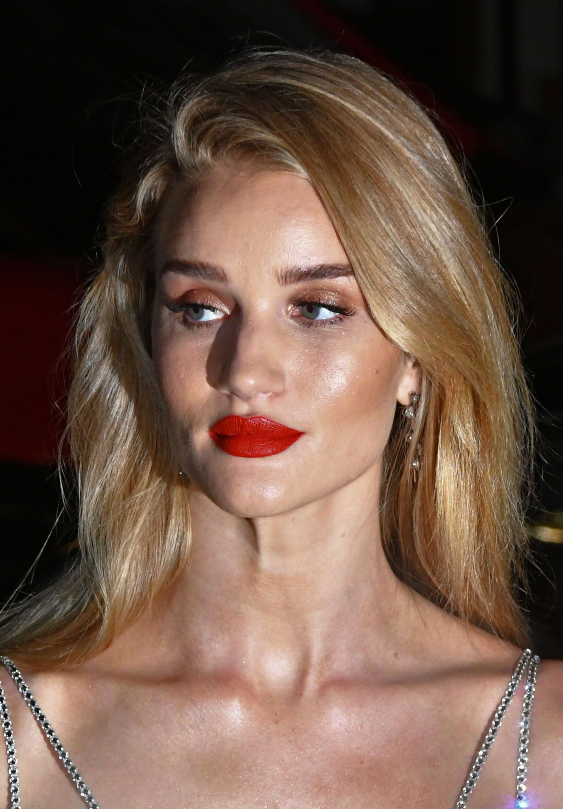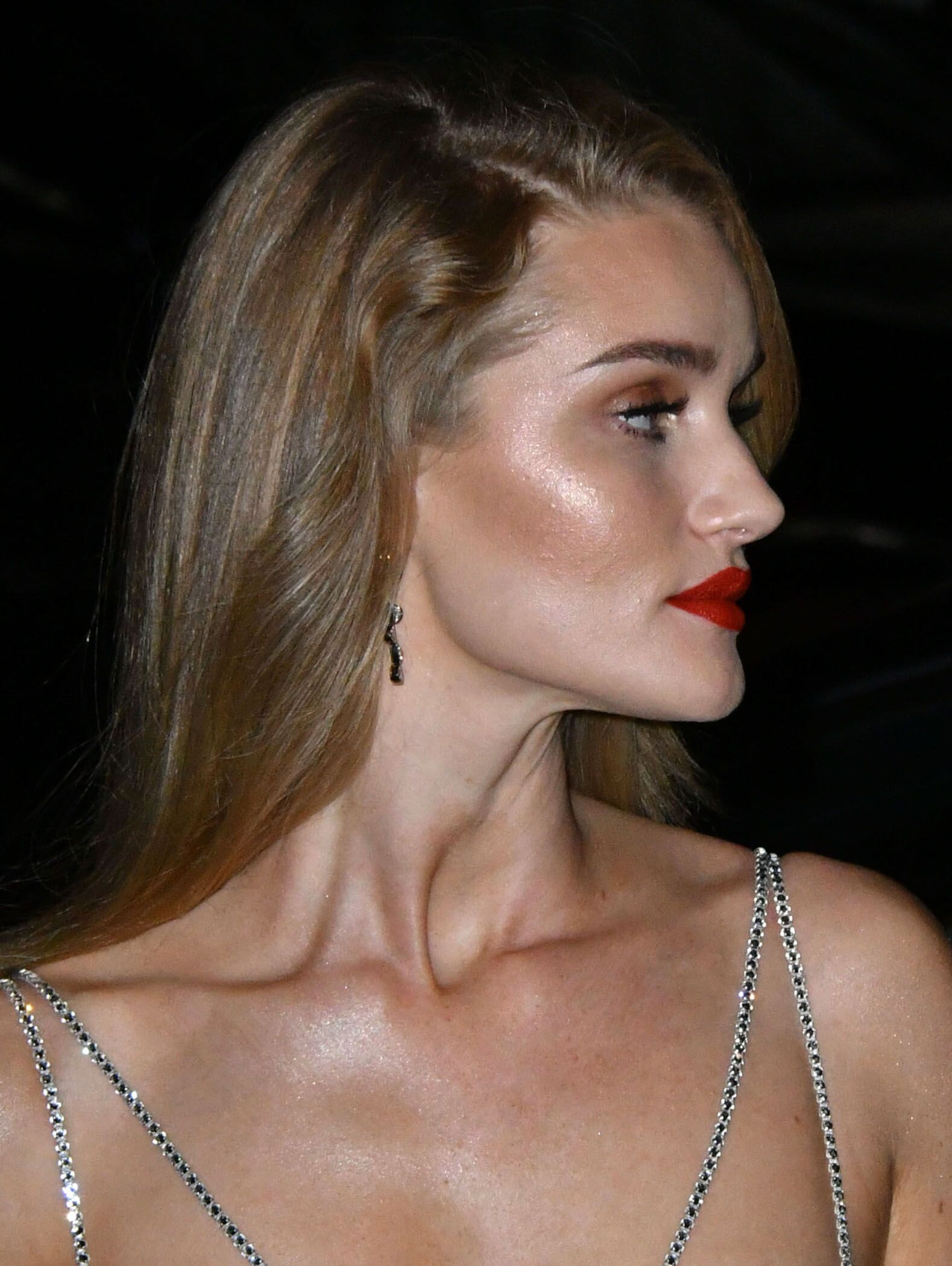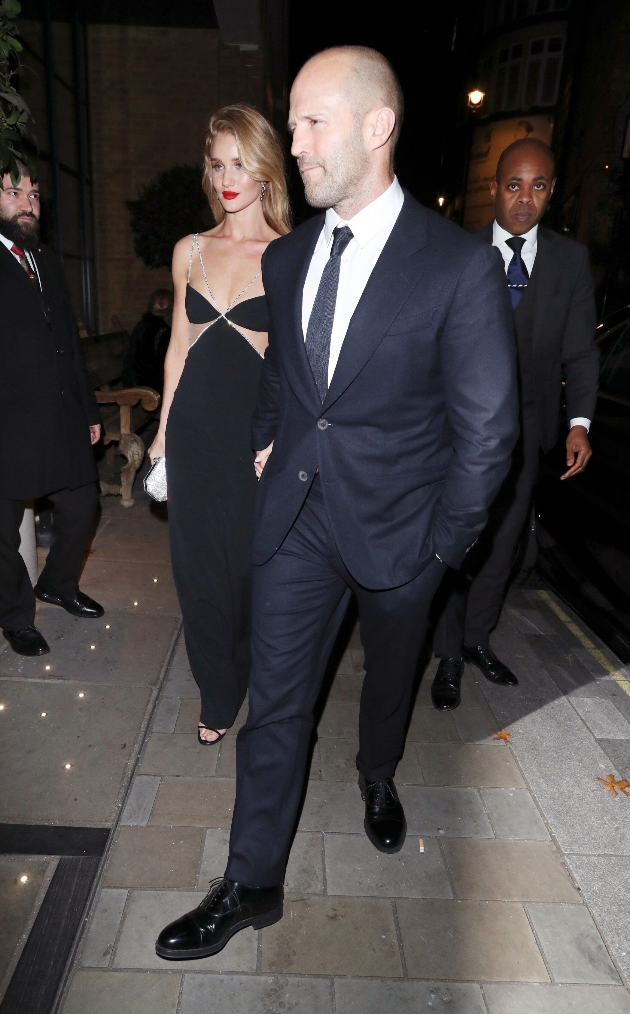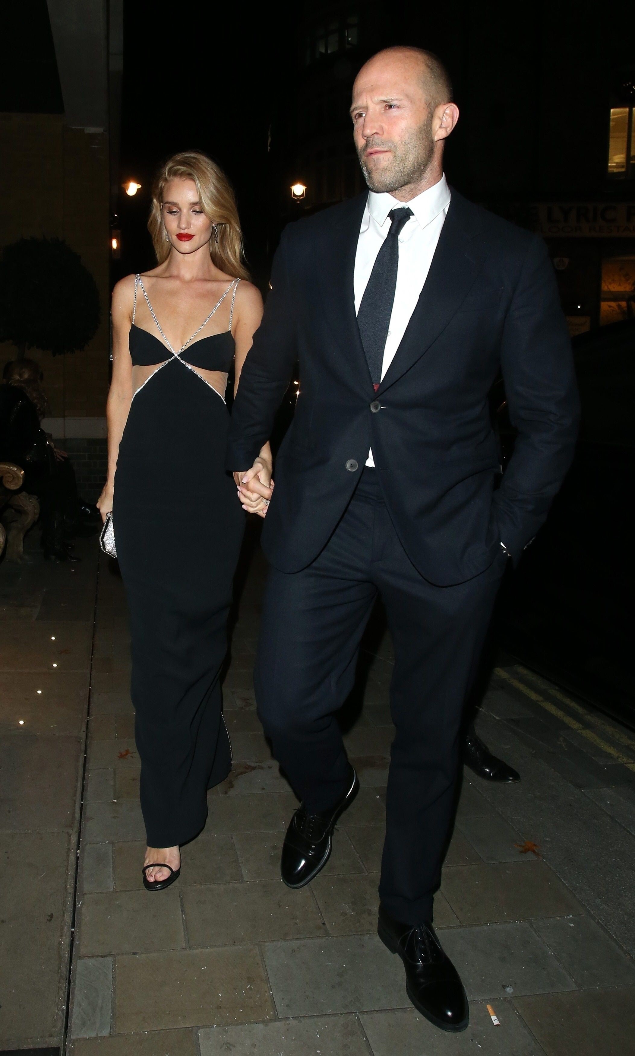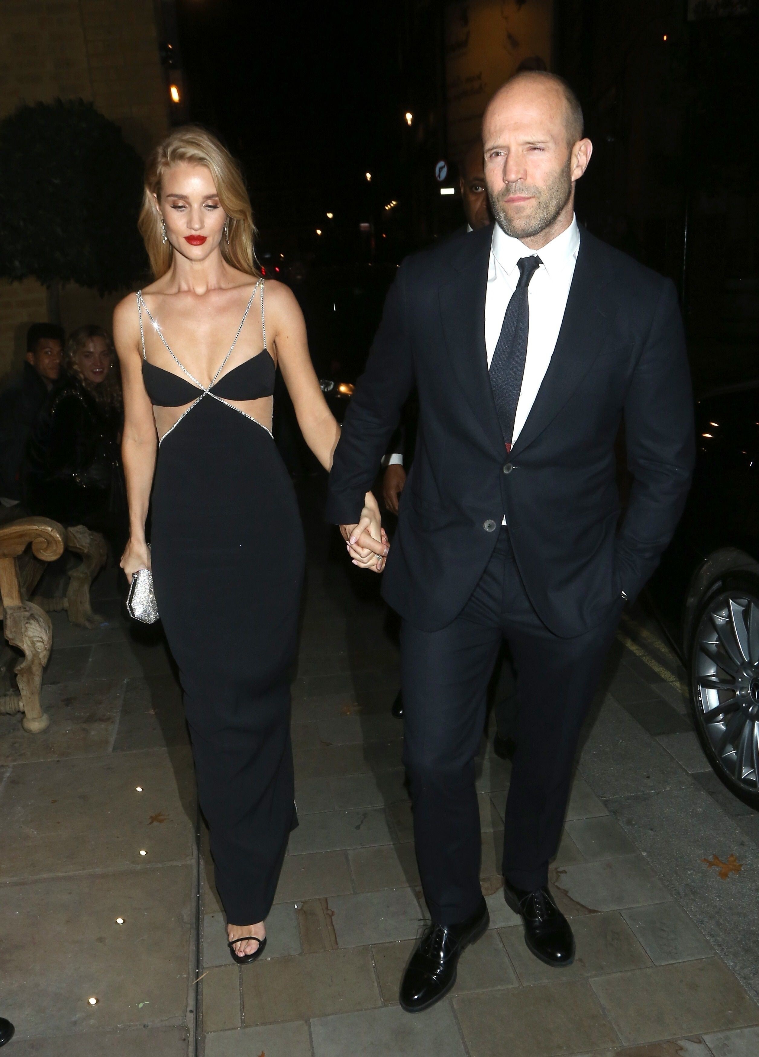 Rosie Huntington-Whiteley put on a racy display in a stunning black and silver gown as she joined fiancé Jason Statham for the Harper's Bazaar Women Of The Year Awards