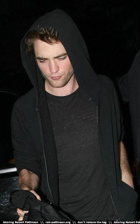 I was at a bar last night and Rob was there with TomStu and Emilie de Ravin and about 5 other young hipster types with accents. He and TomStu left their black hoodies up the whole time and he and Emilie were chatty in a friendly way. He is tall and very skinny in person and the smile is just unreal. They seemed to be having fun.