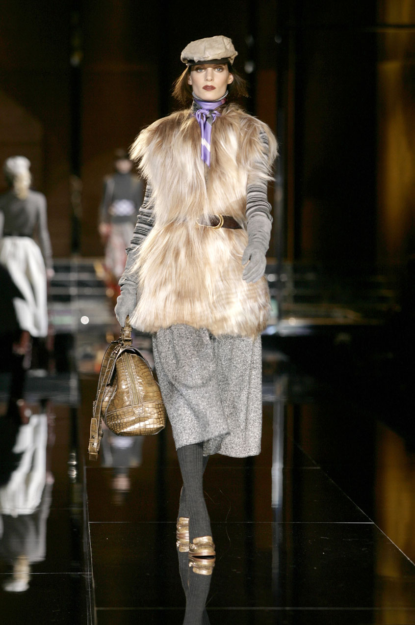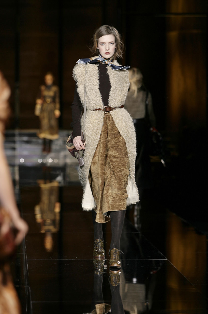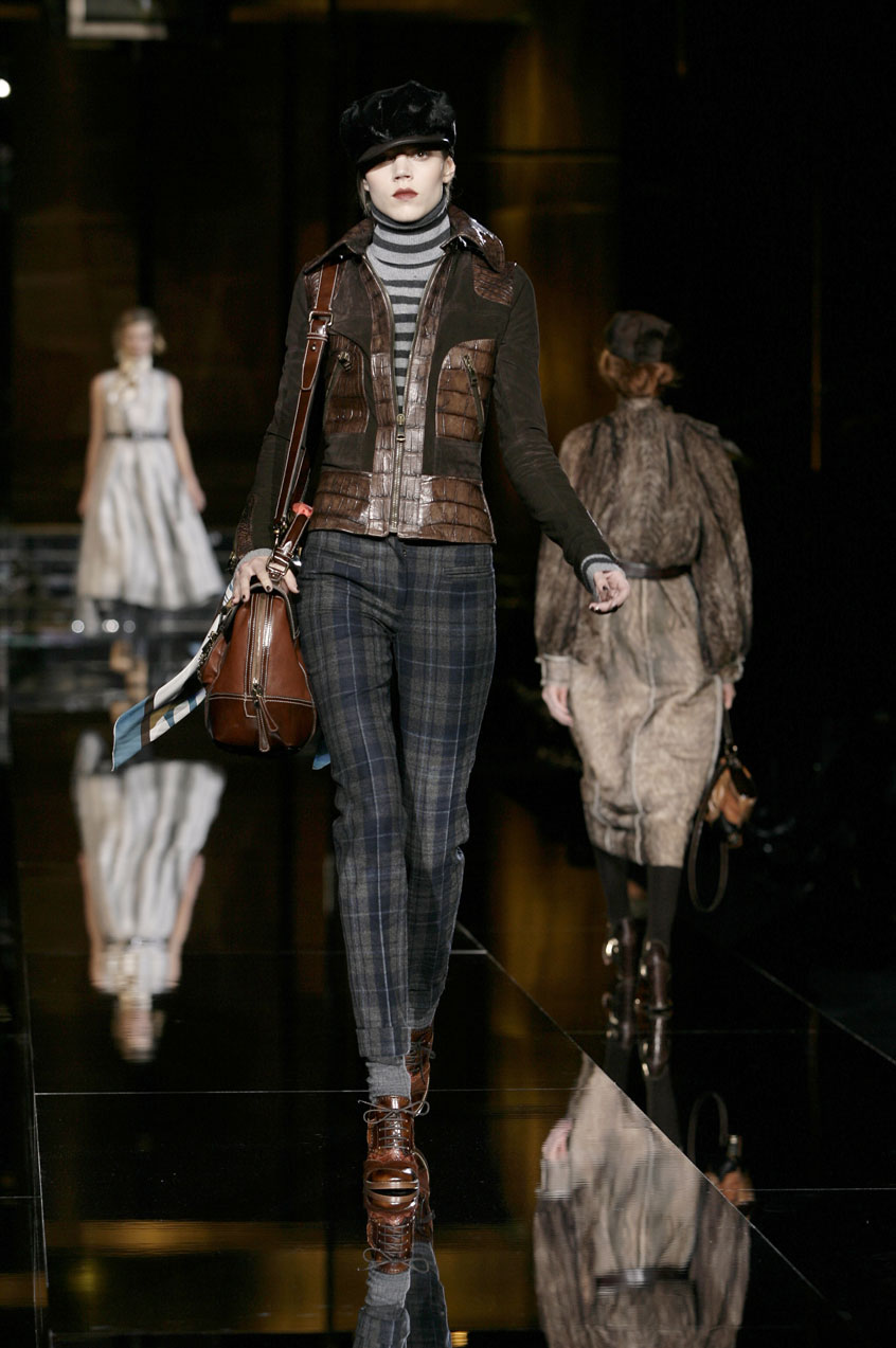 Fitted jackets of worn-in leather mixed with crocodile details. Rectangular shaped coats and vests and vests in goat or lamb fur. Patchwork leather jackets and skirts. Lamb fur dresses and skirts. Skinny jeans with leather details. Each piece is constructed with exposed stitching, laser cut or Pegaso sewn.
