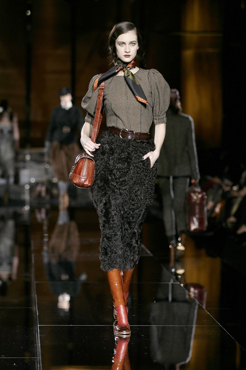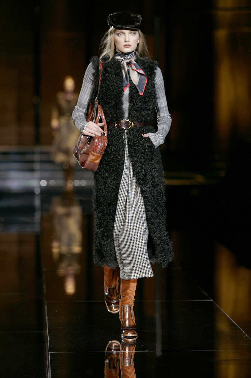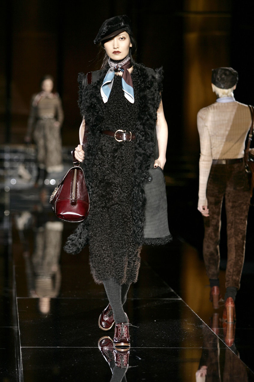 Fitted jackets of worn-in leather mixed with crocodile details. Rectangular shaped coats and vests and vests in goat or lamb fur. Patchwork leather jackets and skirts. Lamb fur dresses and skirts. Skinny jeans with leather details. Each piece is constructed with exposed stitching, laser cut or Pegaso sewn.