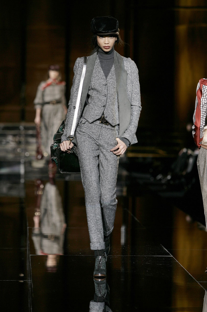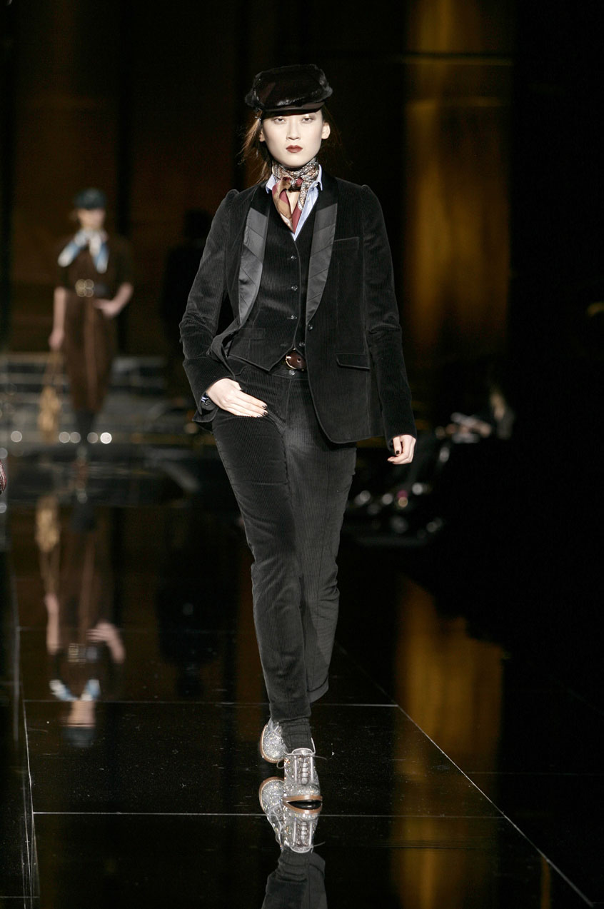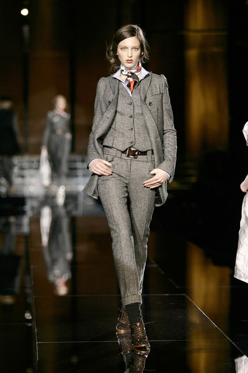 Suits are newly proportioned and in menswear fabric: jackets are long or short with narrow shoulders, shown with vests and skinny pants and paired with Oxford shirts with small collars.