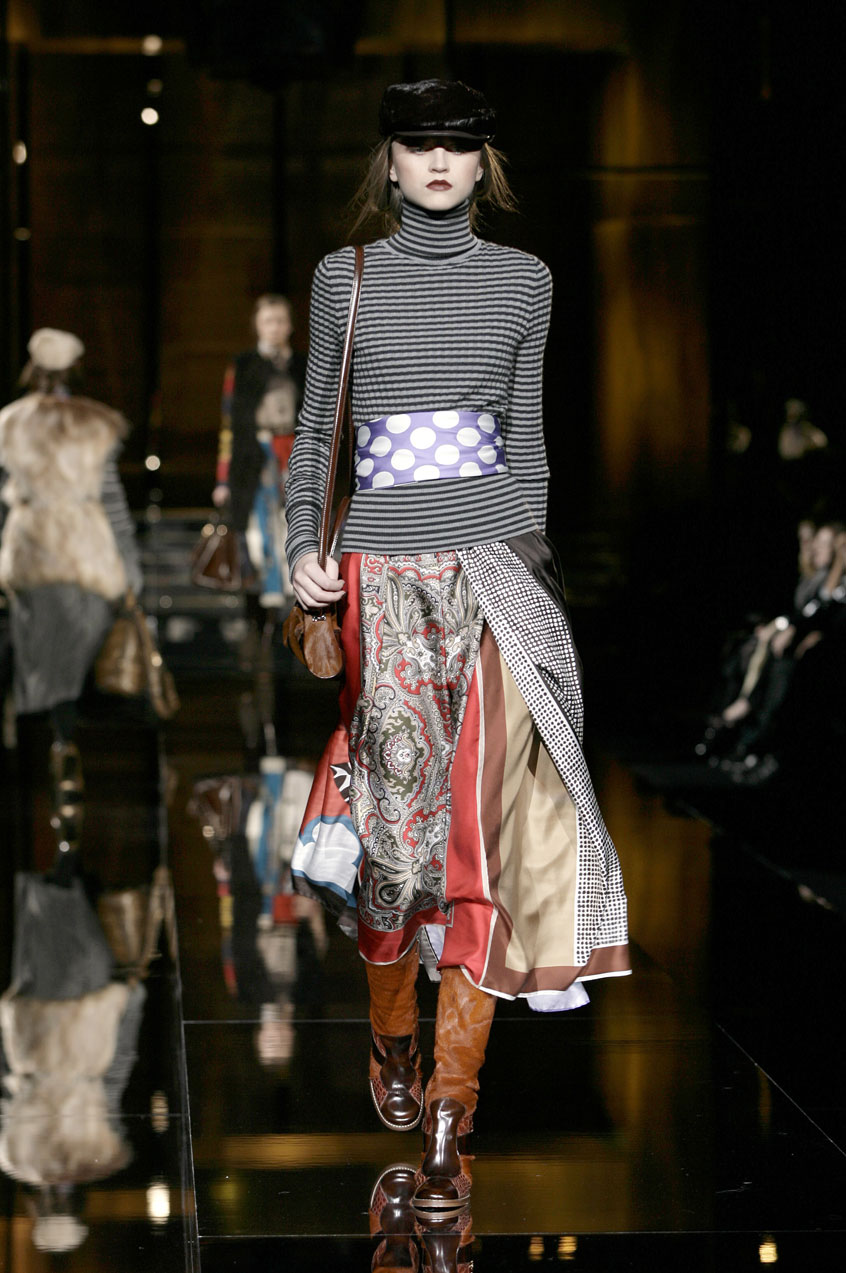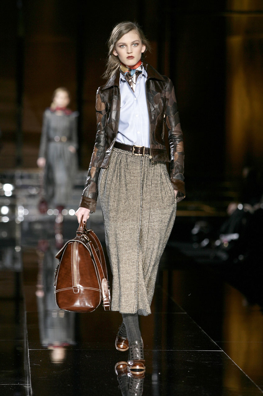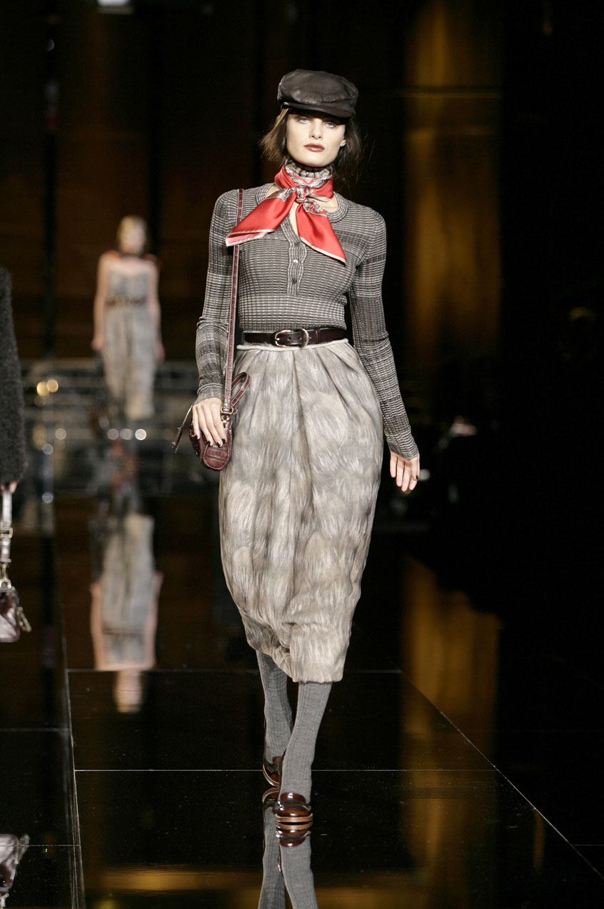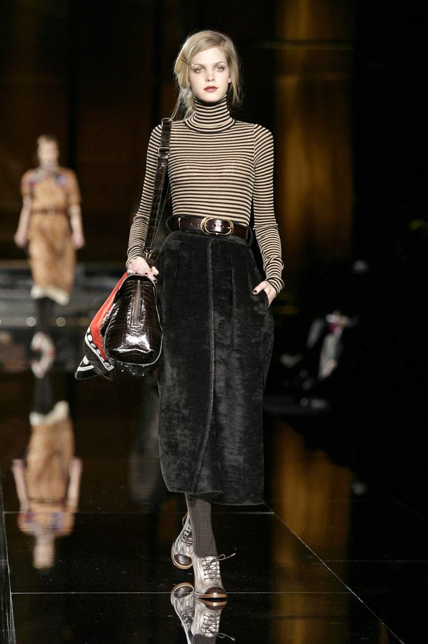 Fitted silk cashmere turtlenecks paired with voluminous skirts of menswear fabrics such as tweed, hounds-tooth and Prince of Wales.