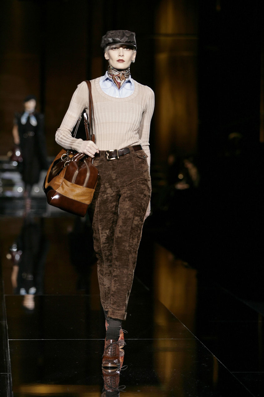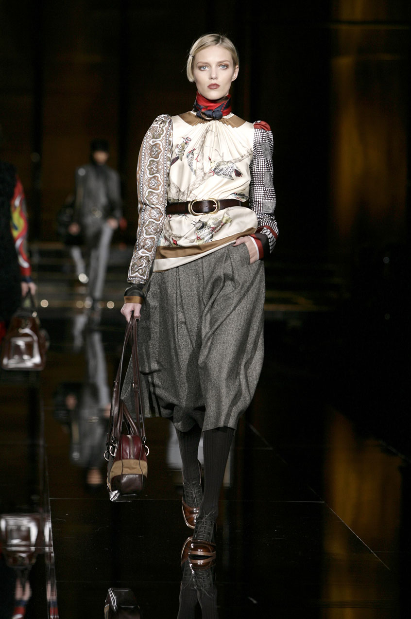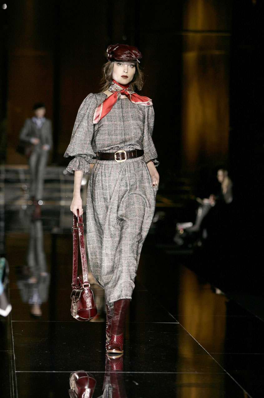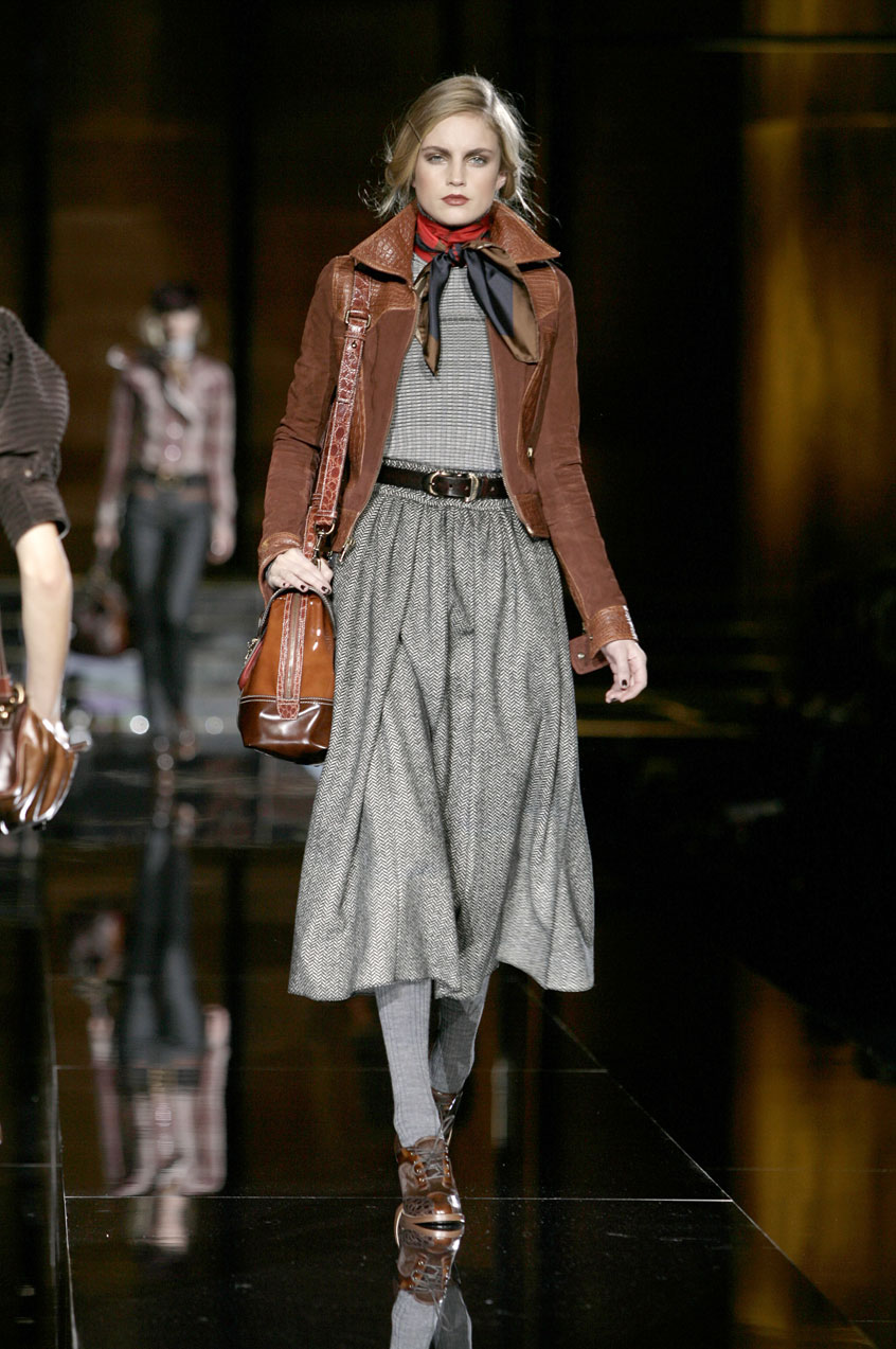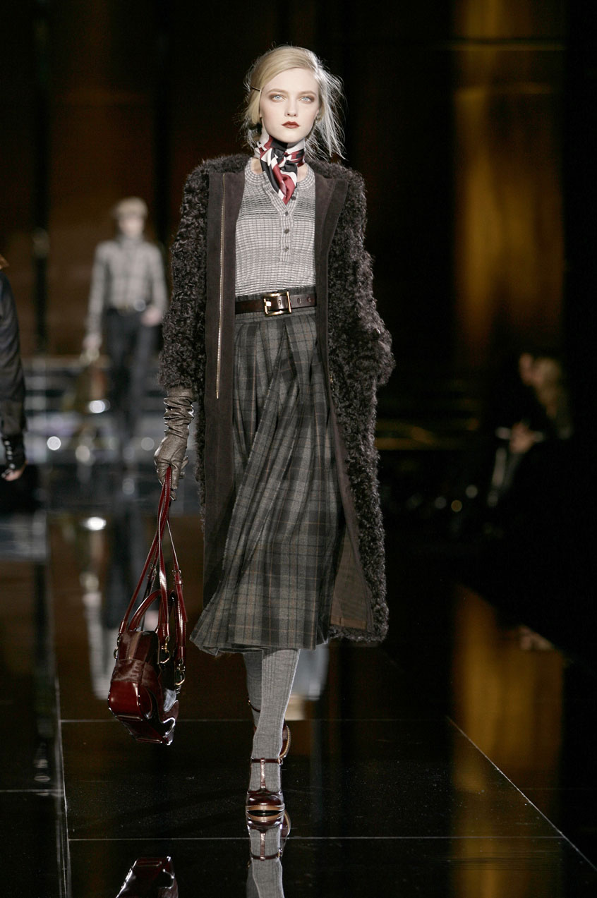 Fitted silk cashmere turtlenecks paired with voluminous skirts of menswear fabrics such as tweed, hounds-tooth and Prince of Wales.