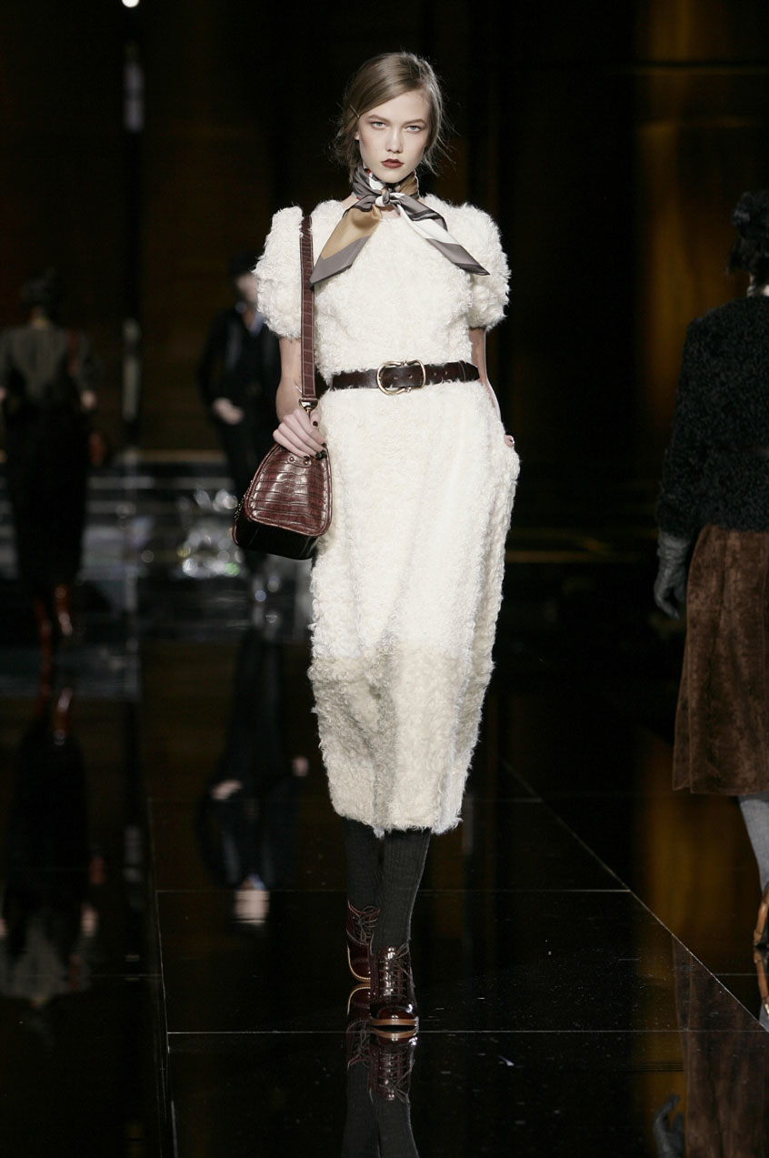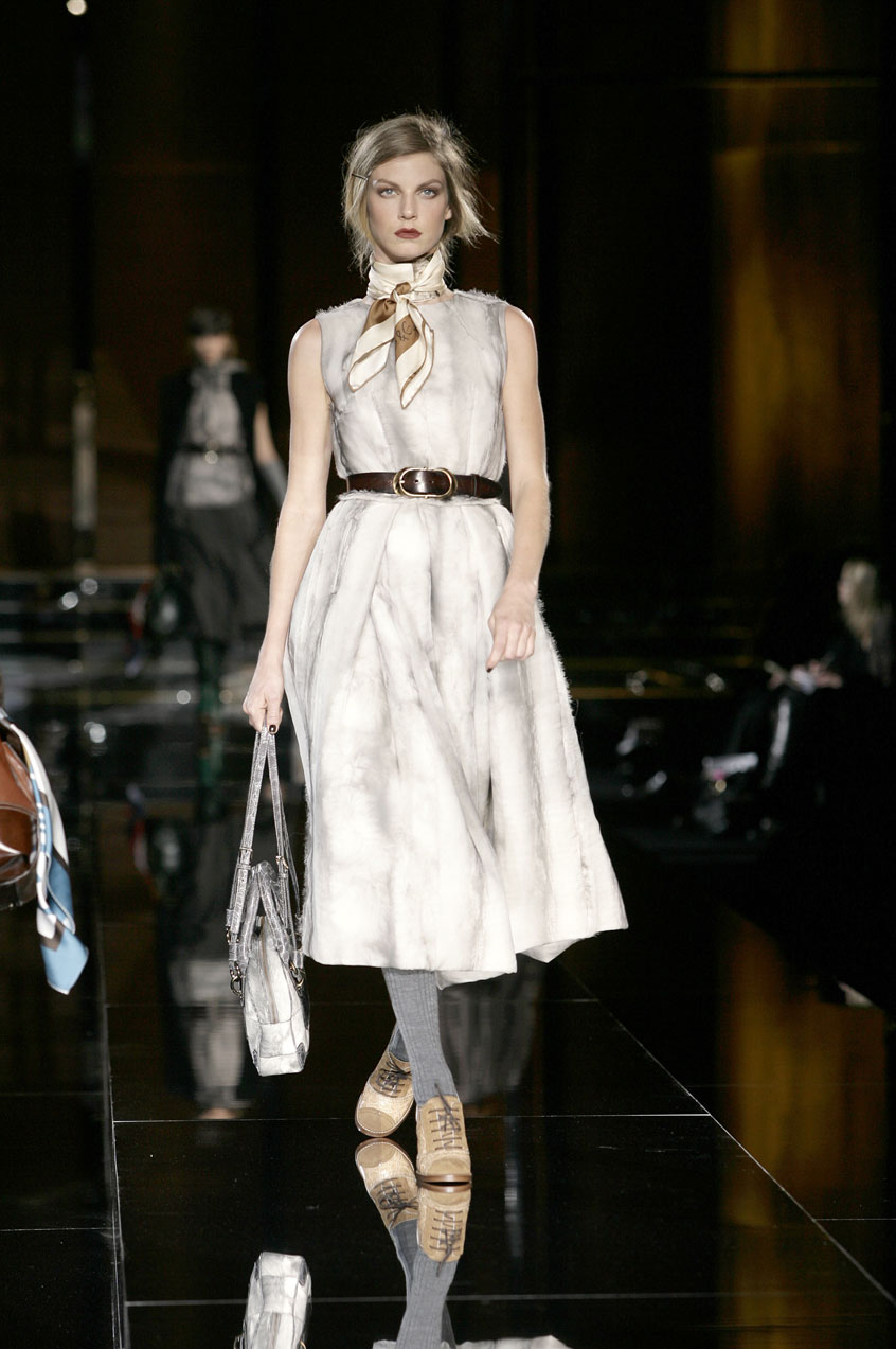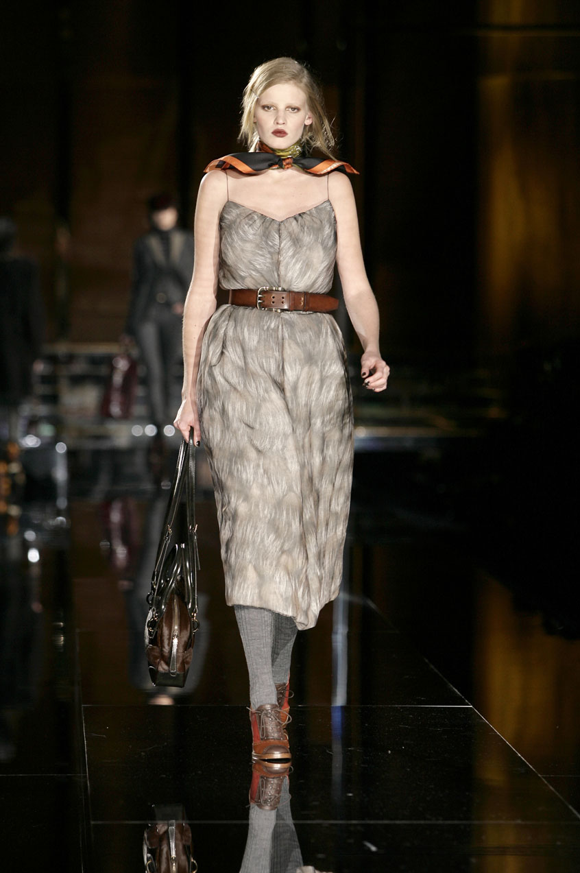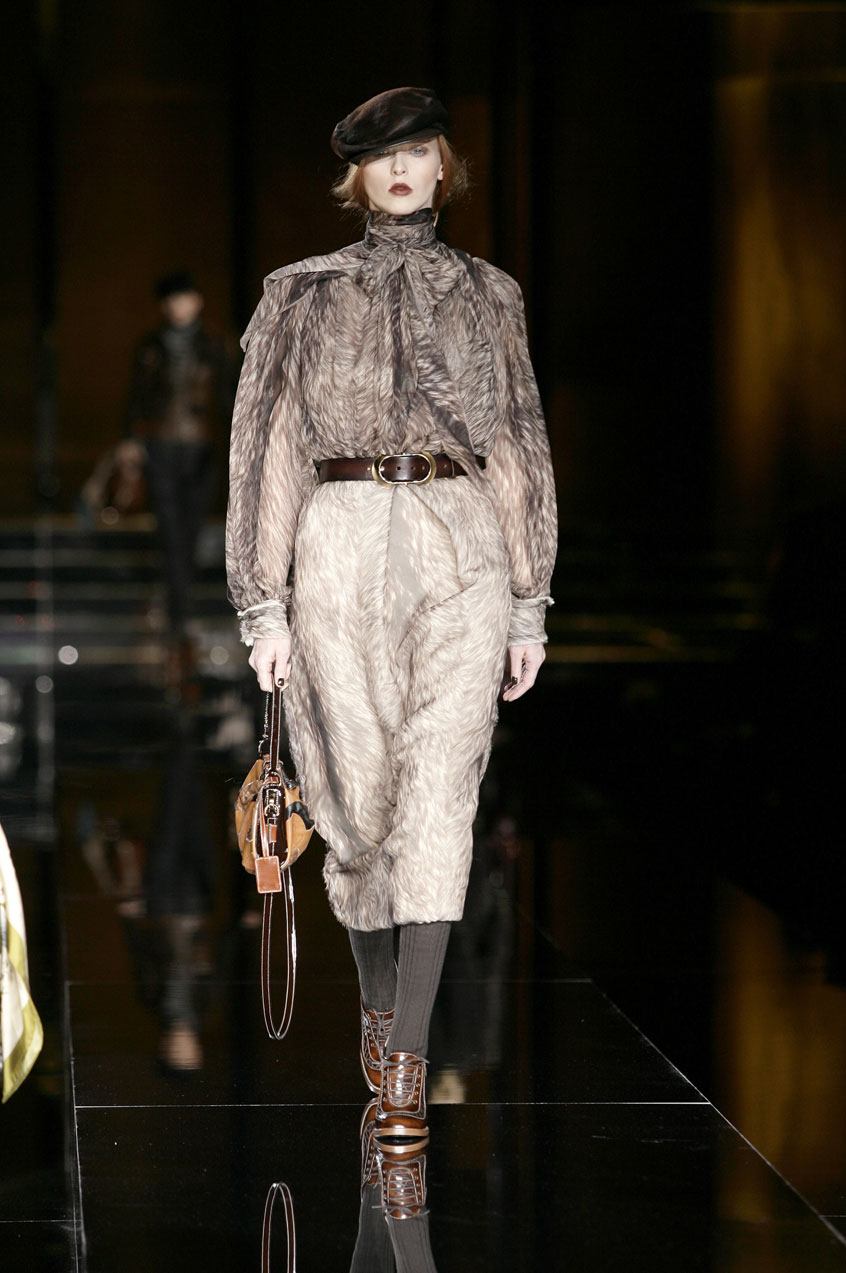 Dresses of padded, fur printed chiffon are cut and ruched at the waist. Prints resemble fox, mink or lamb. Sack dresses of velvet ribbing or herringbone, the weight of a men's coat, with voluminous shoulders, paired with leather belts at the waist.