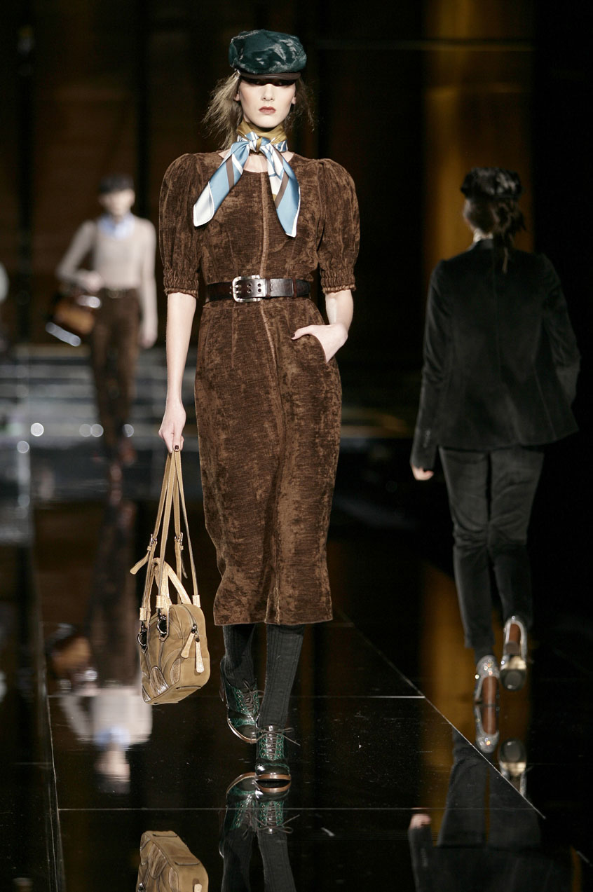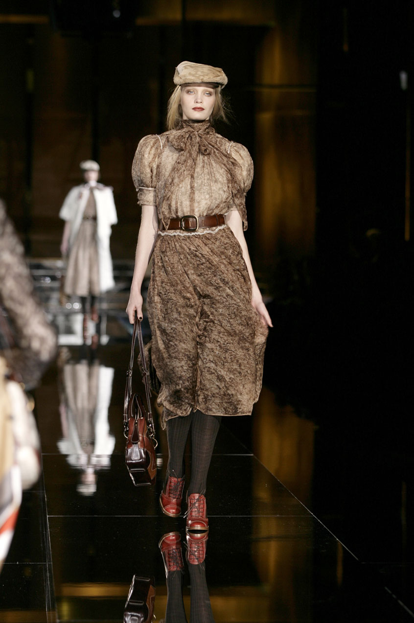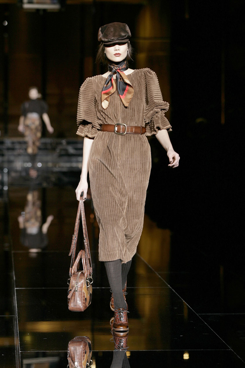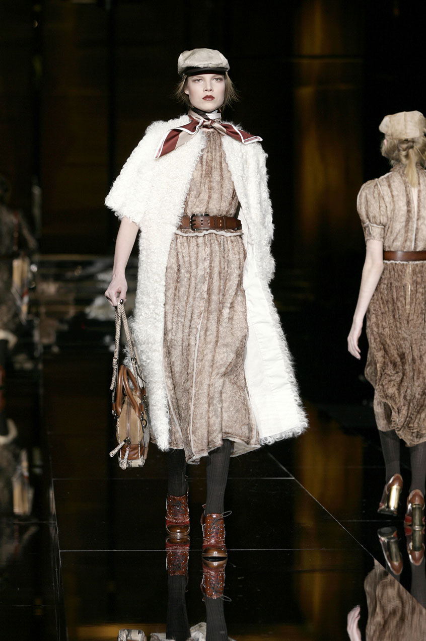 Dresses of padded, fur printed chiffon are cut and ruched at the waist. Prints resemble fox, mink or lamb. Sack dresses of velvet ribbing or herringbone, the weight of a men's coat, with voluminous shoulders, paired with leather belts at the waist.
