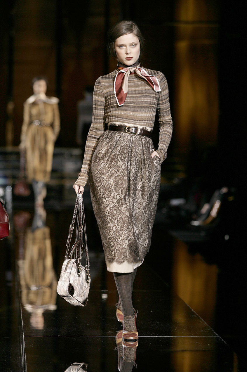 Pleated fur printed chiffon, pleated lace, lambskin, silk scarves, velvet, Chenille, tartan. Silk cashmere knitwear, leather, denim and crocodile.