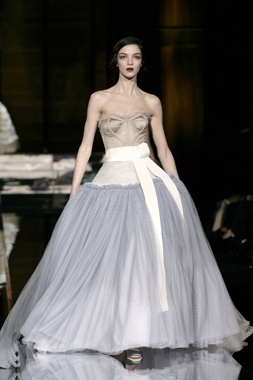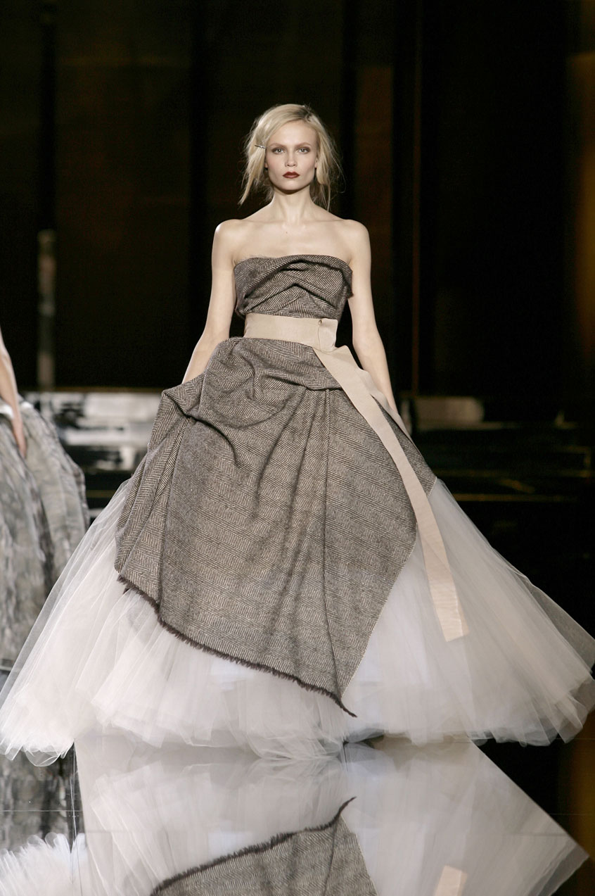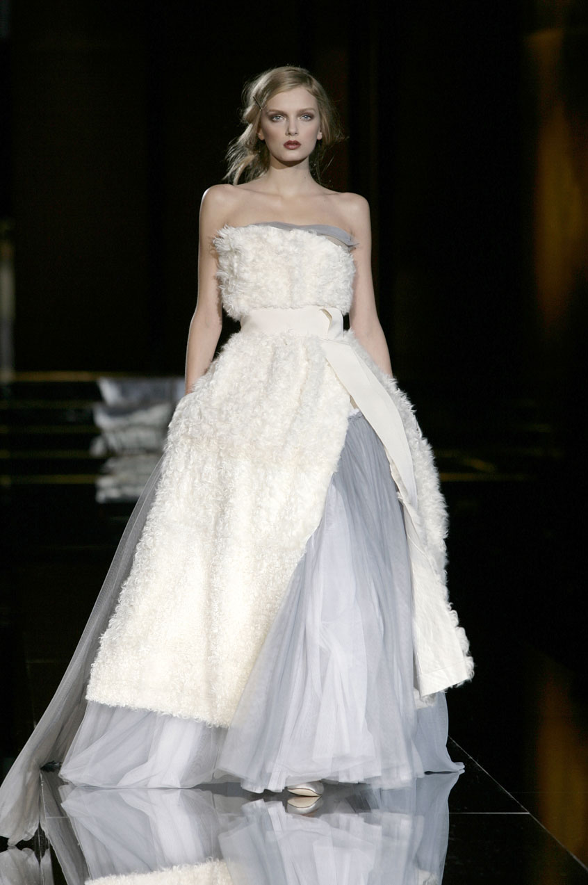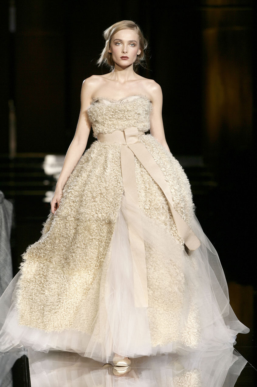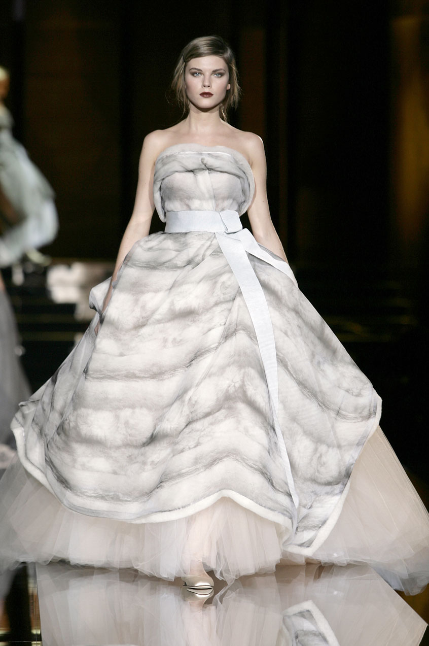 Evening dresses for finale: Tulle, satin, chiffon and “crine”(typically used to line men's jackets), bustiers paired with voluminous tulle skirts, reminiscent of a ballerina, evokes a sense of romance. Made with overlapping fur printed chiffon, lamb fur or menswear fabrics and worn with ballet satin flats.