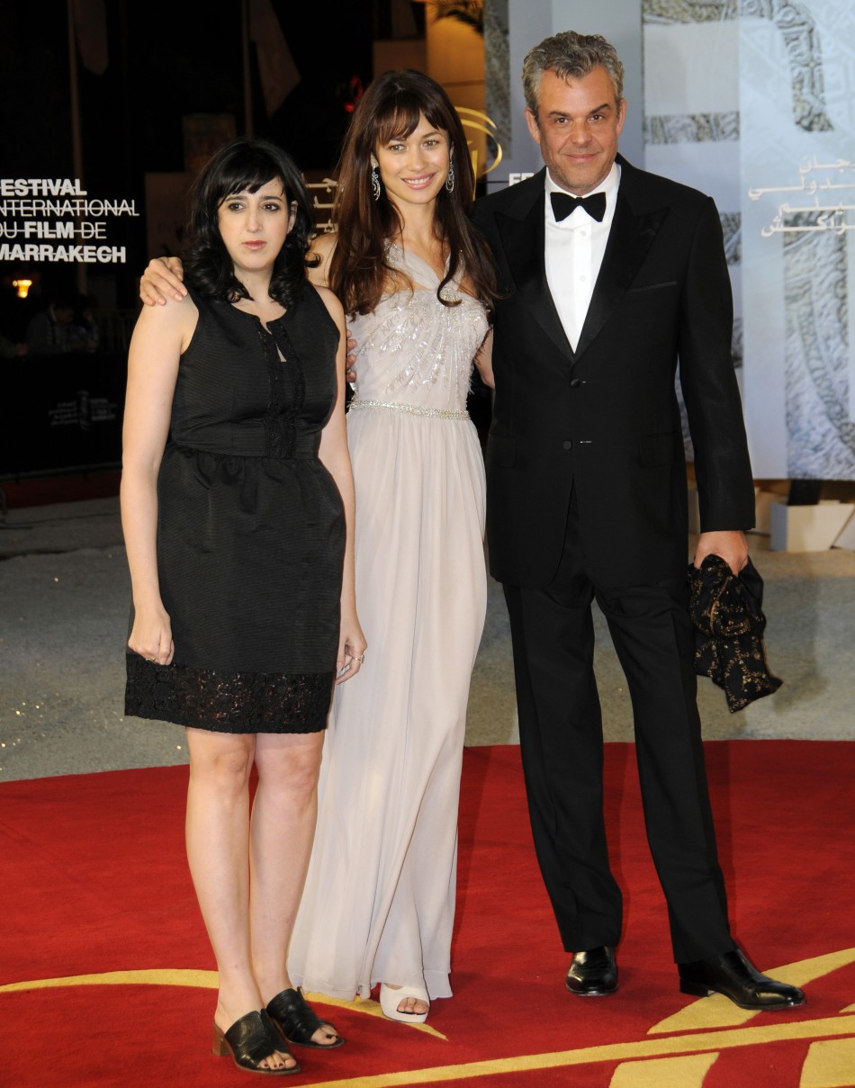 Ukrainian actress Olga Kurylenko -C- , U.S. actor Danny Huston -R- and film director Michale Boganim -L- , pose on the red carpet at the 11th International Film Festival of Marrakech (FIFM) December 3, 2011. The festival runs from December 2 to 10. Picture taken December 3, 2011.