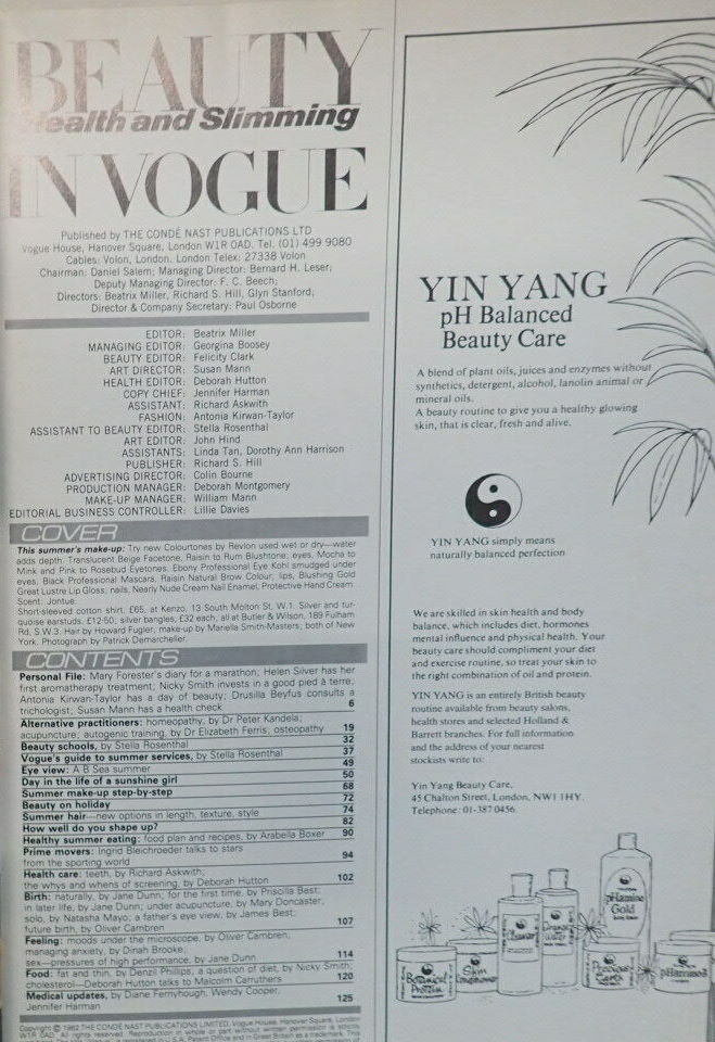 cover + contents + "END OF A PERFECT DAY" + "THE GOLD OF EVENING" - VOGUE BEAUTY Health and Slimming U.K. 1982 by Patrick Demarchellier