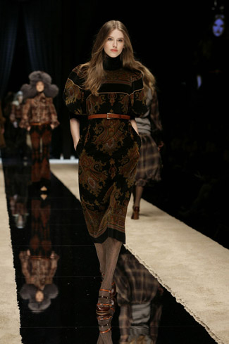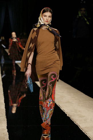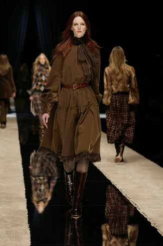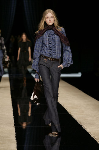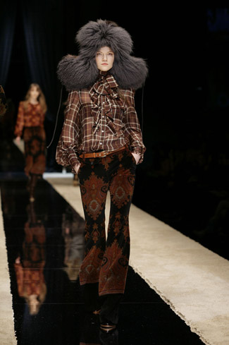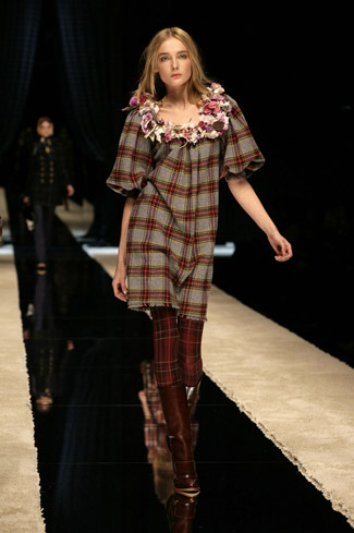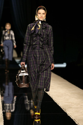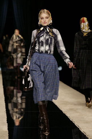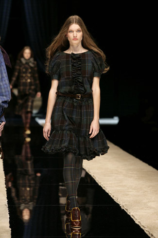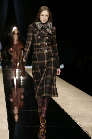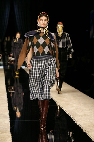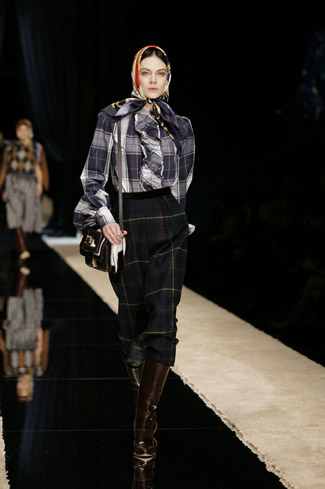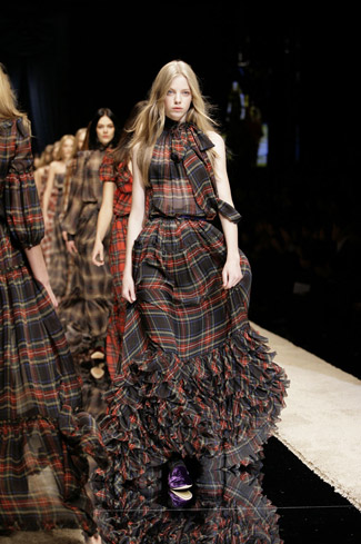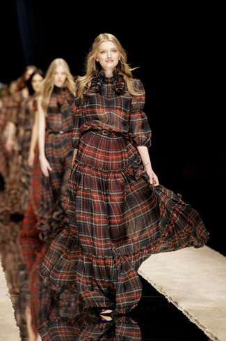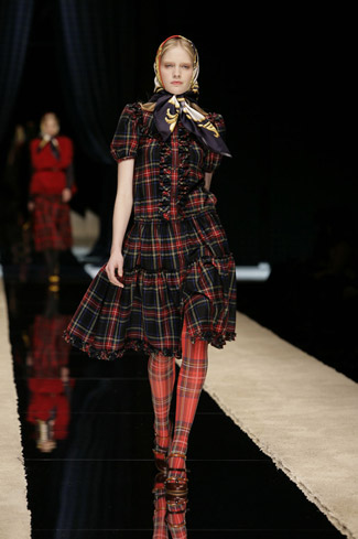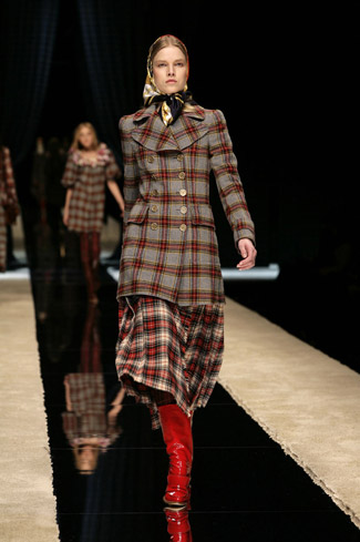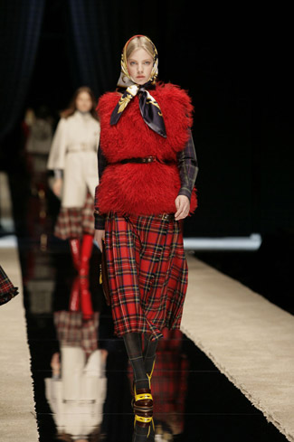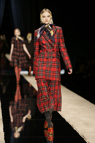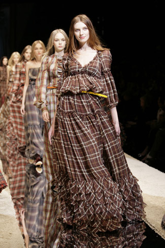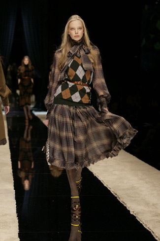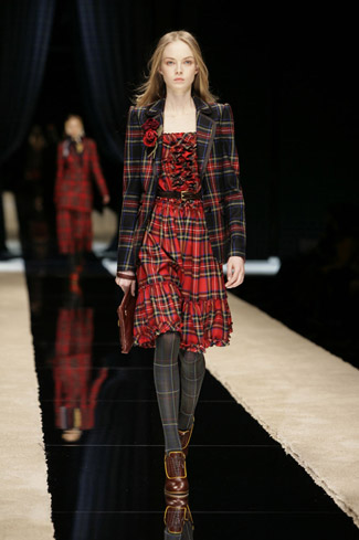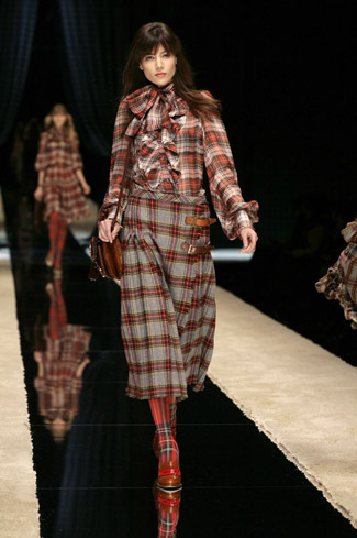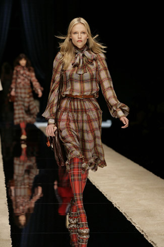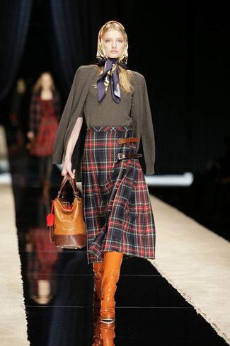 WARDROBE: Knee and calf-length kilts, long skirts and cropped blazers. Ruched dresses, relaxed tartan shirts in cotton, flannel and chiffon. Bell bottom trousers and tartan tights. Corduroy dresses and beige trench-coats. Tartan-printed chiffon gowns for the evening.