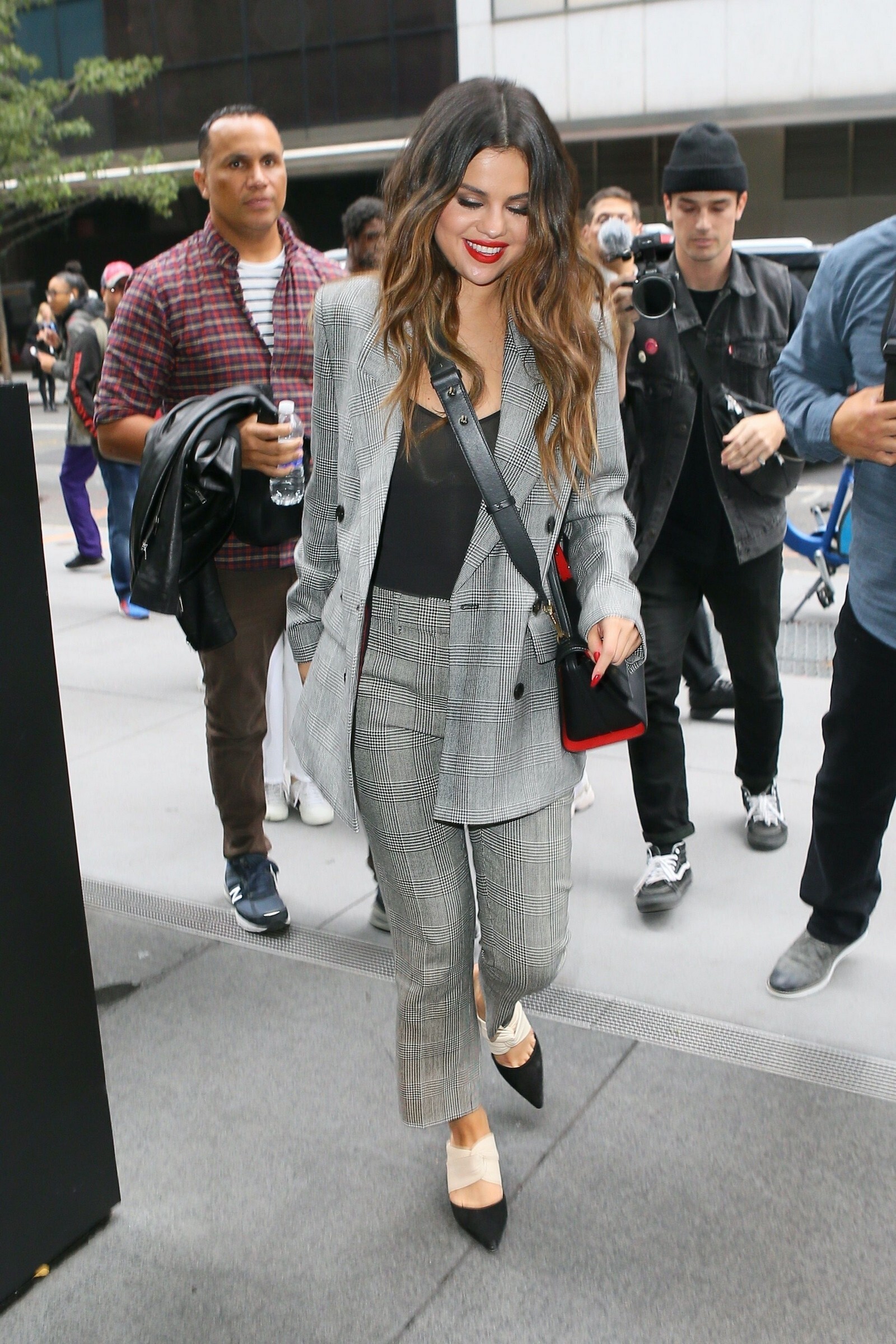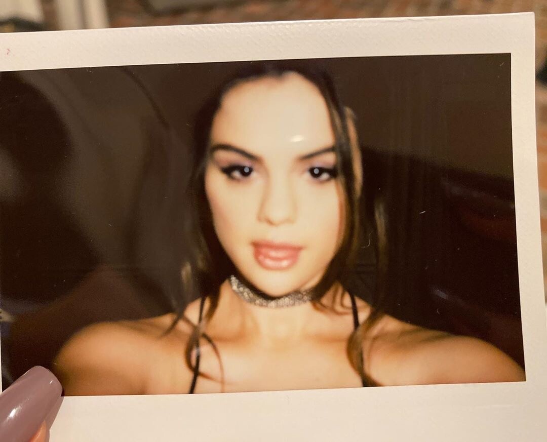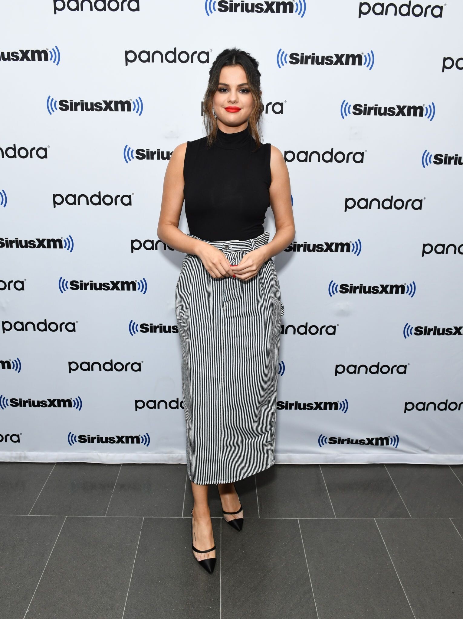 Selena Gomez in Red and White Striped Dress 24/10/2019