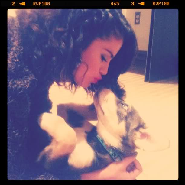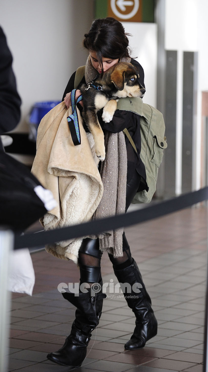 Selena Gomez tenderly totes her new puppy Baylor as she steps off her tour bus on Tuesday (October 25) in Toronto, Ontario, Canada.