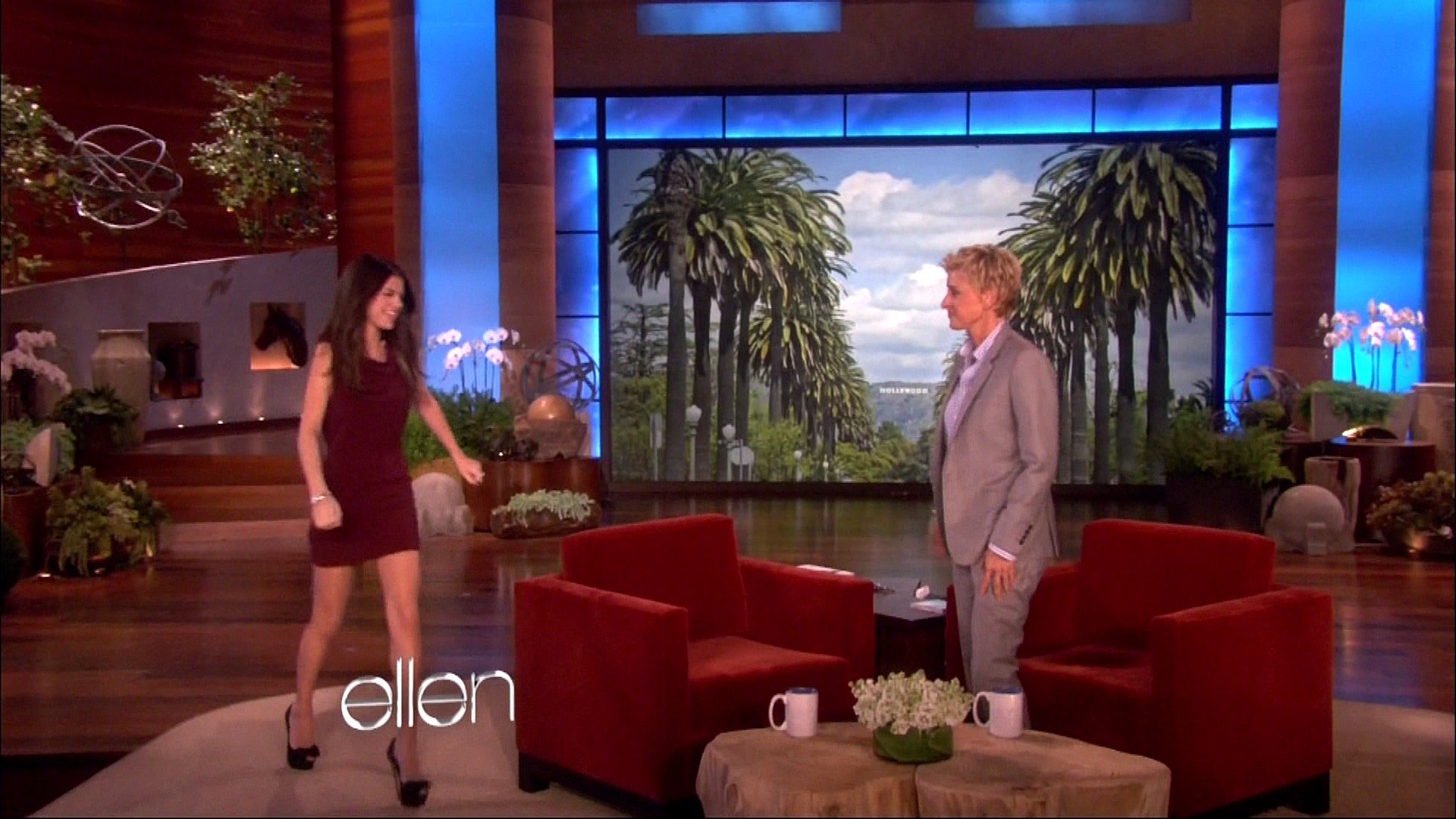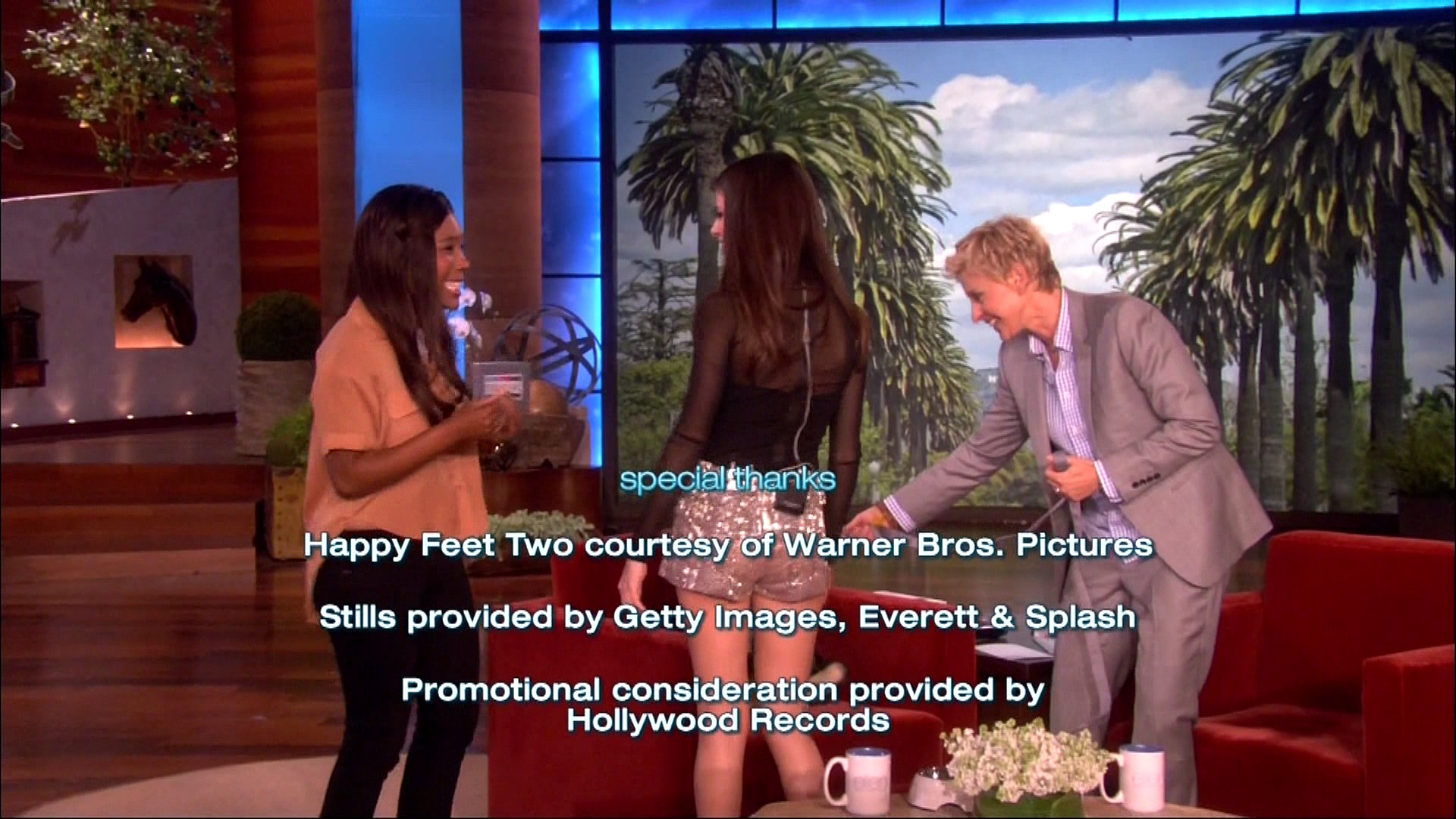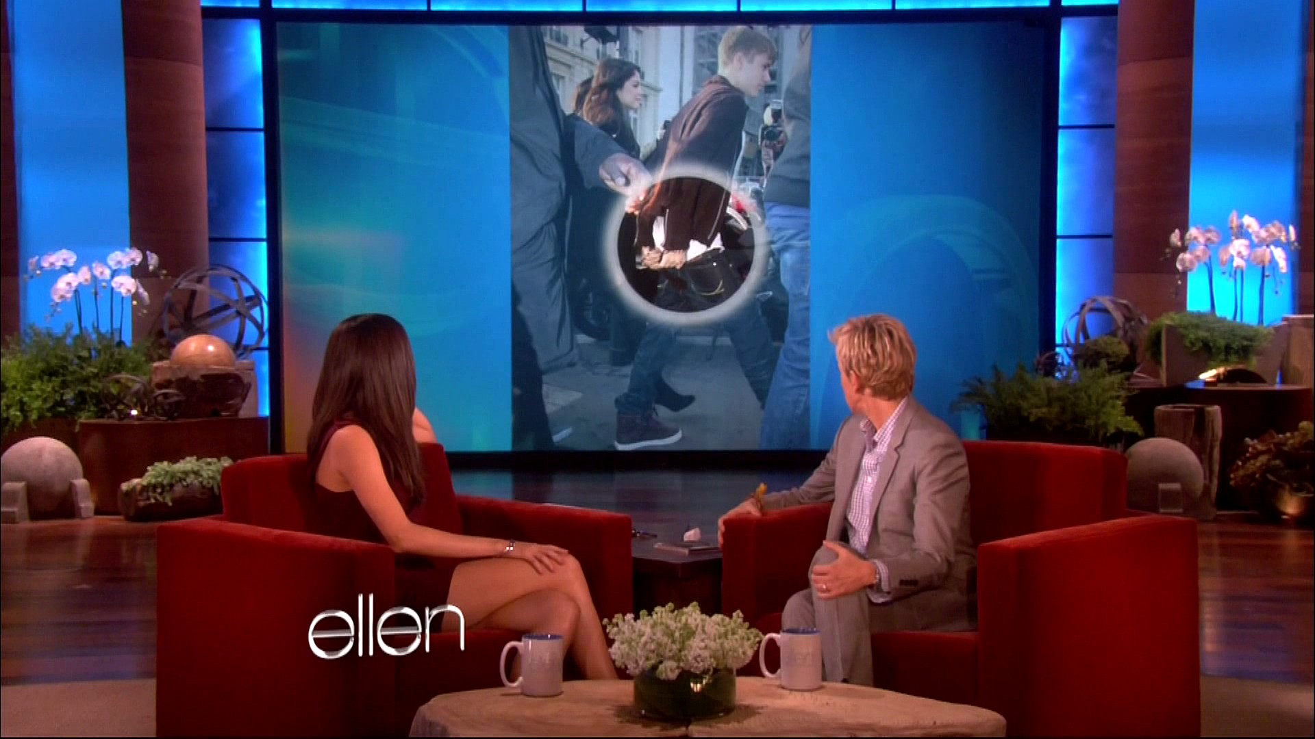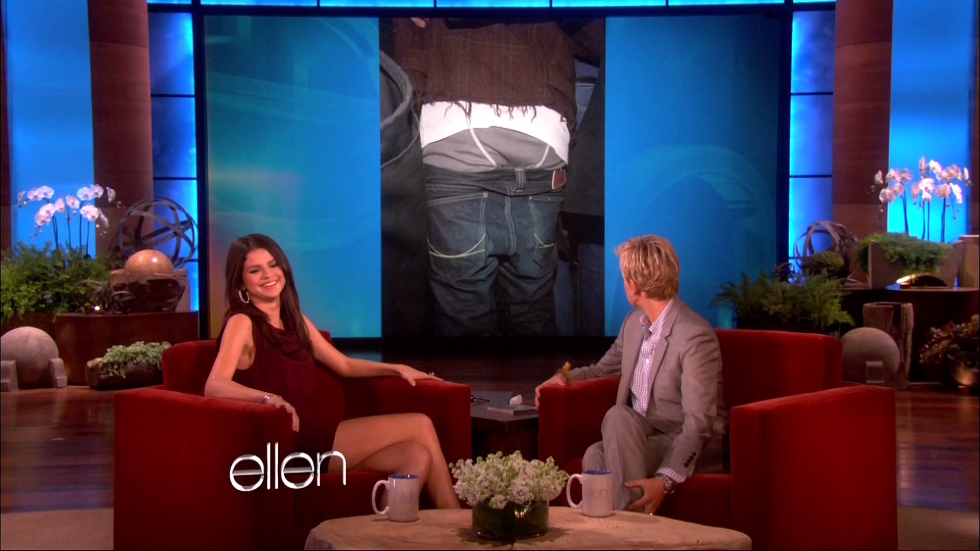 Selena also stopped by Ellen to chat with the hostess about a lot of important things — Justin Bieber’s pants.