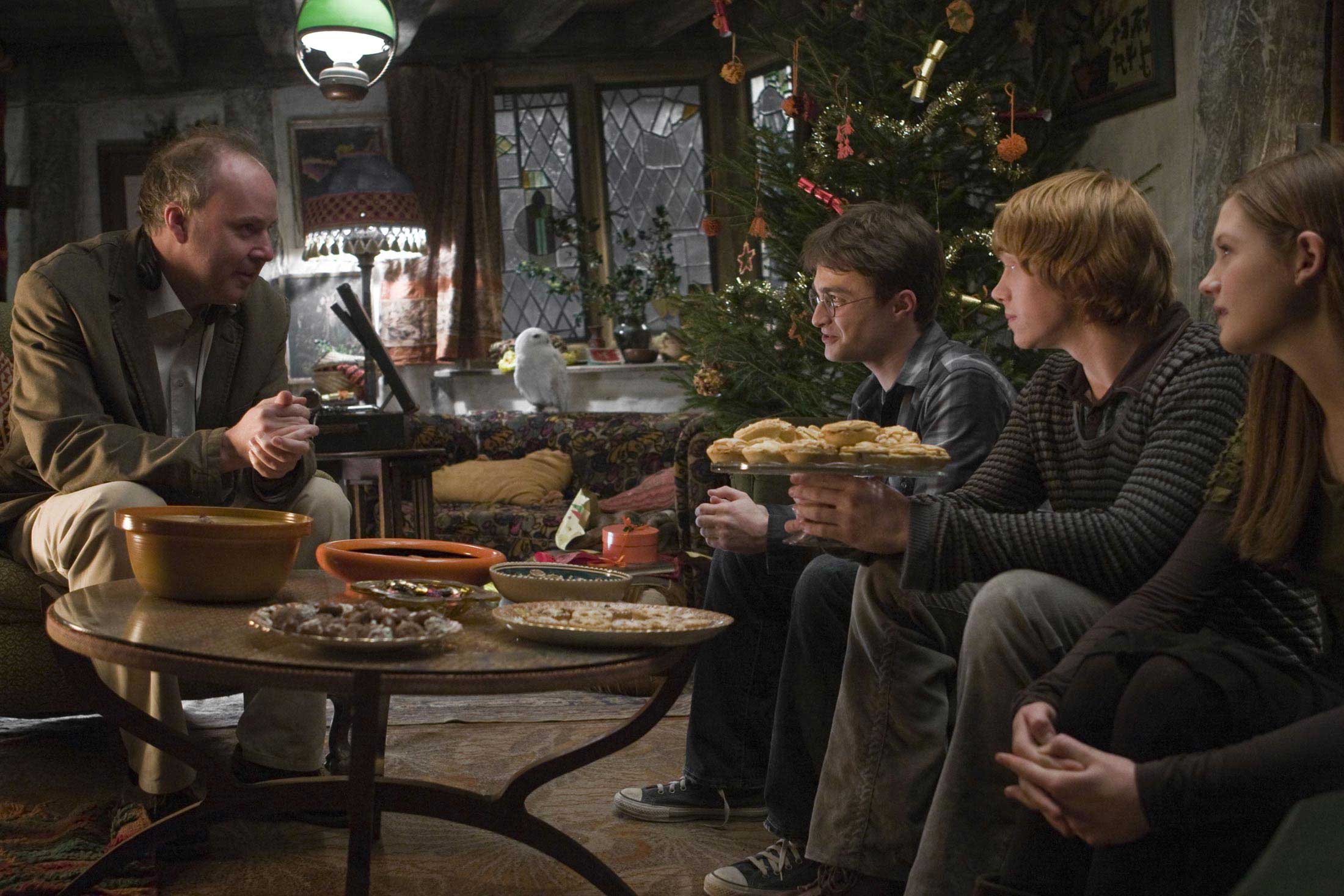 The Cave, meeting Slughorn, Harry & Dumbledore stuff, Slug Club parties, Harry arriving at the Burrow, Professor McGonagall telling Harry & Ron they can take Potions, stuff in the great hall, Dumbeldore death scene and the fight afterwards, and what some of us have been waiting for THE KISS (between Harry and Ginny).