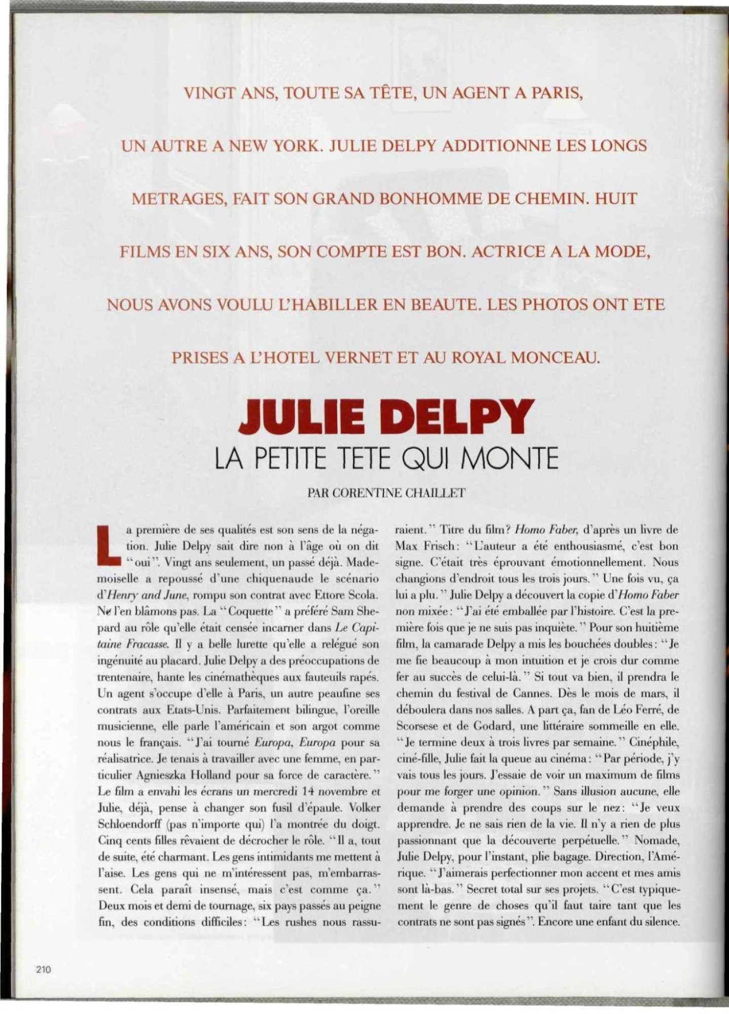 Delpy was born in Paris, France, the only child of Albert Delpy and Marie Pillet. Both her parents were actors in feature films and the avant-garde theatre, and her father was a theater director...At age fourteen Delpy obtained a role in the film Detective, directed by Jean-Luc Godard. Two years later, Delpy was cast in the title role in the film Beatrice, and used the money she earned to pay for her first trip to New York City. Delpy continued making regular trips to New York over the next few years, before finally moving there in 1990. Delpy became an international celebrity after starring in the 1991 film Europa Europa.