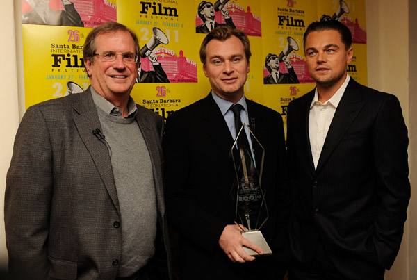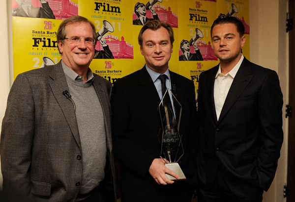 Chuck Cagara, who has so graciously donated his photographic talents to my blog for the last three Film Fests sent this message along with his nightly feed of photos: "Craig, while you were at the Lobero Sunday night, (see below) I was elbowing squealing adolescent girls who were anxious to get a look at their heart throb, Leonardo DiCaprio who presented the "Modern Master Award" to Christopher Nolan.