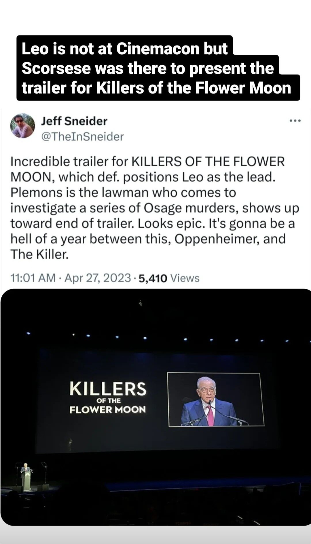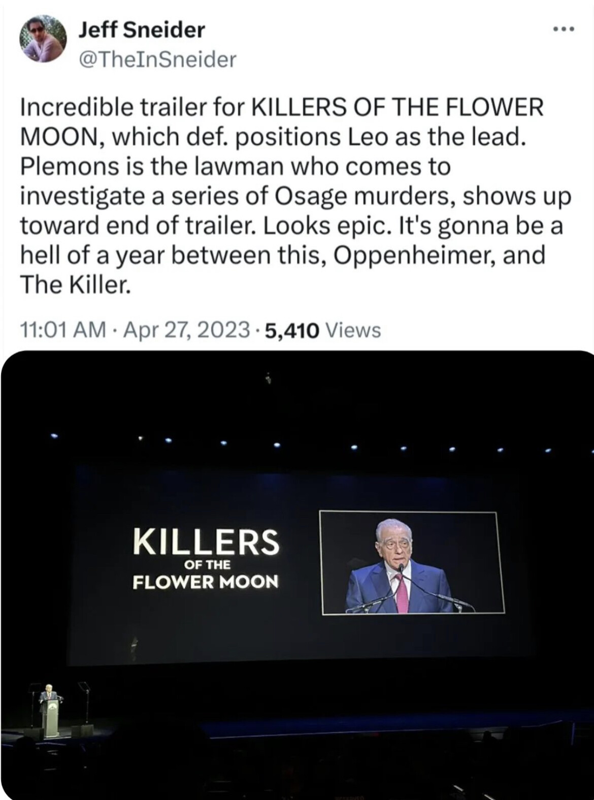 The “greatest living director” shared the first trailer for the film at CinemaCon, the annual conference of theater owners that’s been taking place this week. Based on David Grann’s bestselling book, “Killers of the Flower Moon” is a true story, one that pulls back the curtain on a series of murders of wealthy Osage people that took place in the early 1920s after major oil deposits were discovered on their land. It also looks at how the newly formed FBI investigated the killings.