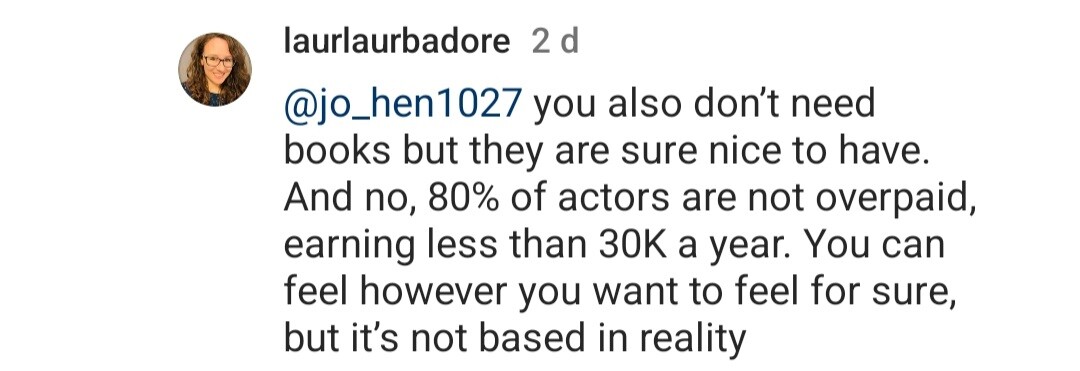 1 hour ago, Jade Bahr said:It's not only writers who doesn't earn enough. It's almost everyone not only in movie business. So called overpaid "A list" actors like Leo who earn millions are a 1% minority only existing in Hollywood.