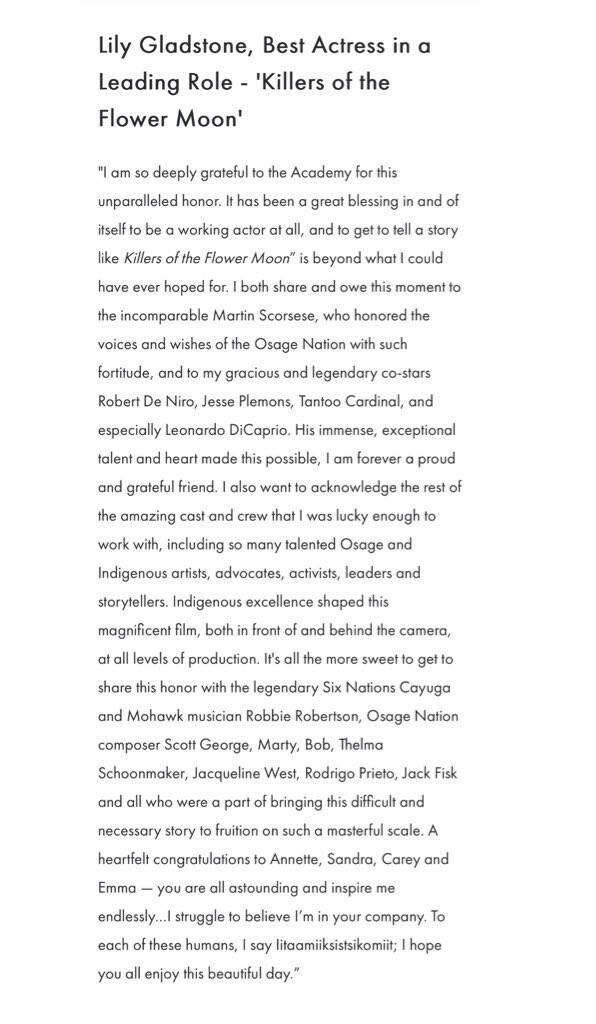 Or maybe it’s something else. DiCaprio, after all, was finally given the prize once he went as far as it’s possible to go on a film set, and then told us about it, and told us about it. But this is the same performer who skipped the ceremony when the film he was in had made him the biggest actor on earth, and won best picture; he’s the same performer who’s used each of his glancingly rare media opportunities, this time around, to talk about how special a scene partner Lily Gladstone is. (And Gladstone now appears likely to win best actress.)