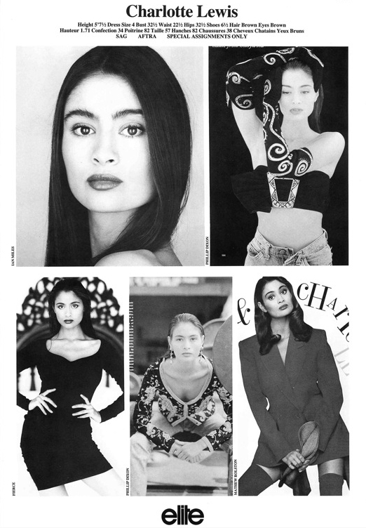 Charlotte Lewis, model ("Special Assignments Only") and actress (Serie B films, principally), English, from Irish mother and Iraqi-Chilean father. Peter Lindbergh became infatuated with her: gave her the autumn/winter 1986/87 campaign of Mariella Burani and an editorial in Vogue Italia (February 1986) inspired by the indie film Stranger Than Paradise (Jim Jarmusch, 1984).