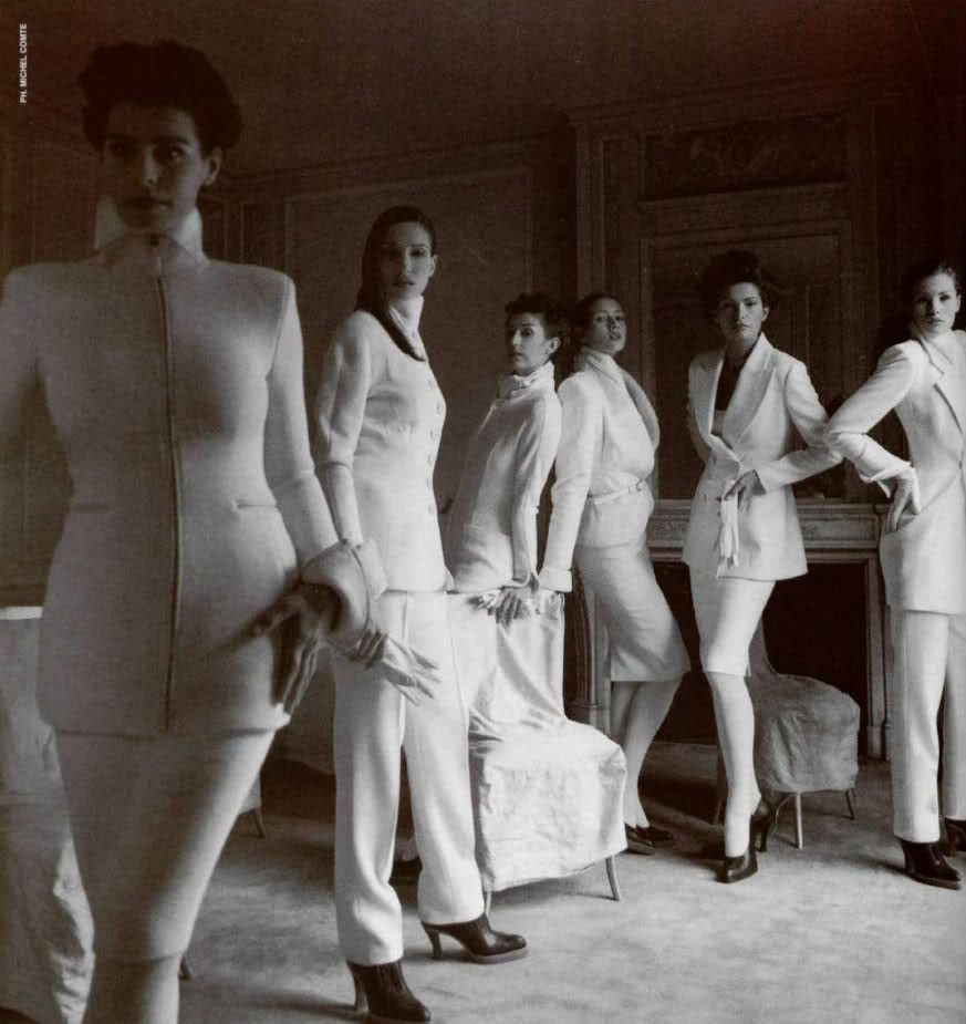 YSL Ready-to-wear FW'87/88 campaign: Katoucha Niane, Amalia Vairelli (suit jacket pink), Hedia Vairelli? (behind, with swan neck jersey; sister of Amalia), Cordula Reyer, Alda Balestra? (I'm not sure, if anyone can help me to identify her...) and Khadija Adam (medium close-up). Photo: Helmut Newton.