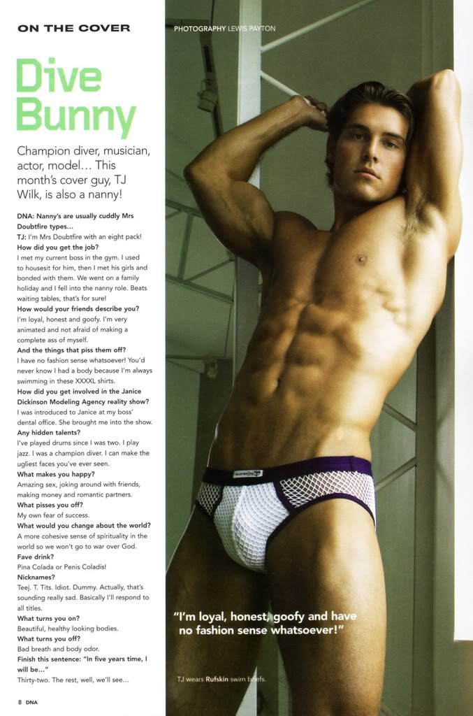 Ths hotie is a 27-year-old male model from Cleveland, Ohio. TJ was "discovered" on season one of Oxygen's “The Janice Dickinson Modeling Agency " reality show. He was the nanny to three girls and lived in the guest house on the family's property until he was chosen by Janice to be one of her top three models. He has also appeared as cover model for DNA, Out Traveler, and many other fashion ads including Speedos' 2007 swimwear campaign. TJ currently resides in Beverly Hills; and is also a champion diver, musician, and actor.