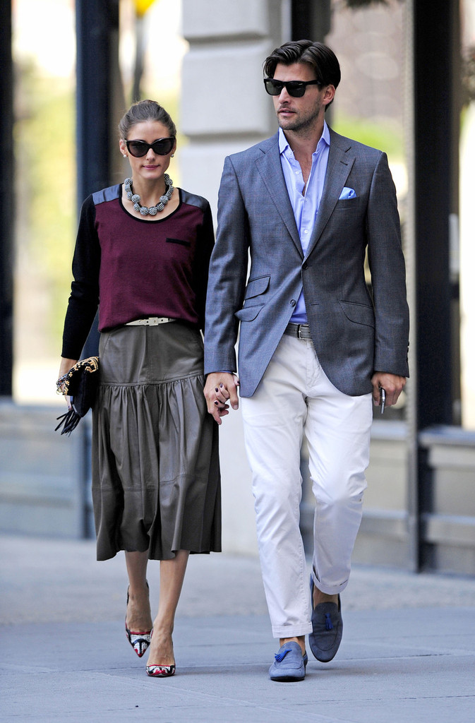 Actress Olivia Palermo casually goes for a walk in New York City where the star showed off her summer style in a white button up shirt paired with a white skirt and flats.