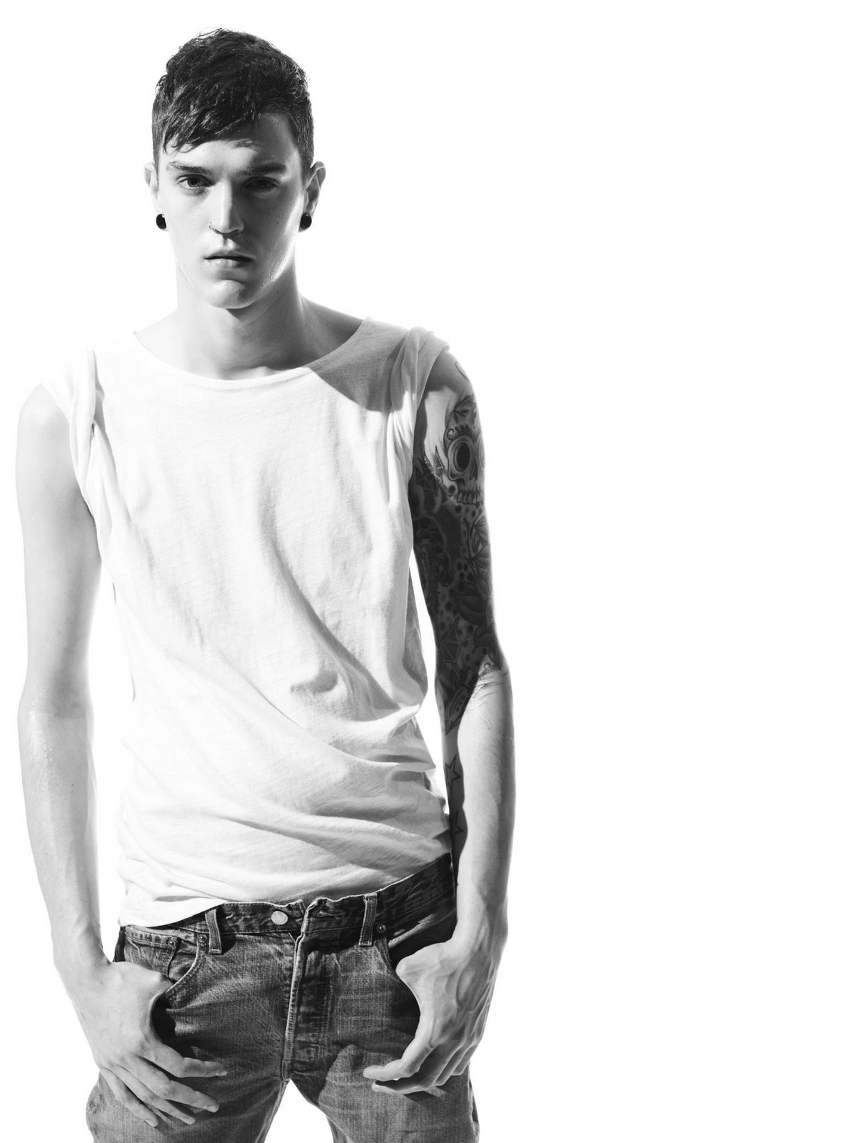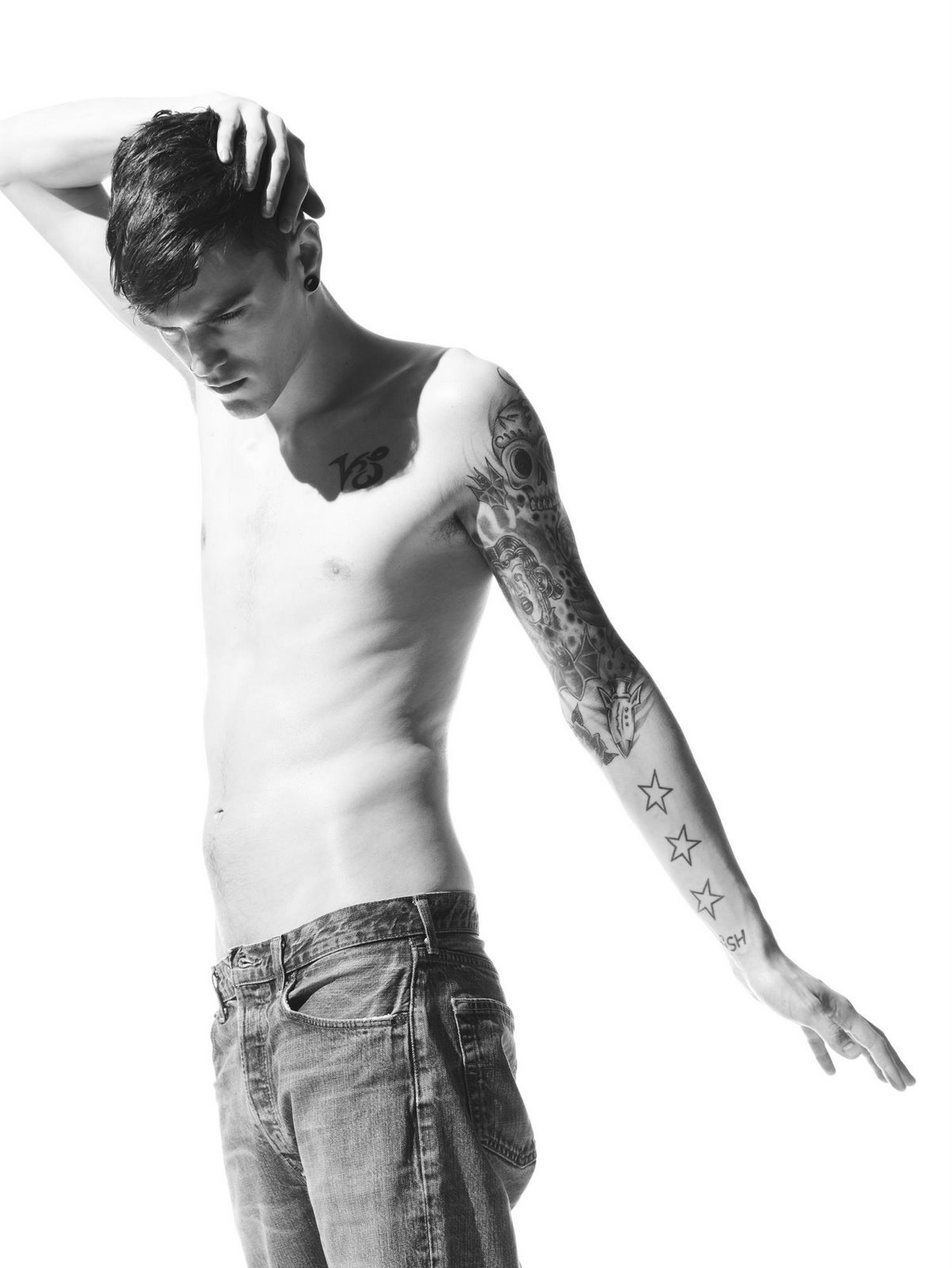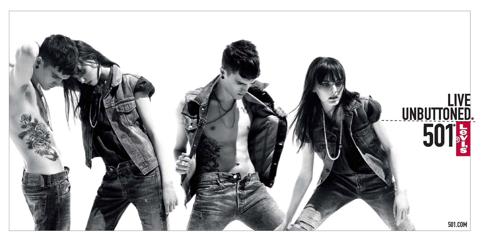 Under his direction, the prints for the campaign are effortlessly sensual shots of Josh Beech, charismatic 22-year-old lead singer of British alternative rock band, Snish. Shot by New York-based photographer David Vasiljevic, the campaign is a composite of striking, stripped down black-and-white portraits of Josh Beech. He is pictured wearing 501® jeans and a tee, or with just intricate tattoo work – the name of his band on a wrist, a pair of eyes on the neck, and three stars on the forearm – on his naked skin