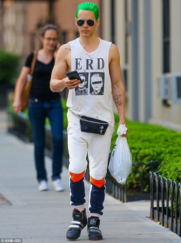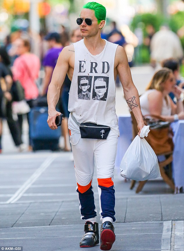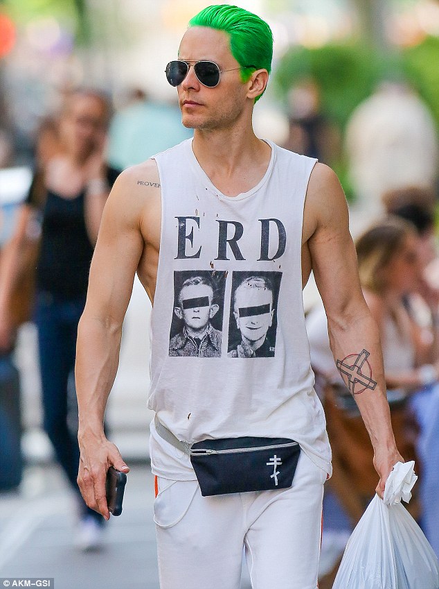 Jared Leto had his green hair and bulging biceps on display on Tuesday while running errands in New York City.