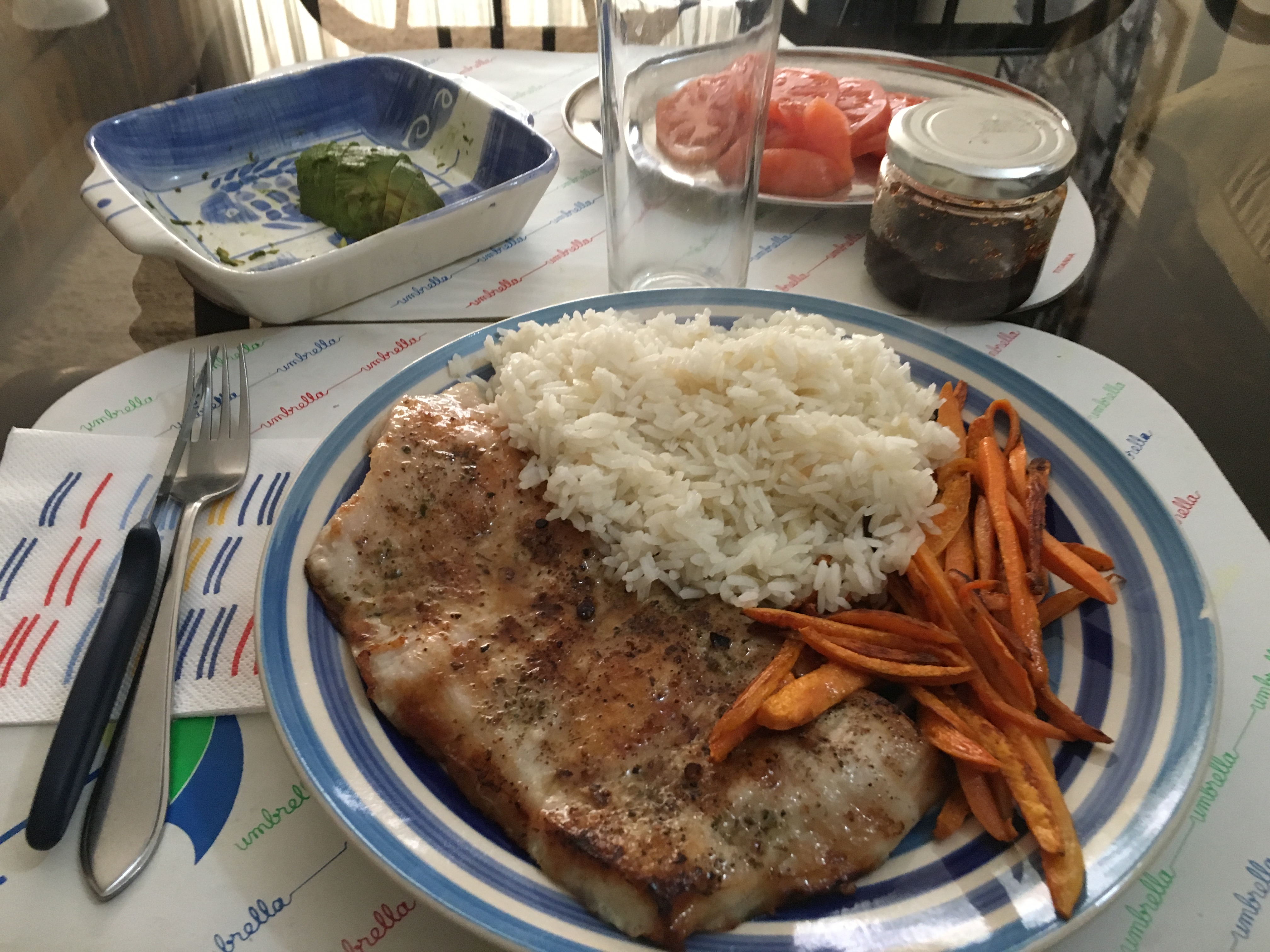I served it with rice and carrots, plus a tomato and half an avocado that can be seen back there.
