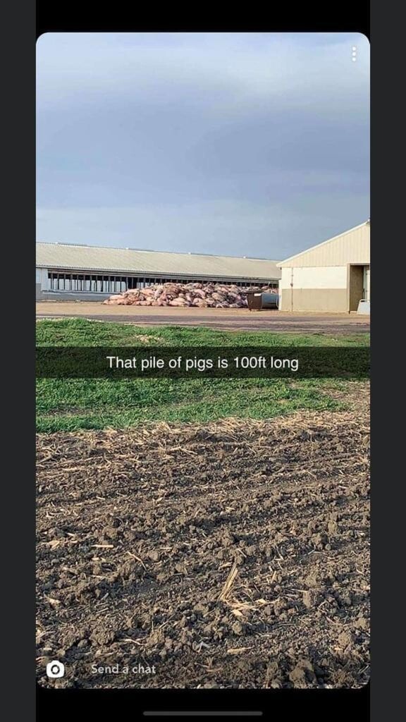 This is what it’s starting to look outside by the hog barns. Nobody wants to show up and work at the meatpacking plants or hog processing plants or chicken plants. After workers are getting sick.