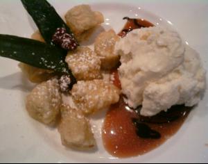 The wondrous finale to an awesome meal at a Japanese restaurant - tempura banana with vanilla bean ice cream and caramel sauce dusted with powdered sugar.