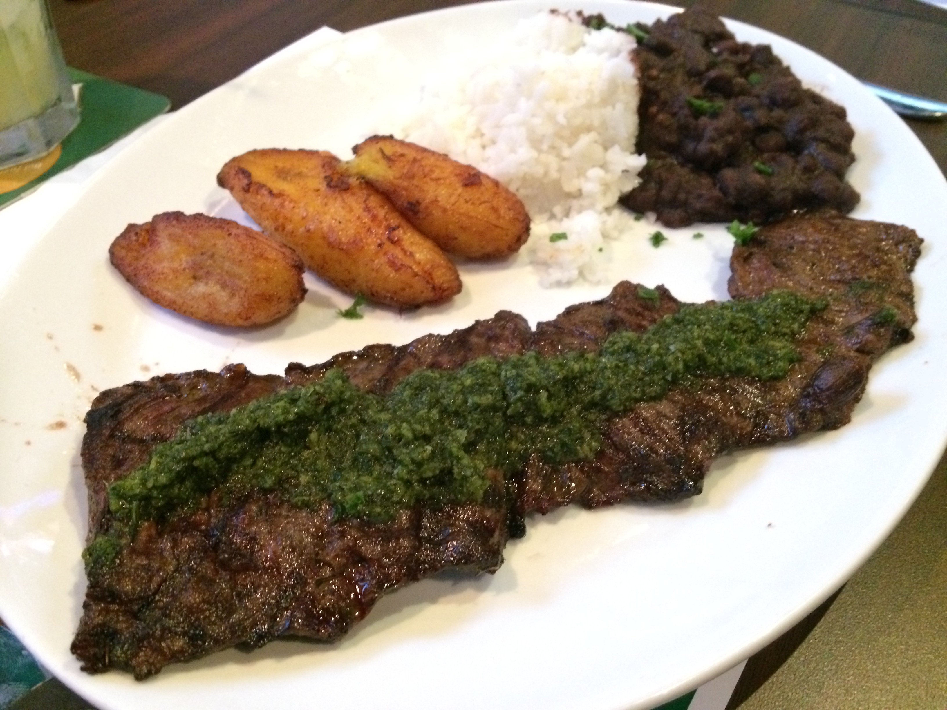 Argentinian Chimichurri steak (rare) with black beans, rice, and fried plaintains